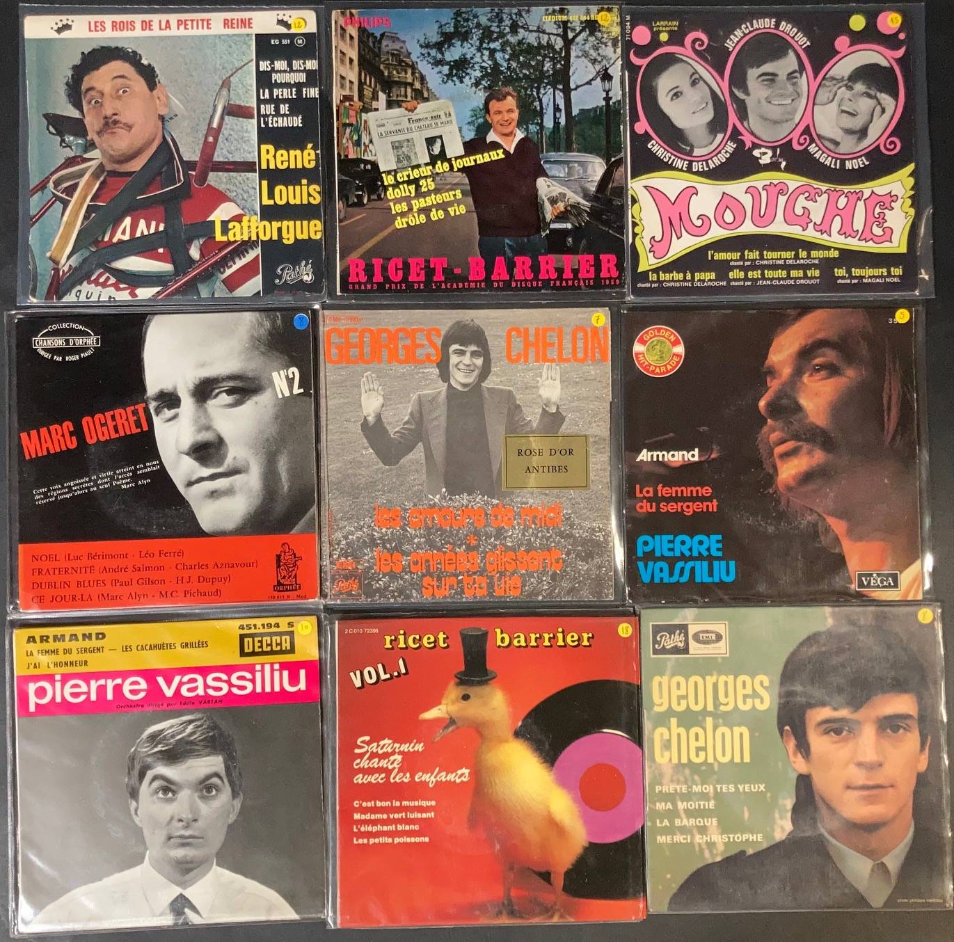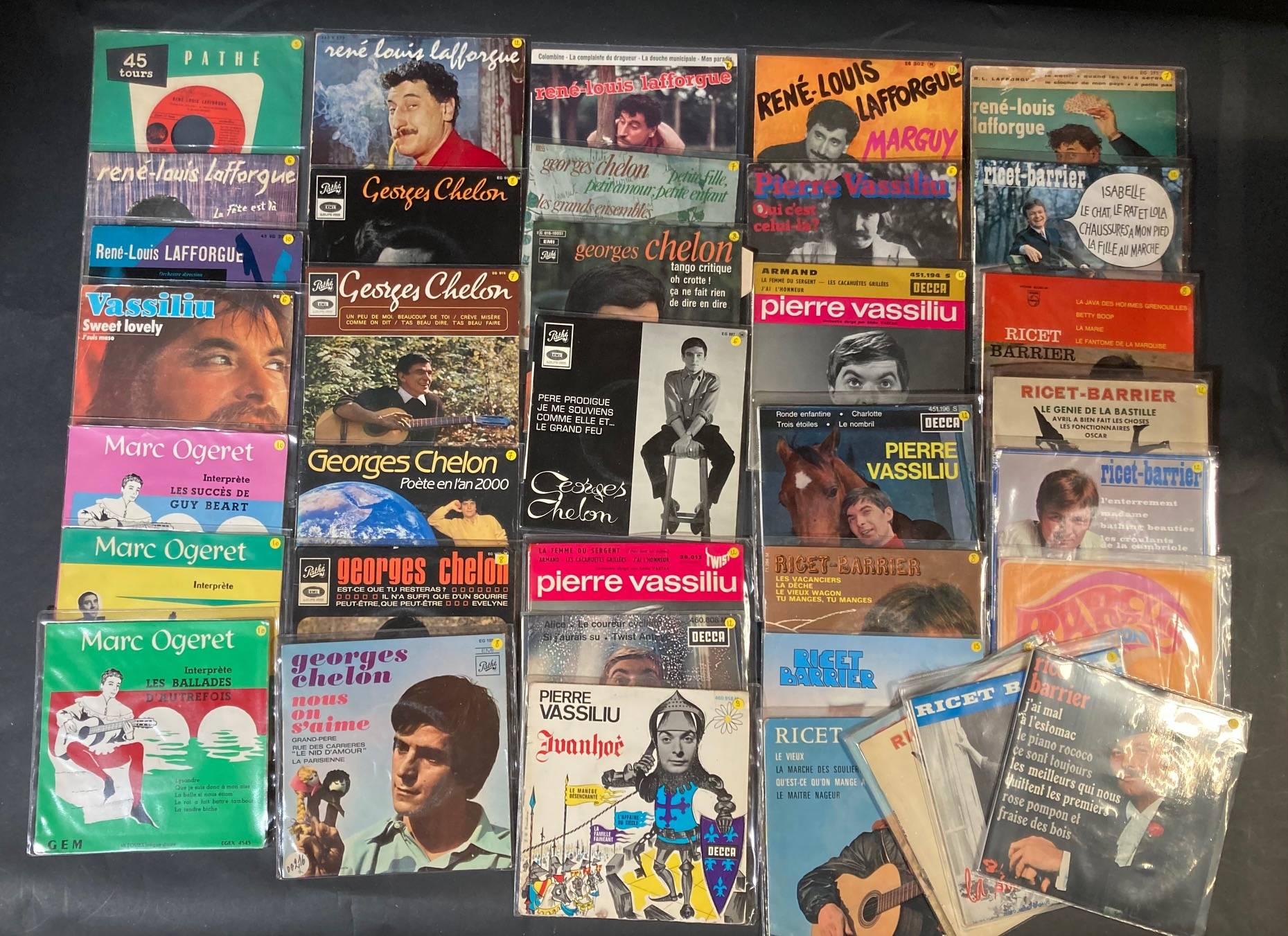 Lot de 46, 45 tours de divers chanteurs de variété Française : RICET-BARRIER, Georges CHELON, Pierre VASSILIU, Mar OGERET, MOUCHE, LAFFORGUE...