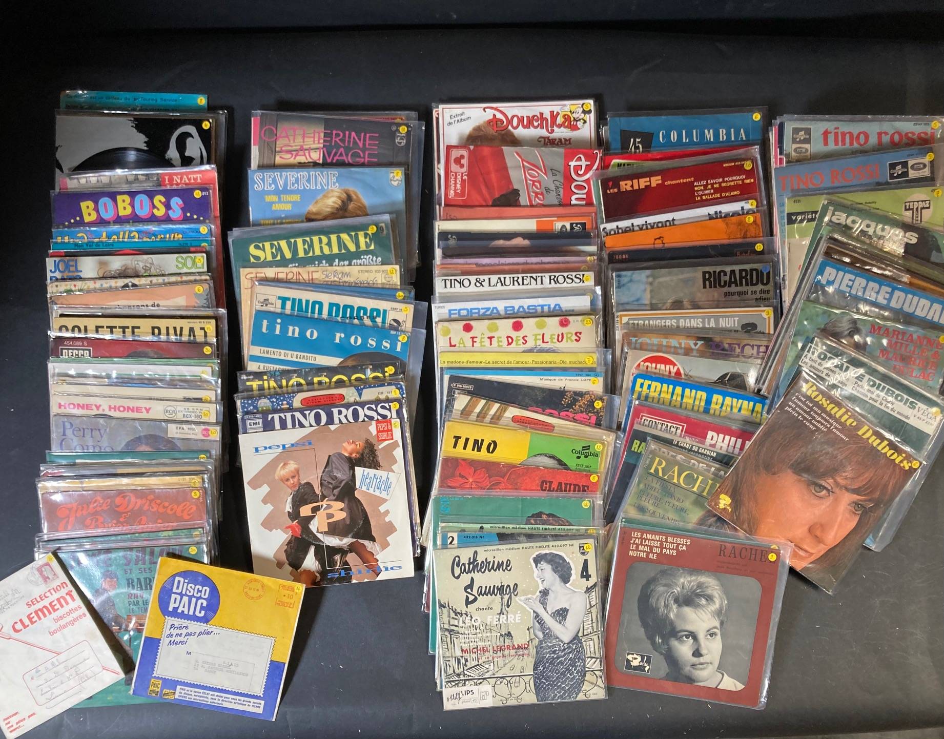 Ensemble de 153 x 45 tours de divers artistes... SEVERINE, Les SIPOLO, HOOTENANNY SINGERS, José SALCY, CHER, Musiques de cirque, Important lot de Tino ROSSI...