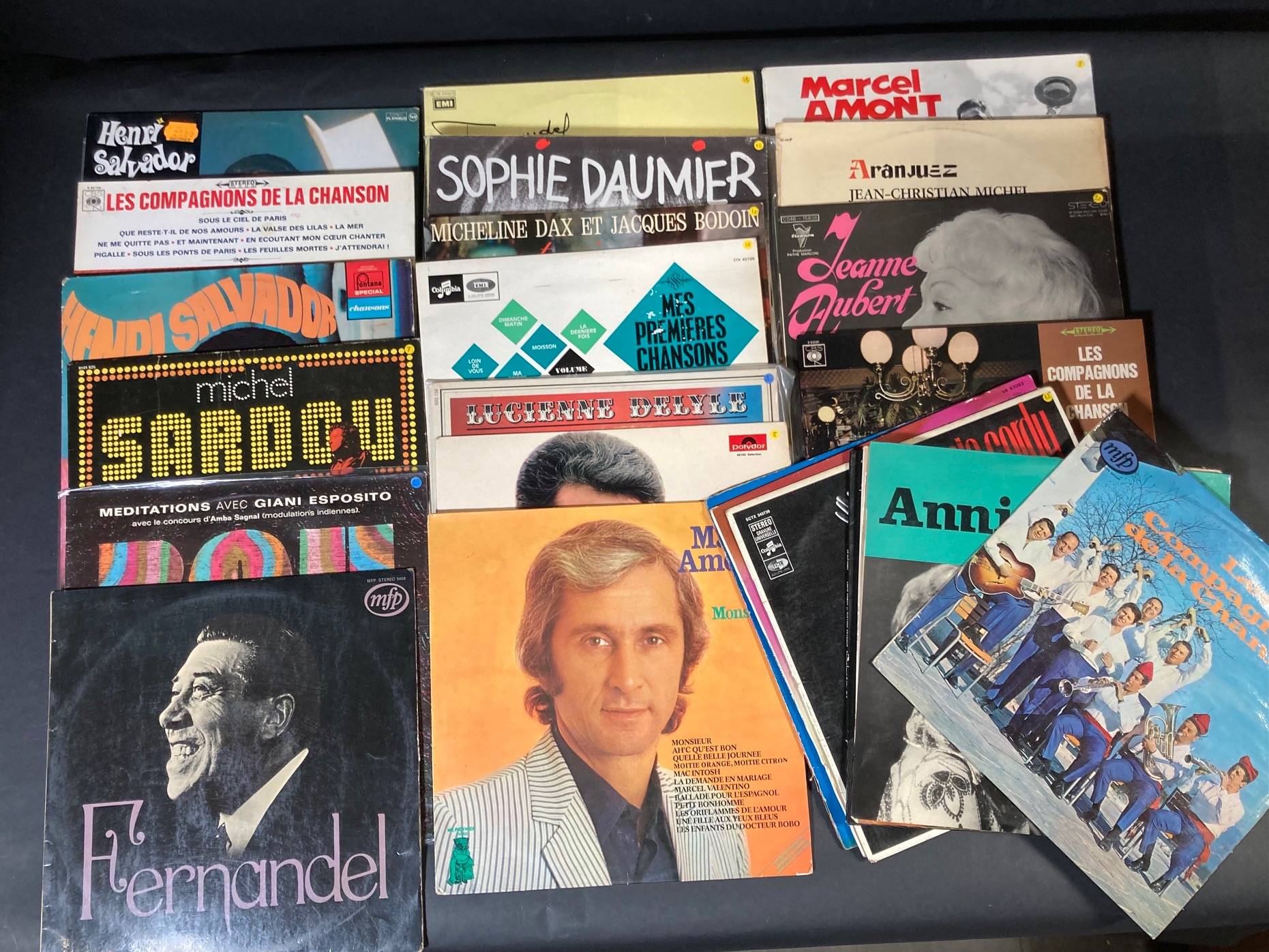 Lot de 67, 33 tours de divers artistes de Variété Française: FERNANDEL, Line RENAUD, Marcel AMONT, Tino ROSSI, Michel SARDOU, Les COMPAGNONS...
