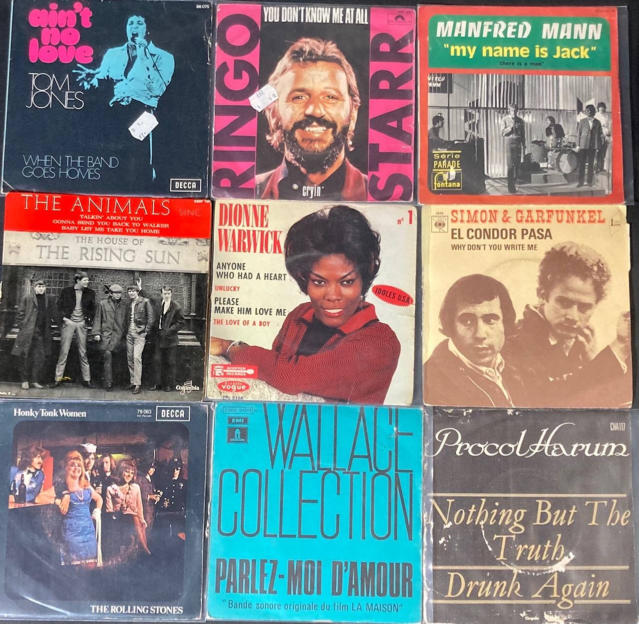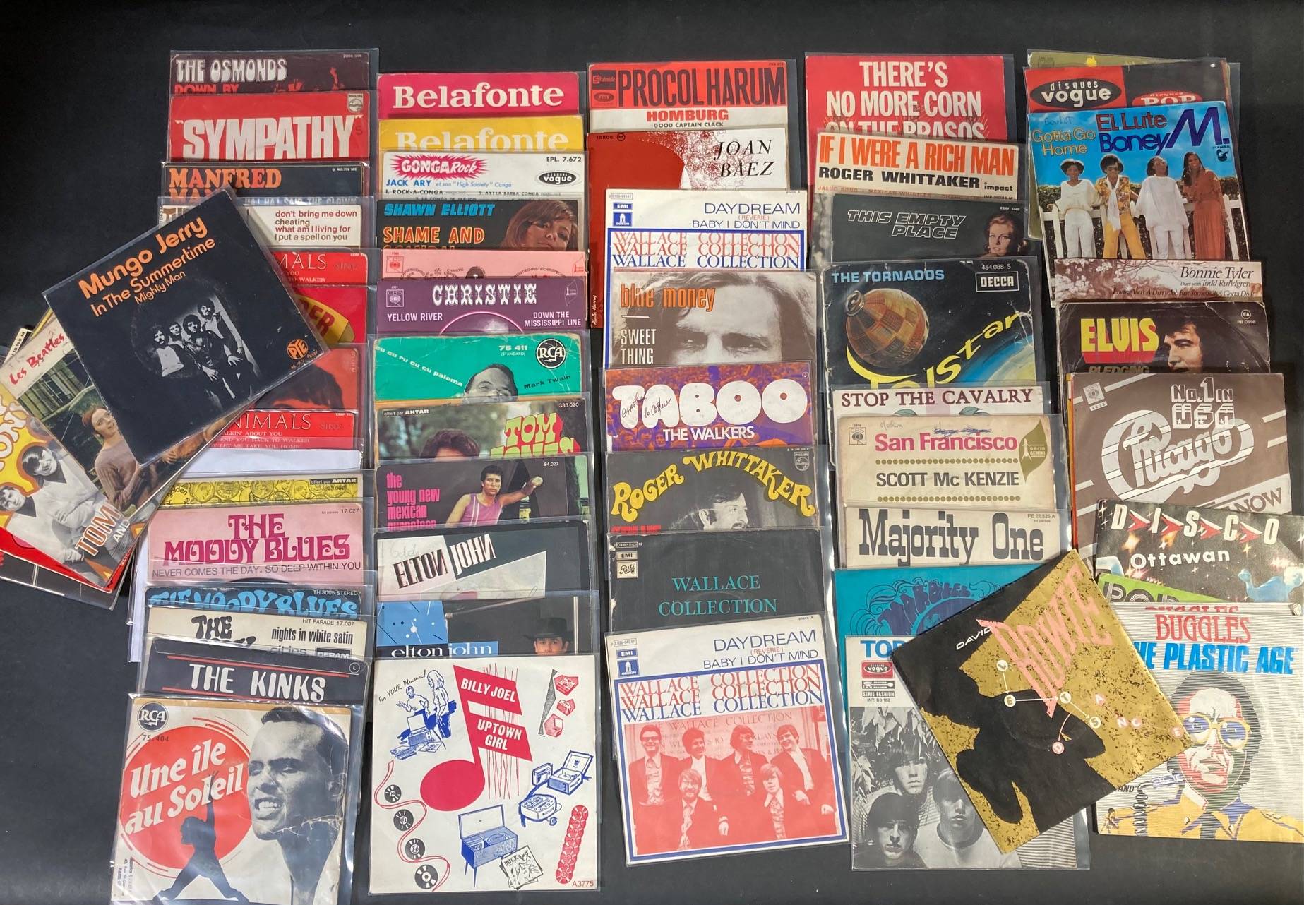 Lot de 70, 45 tours de divers groupes musicaux : David BOWIE, The ROLLING STONES, PROCOL HARUM, WALLACE COLLECTION, The KINKS, The MOODY BLUES.