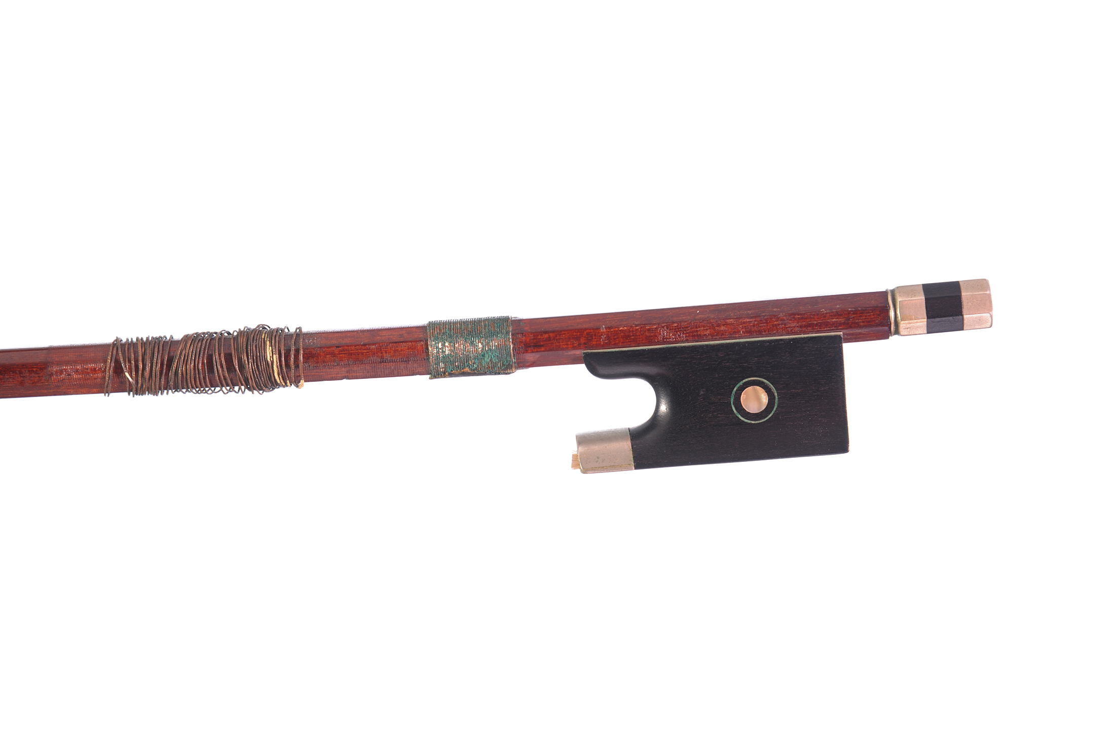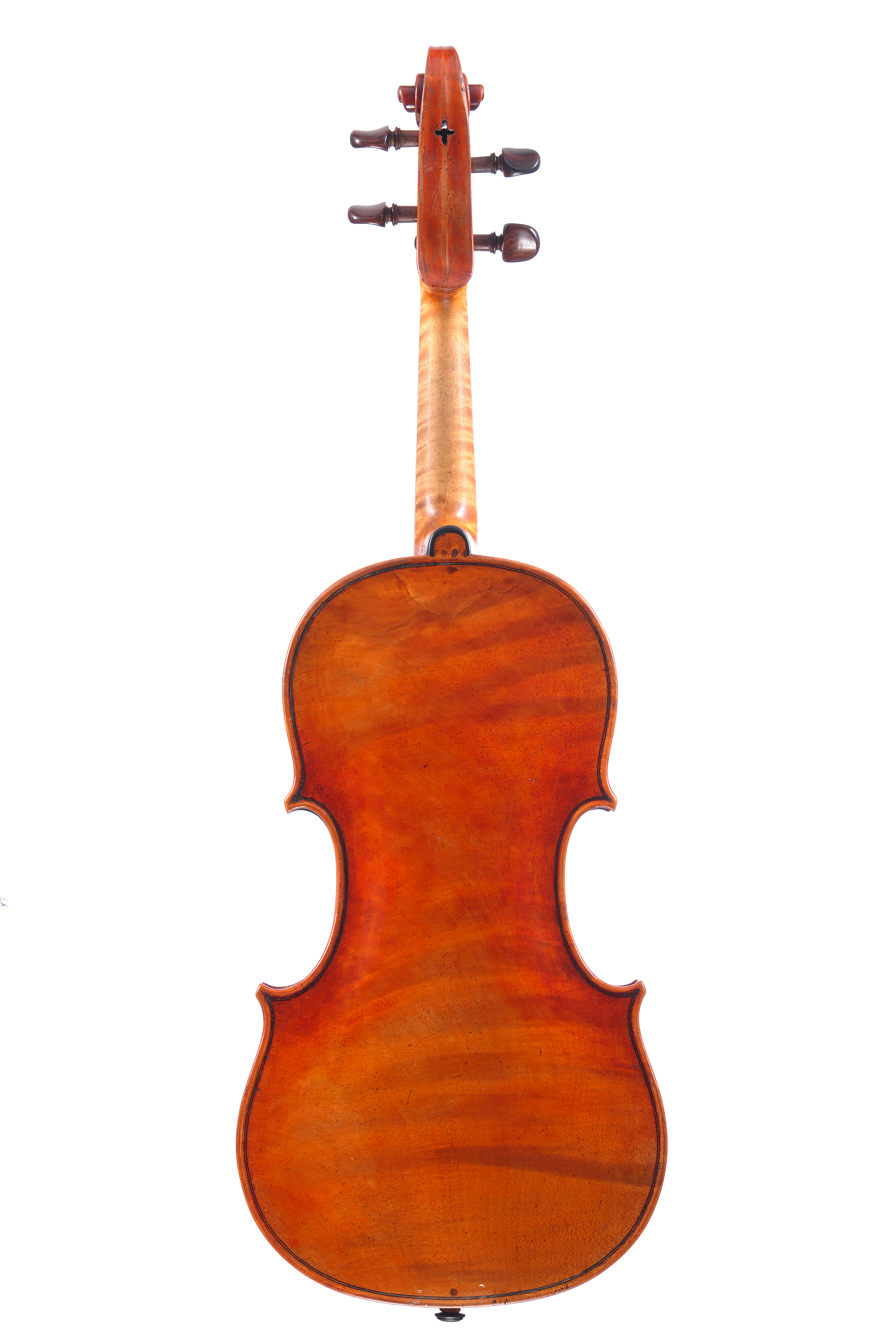 Beau violon Allemand, portant une étiquette apocryphe A. R. Gagliano, fond d'une pièce en bel érable flammé, table en épicéa de deux pièces aux pores serrés au centre, s'élargissant sur les bords. Restauré au talon. Vernis brun doré. 356 mm, avec boite et archet.