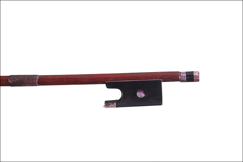 Archet de violon fait à Mirecourt vers 1900, portant la marque au fer de Cuniot Hury. Baguette ronde en beau bois de pernambouc. Hausse ébène montée argent. 731 mm. 46g sans mèche ni garniture.