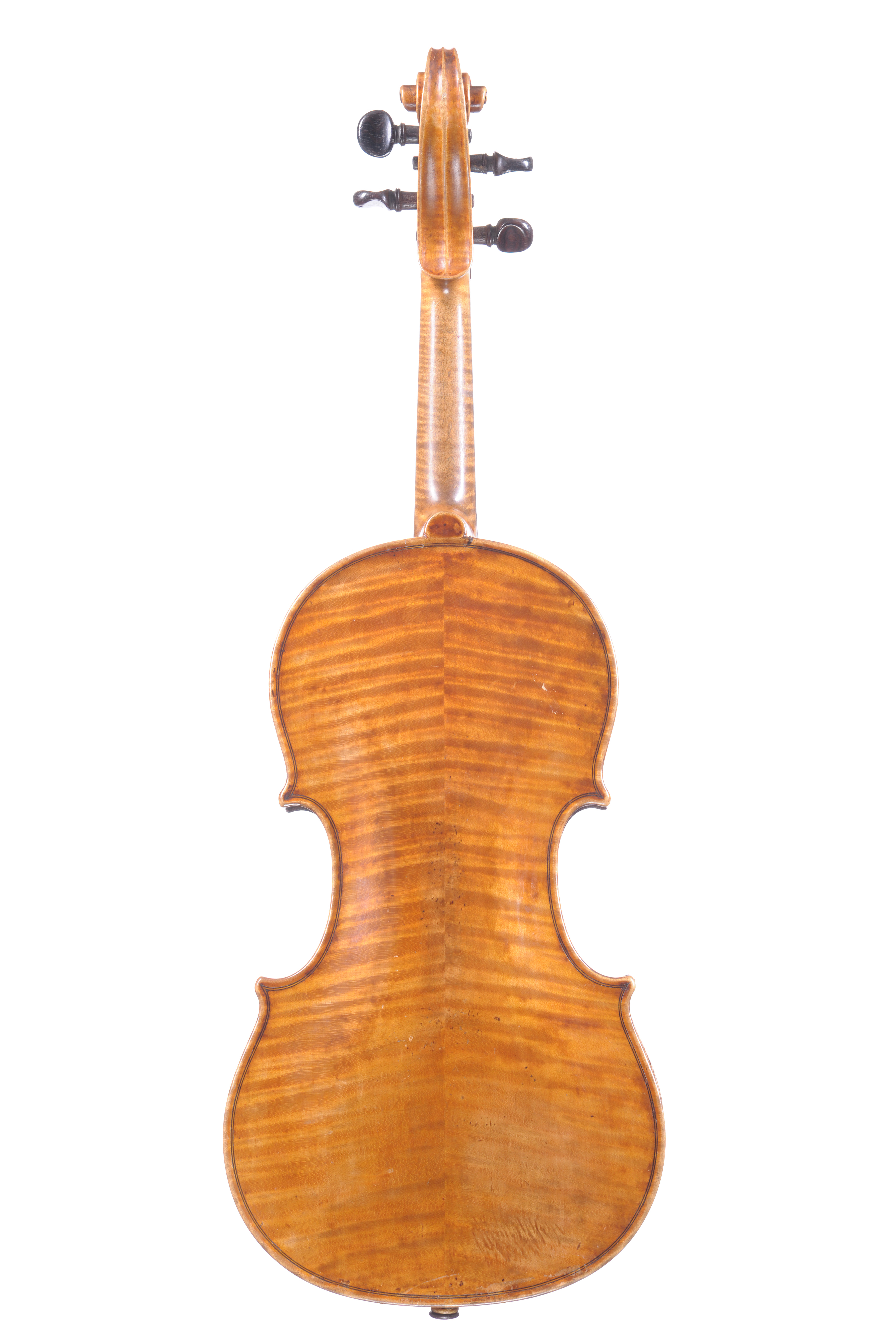 Violon portant une étiquette apocryphe de "Nicolas Amati 1630". Fond de deux pièces, bel érable aux ondes régulières et descendantes. Table de deux pièces au pores larges au centre, diminuant sur les bords. Cassures aux pattes d'ouies. Petite cassure à l'éclisse supérieure. 357 mm.
