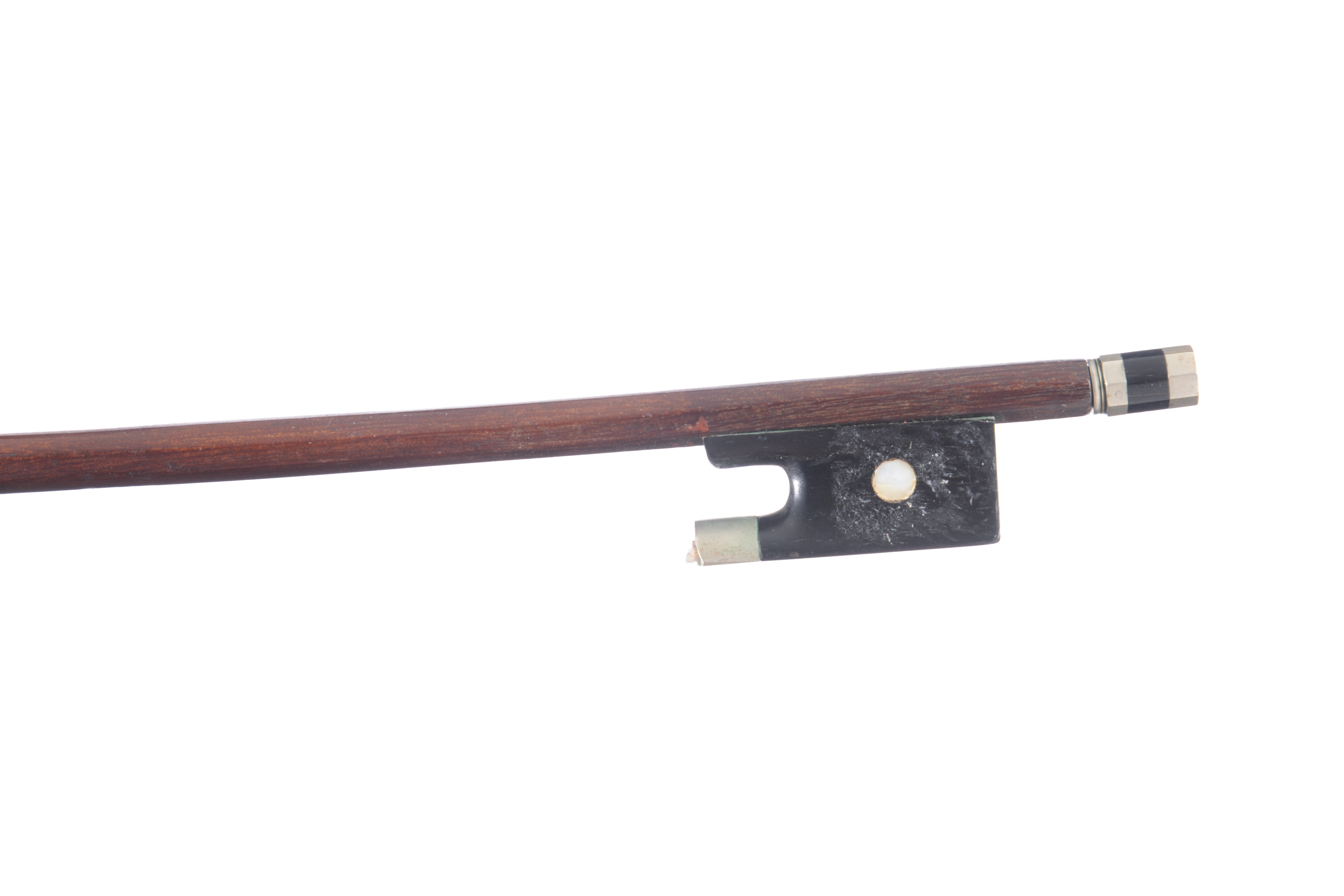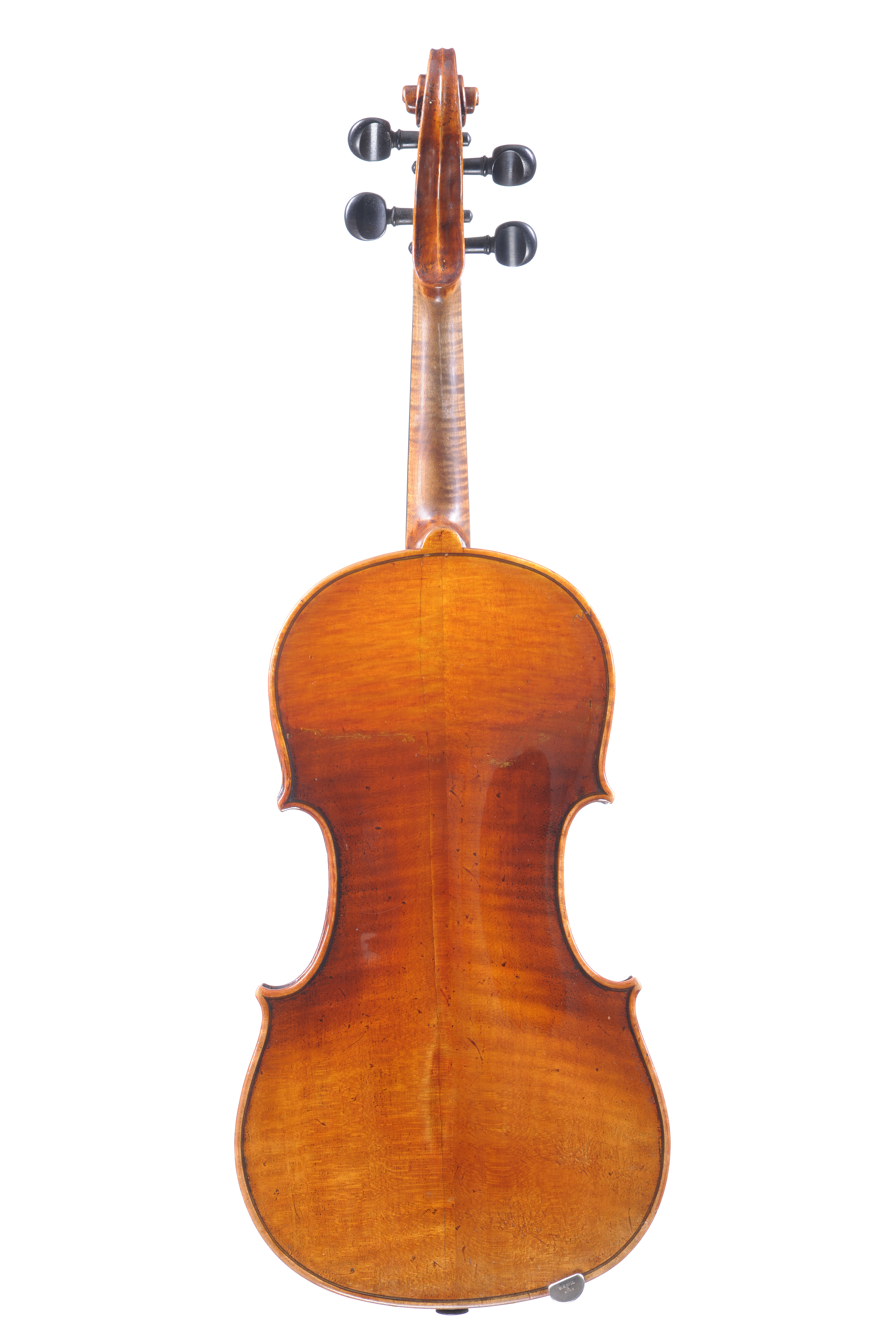 Violon allemand fait "en copie de J.Guarnerius 1736". Réparé au fond. Vernis retouché. 353 mm. Avec boite et deux archets.