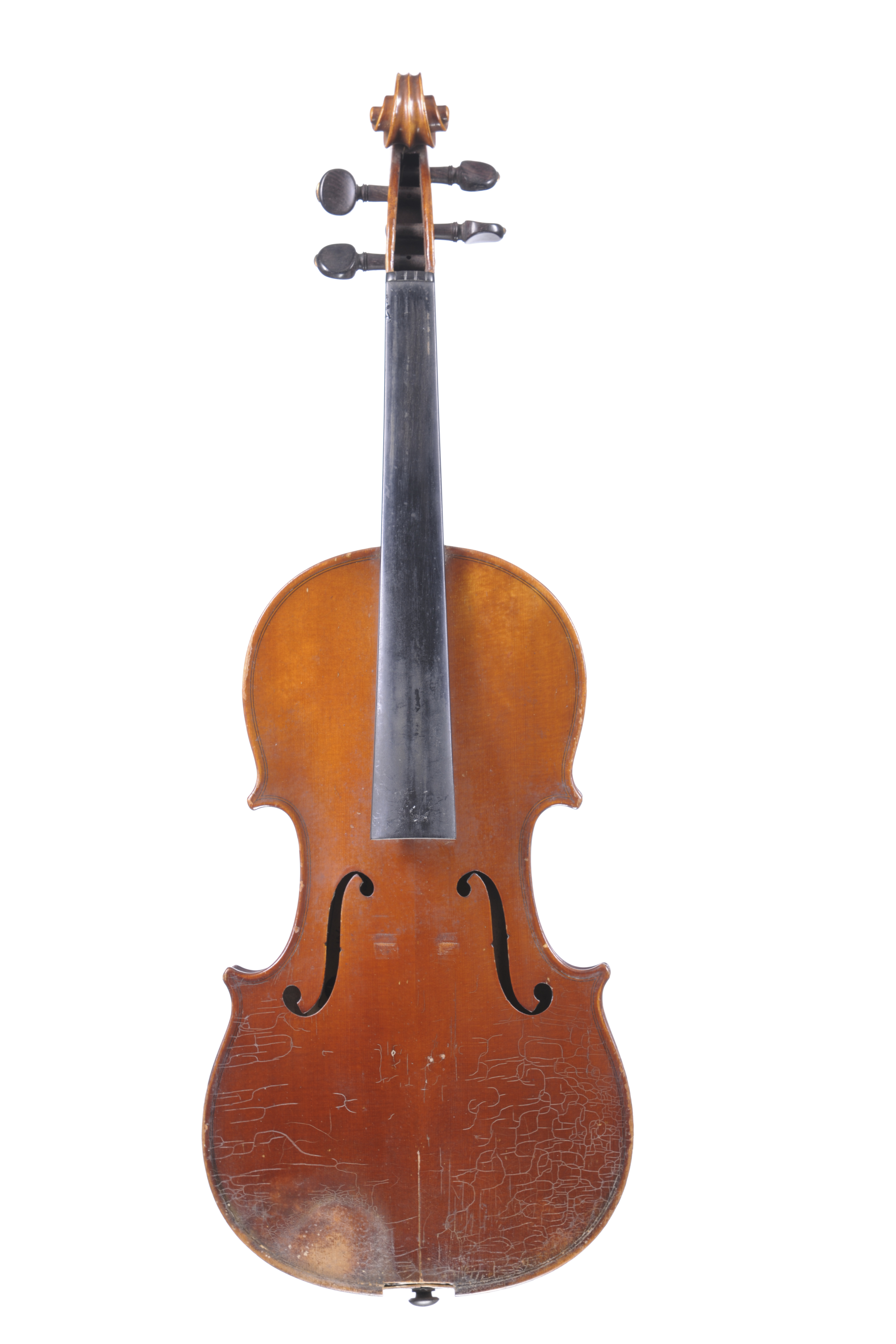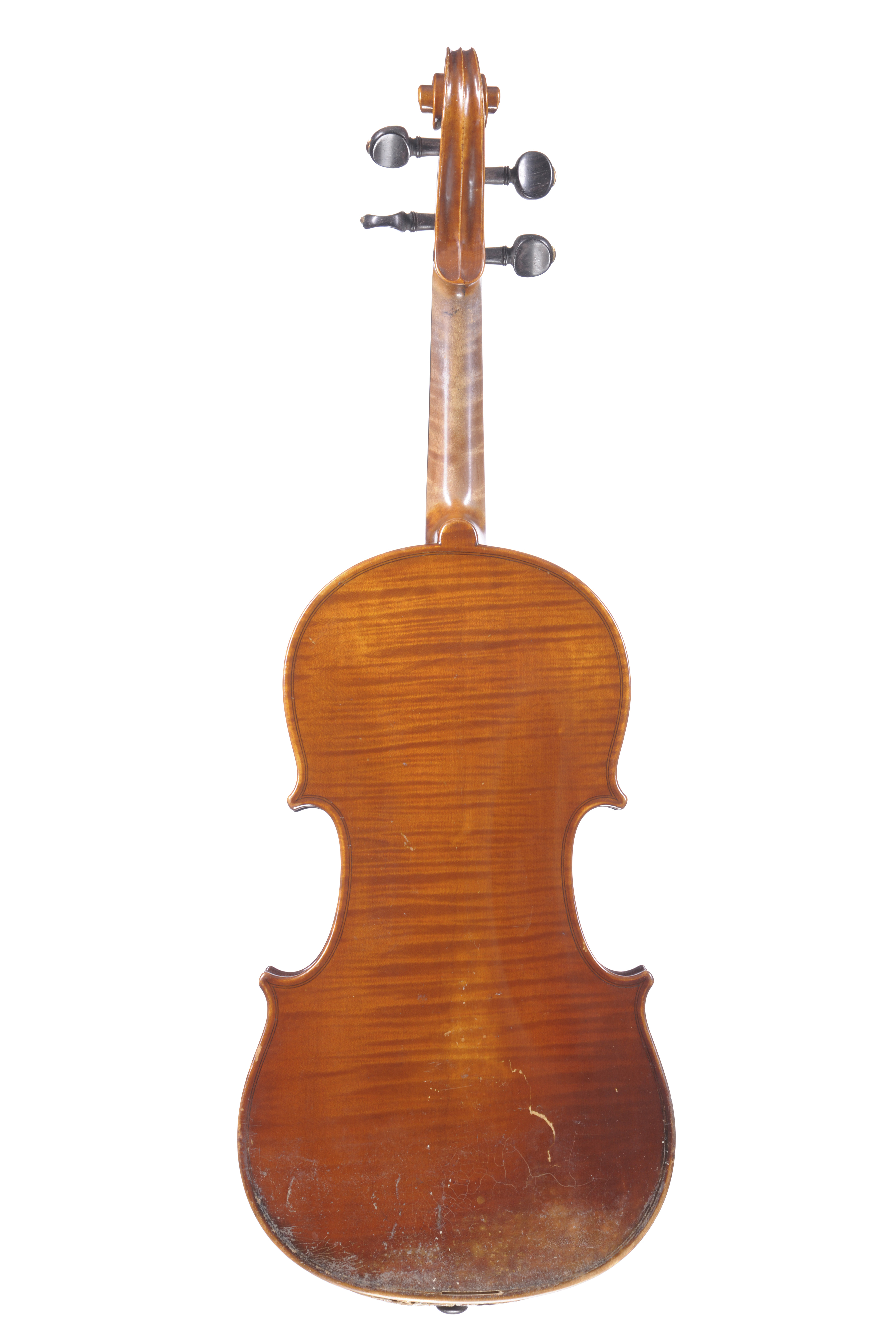 Violon français fait au début du XXe siècle portant une étiquette modèle d'après Joannes Baptista Guadanini, 1741. Fond d'une pièce. Eclisses et tasseau du bas à revoir. Vernis brun orangé. 359 mm. Avec archet et boite.