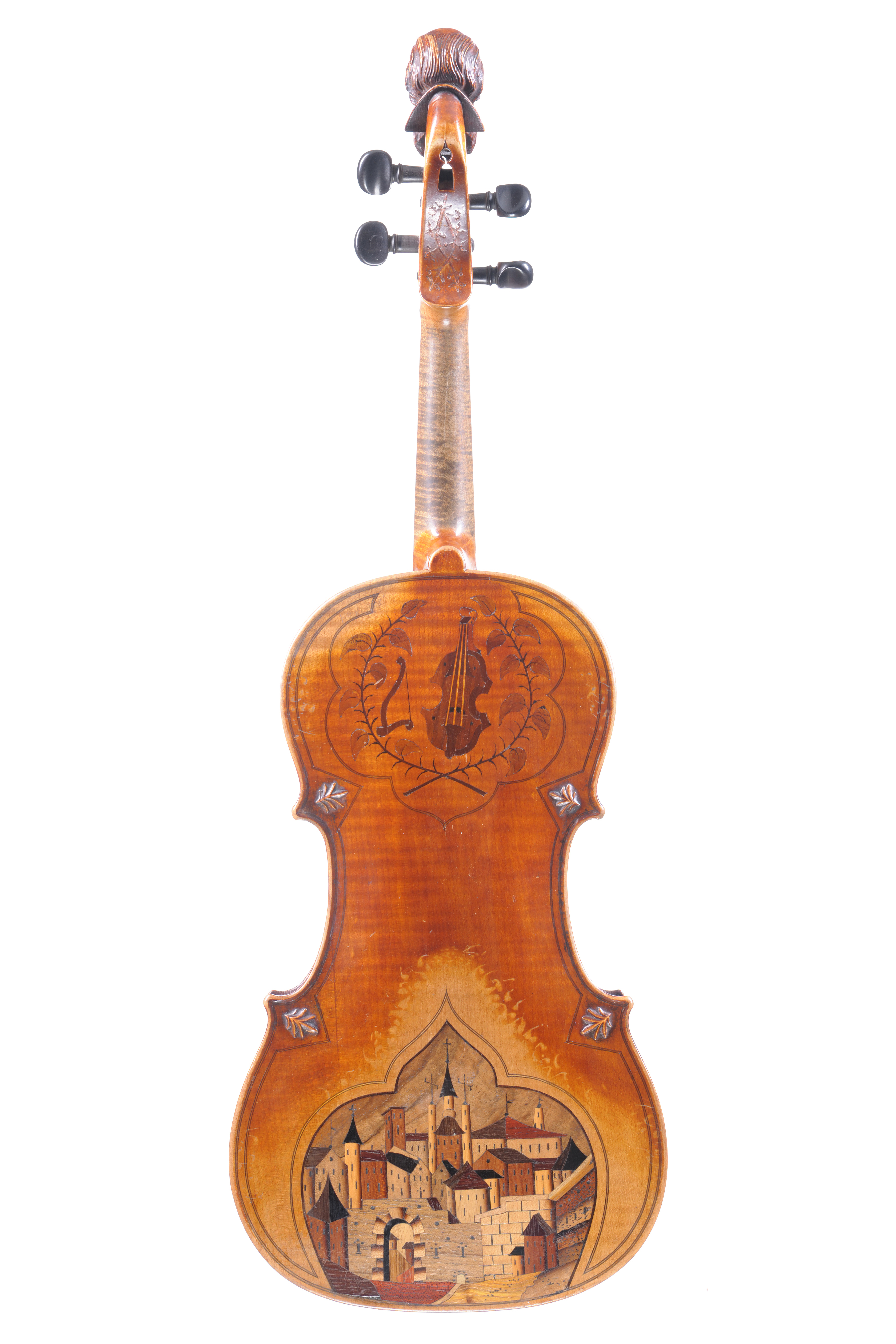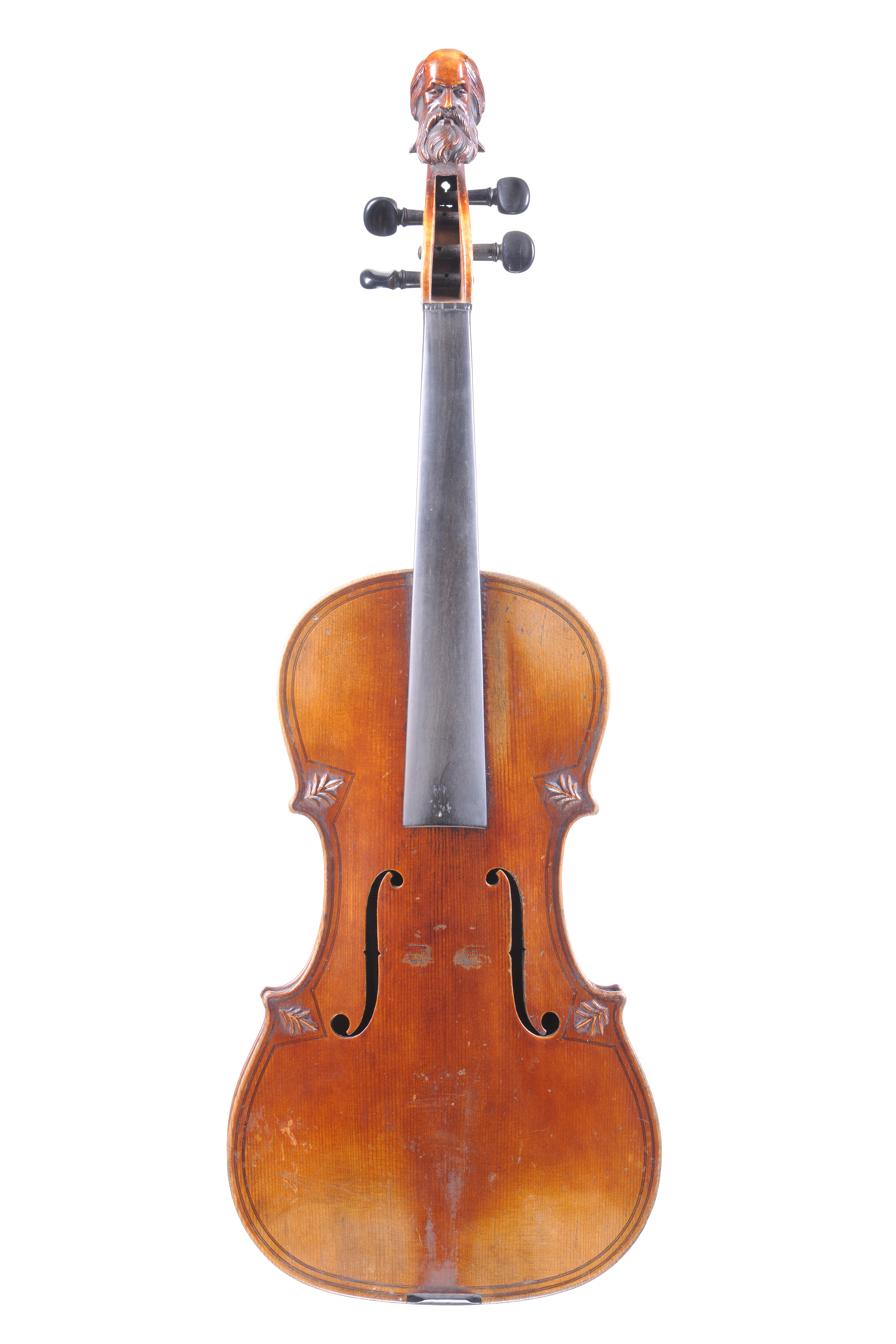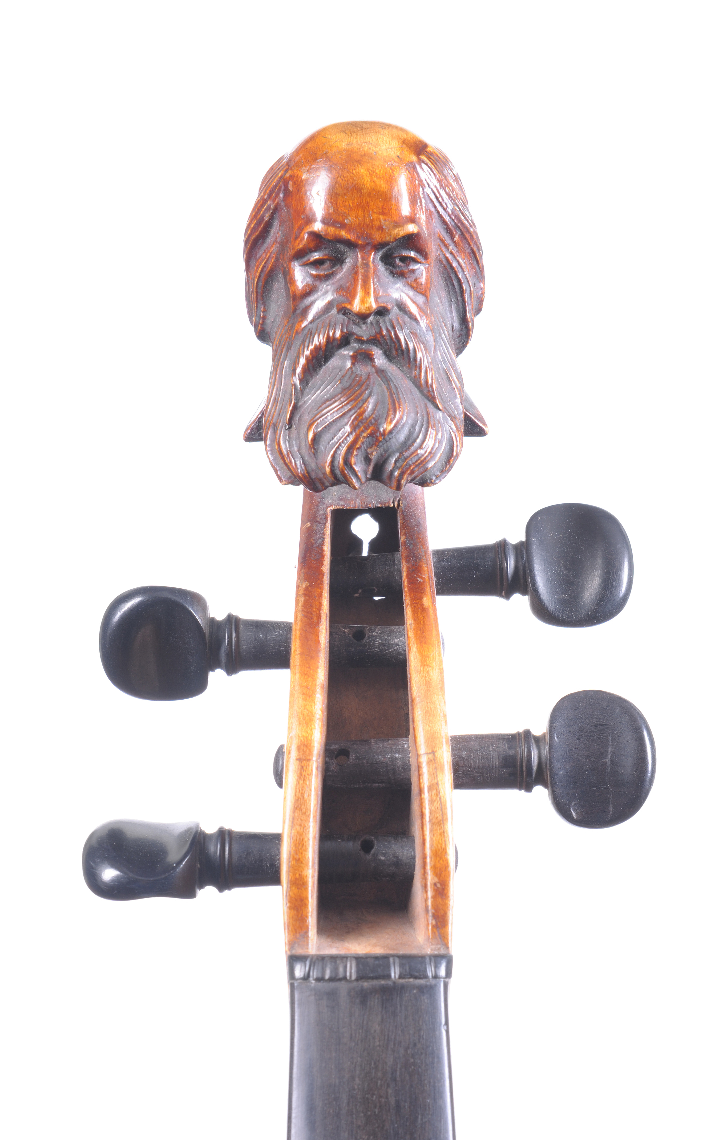 Violon école de Derazey fait vers 1870, portant une étiquette de Duiffopruggar, 1516. Tête de barbu et diverses décorations sur le fond. 367 mm.