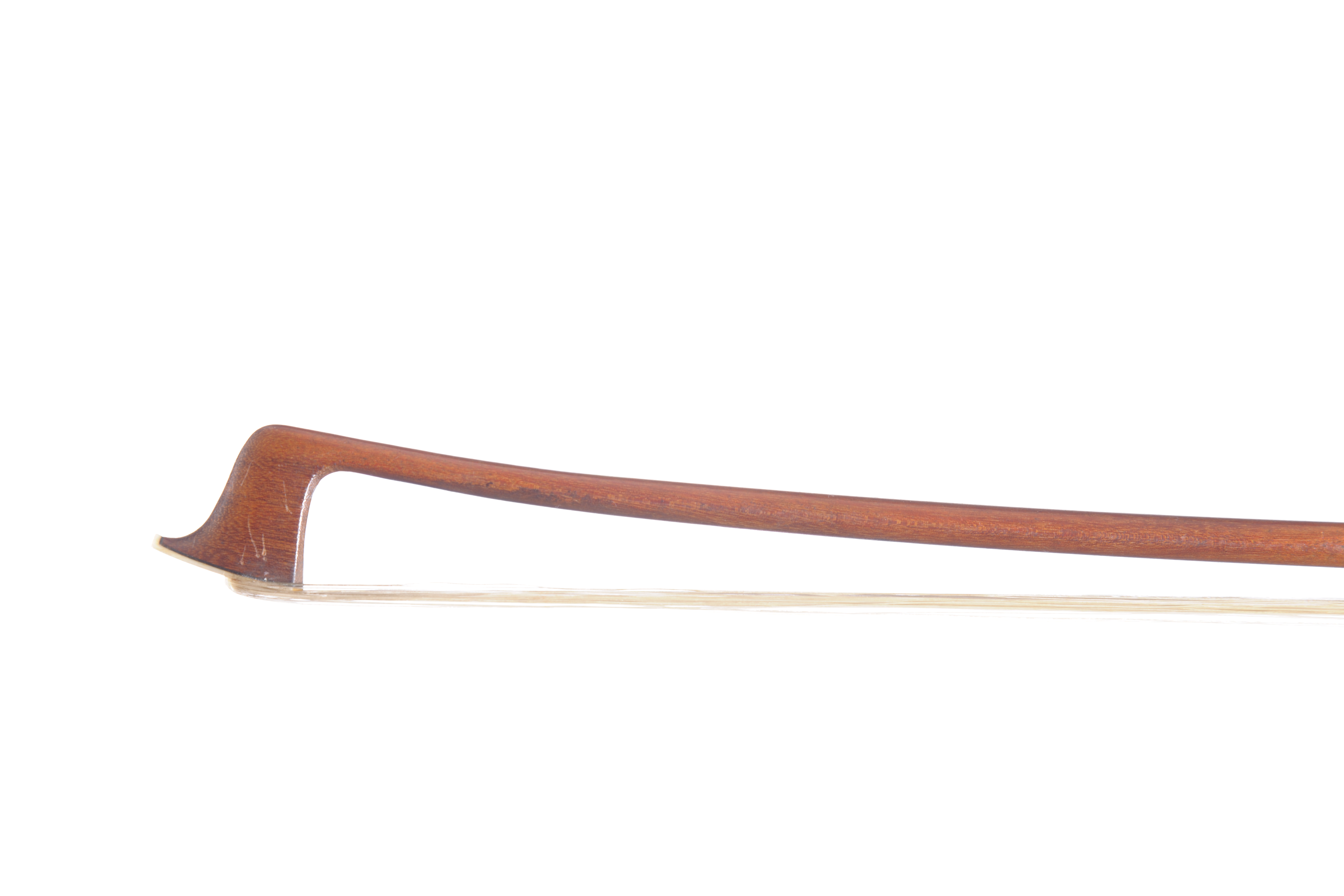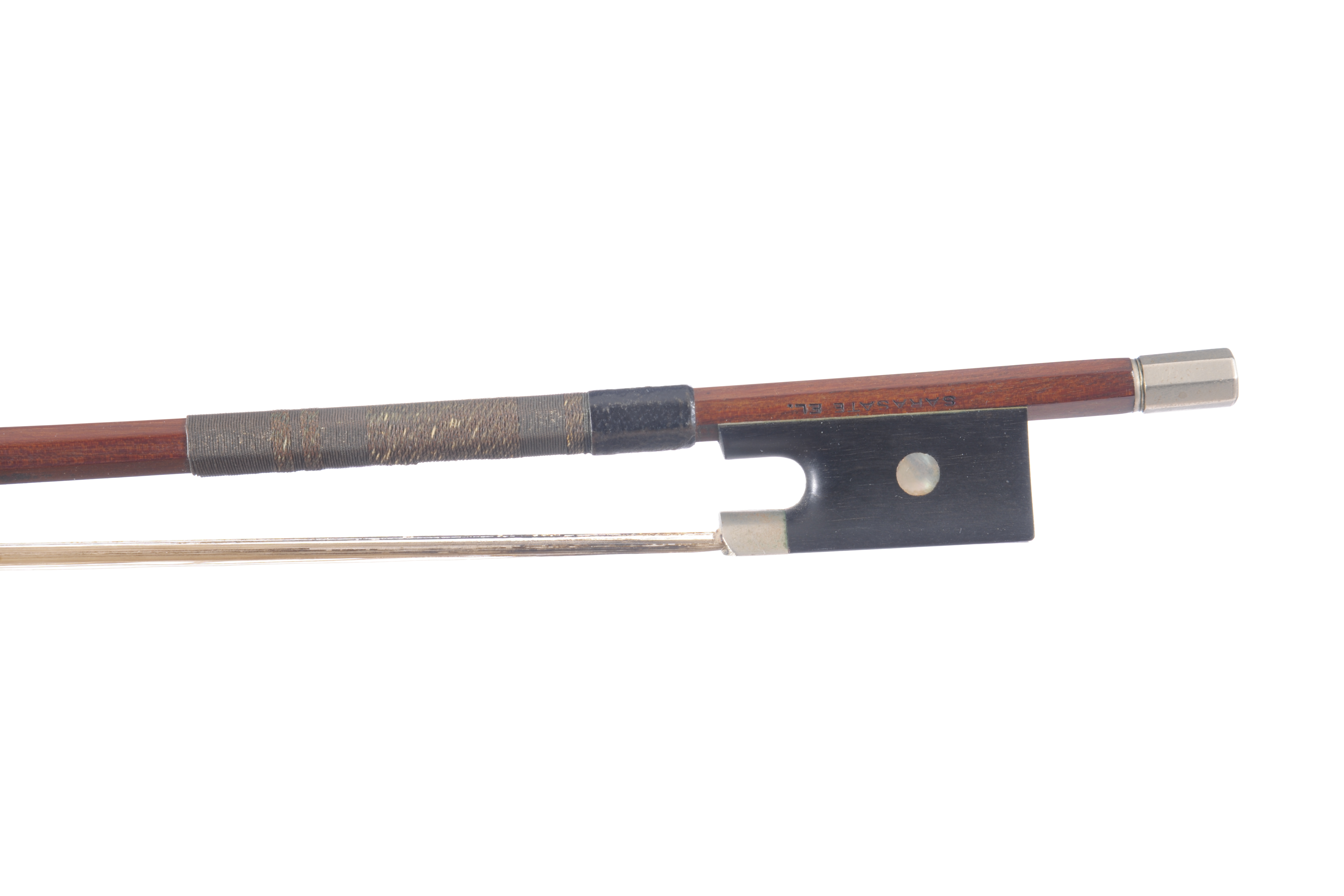 Archet fait chez Jerome Thibouville Lamy. Baguette en pernambouc, portant la marque "Sarasate élève". Hausse ébène montée maillechort.