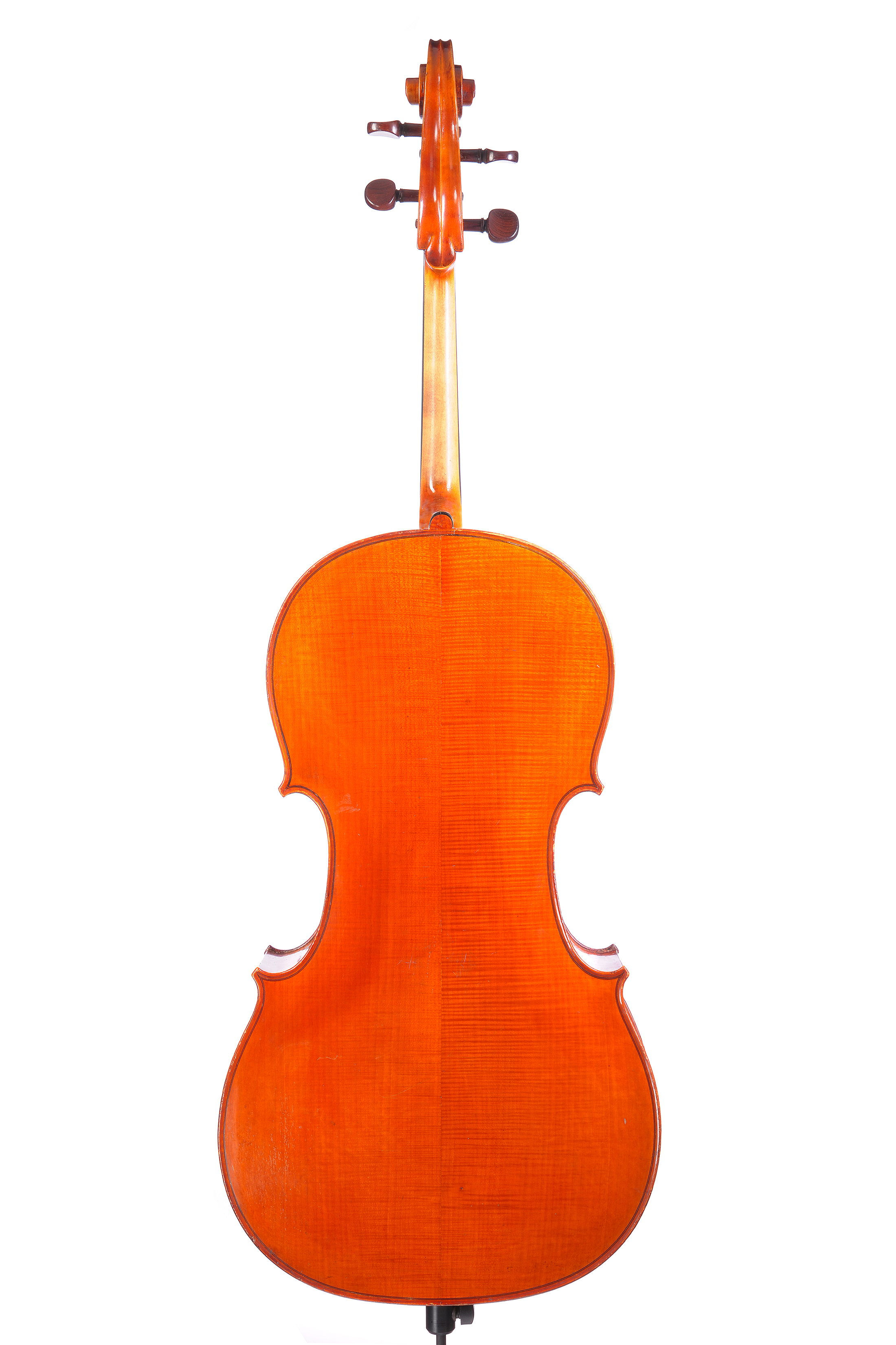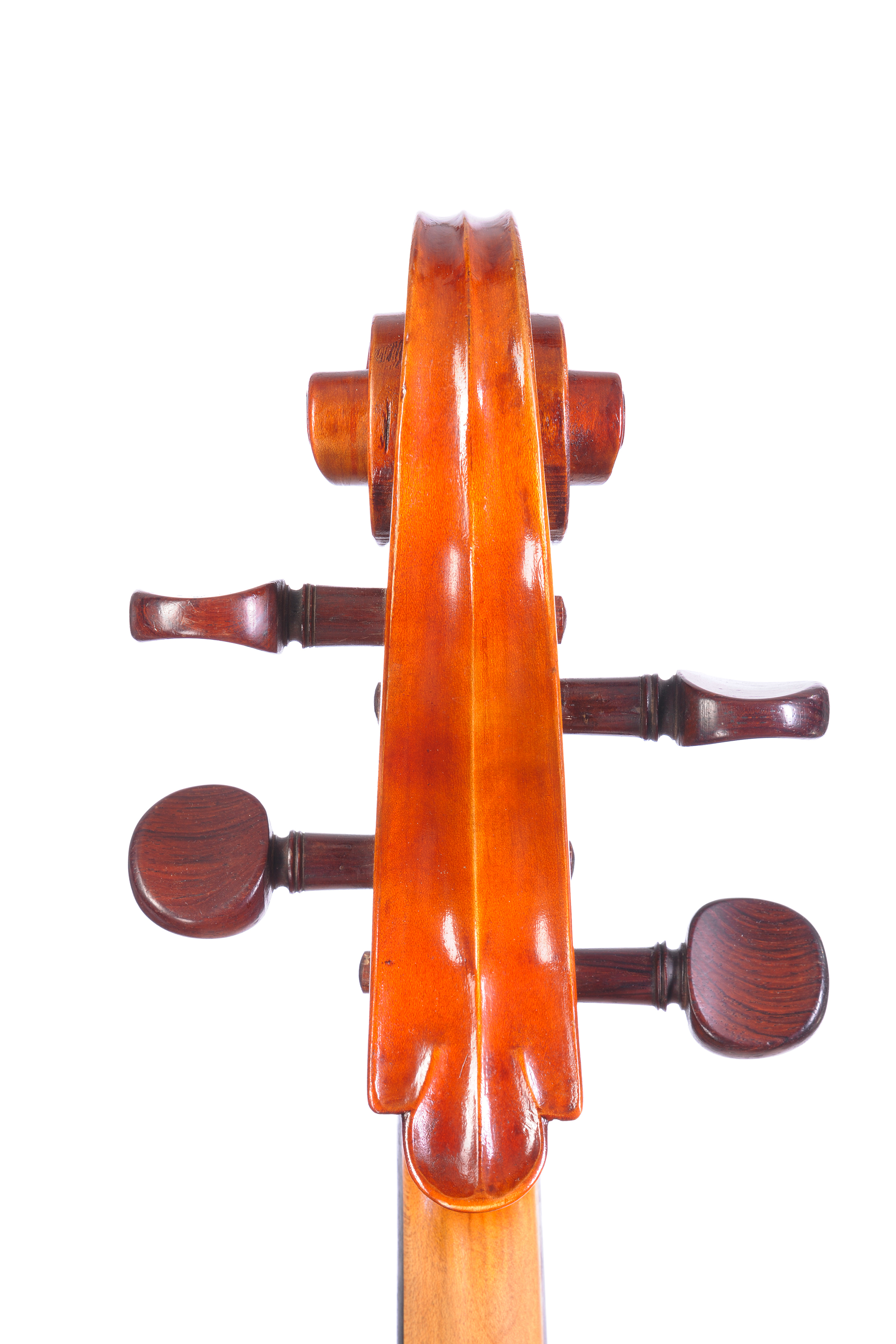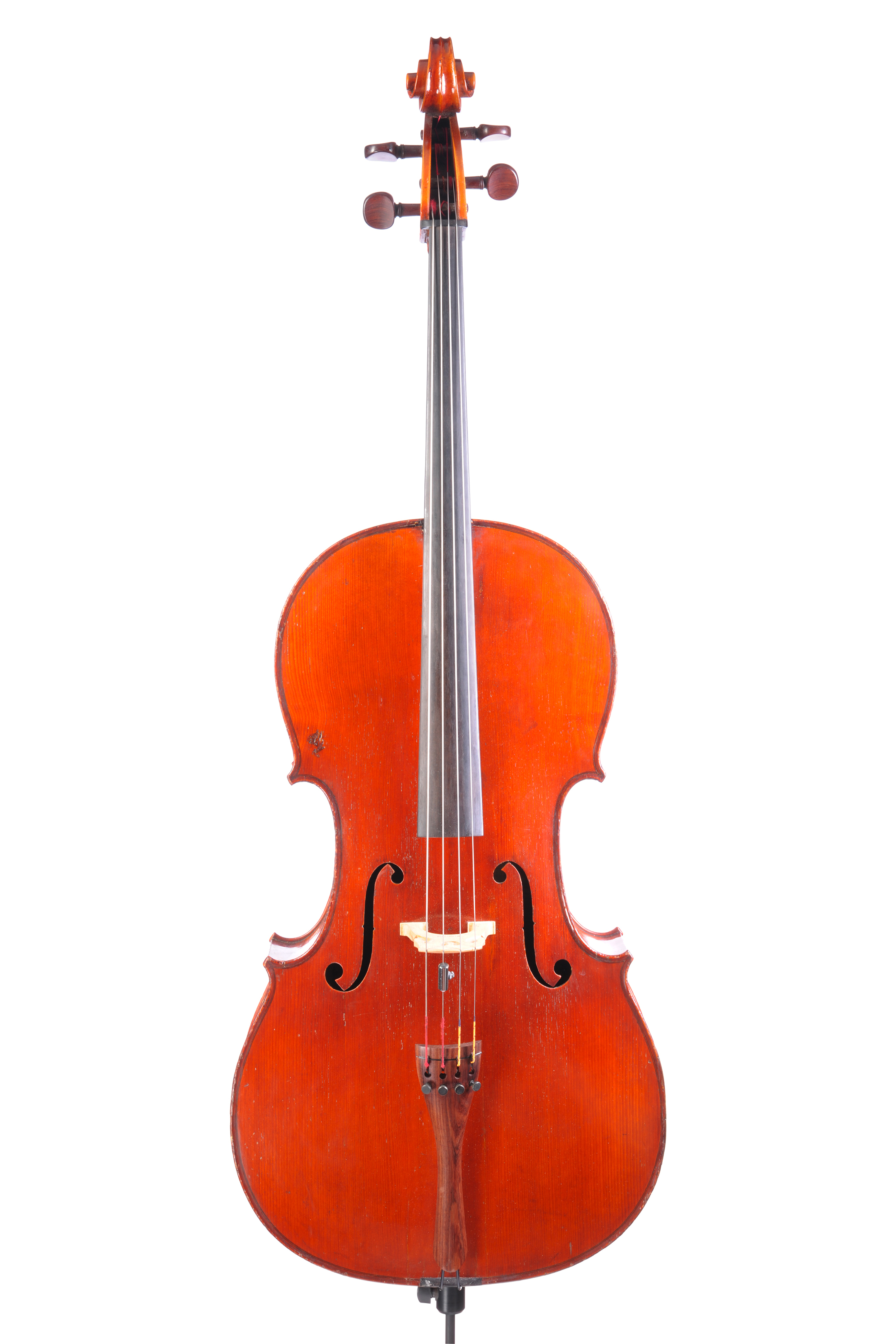 Violoncelle de Mirecourt, fin XIXe, portant une étiquette de François Salzard. Tête d'un autre auteur. Fond de deux pièces, ondes fines et éclisses en érable ondé.