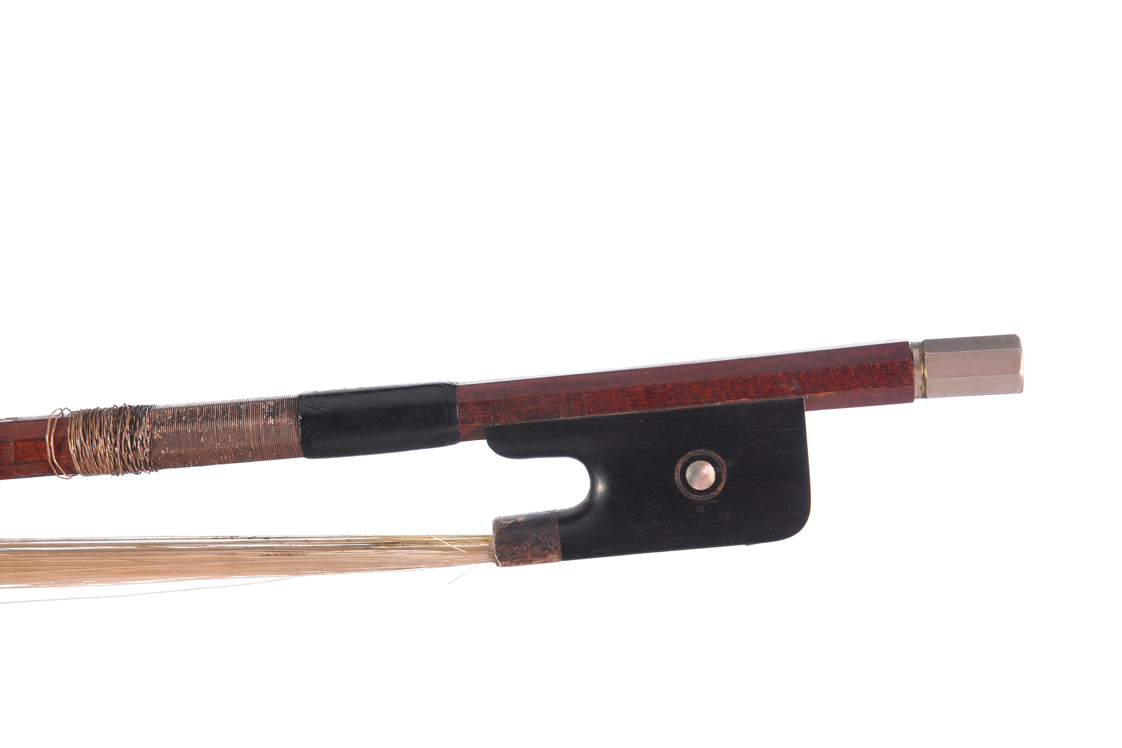 Archet de violoncelle, École de Morizot, baguette en pernambouc octogonale, 695mm, hausse ébène montée argent, bouton maillechort d'un autre auteur, 74g.