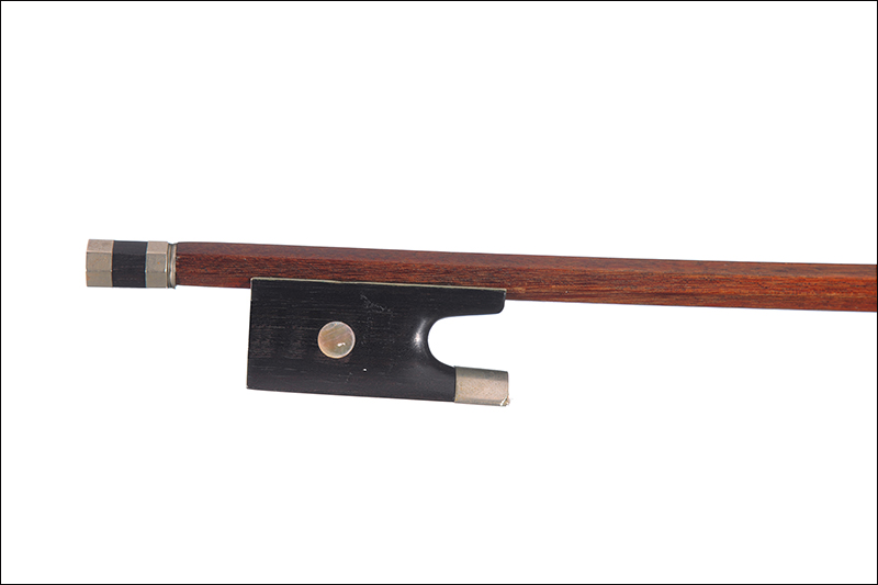 Archet de violon. Baguette ronde en beau bois de pernambouc. Hausse ébène montée maillechort. Bouton ébène monté de deux viroles. 730 mm 45,9 g. Sans mèche ni garniture.