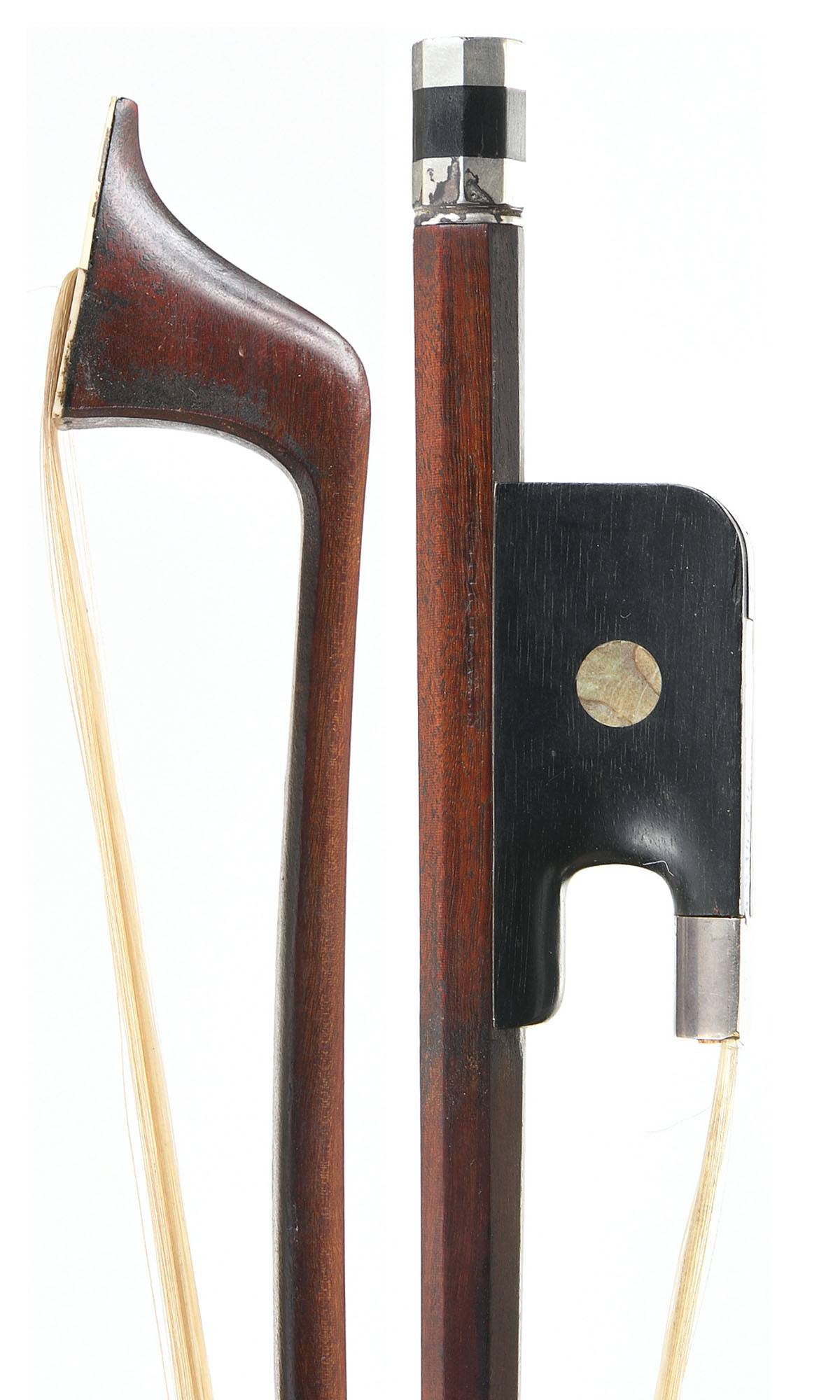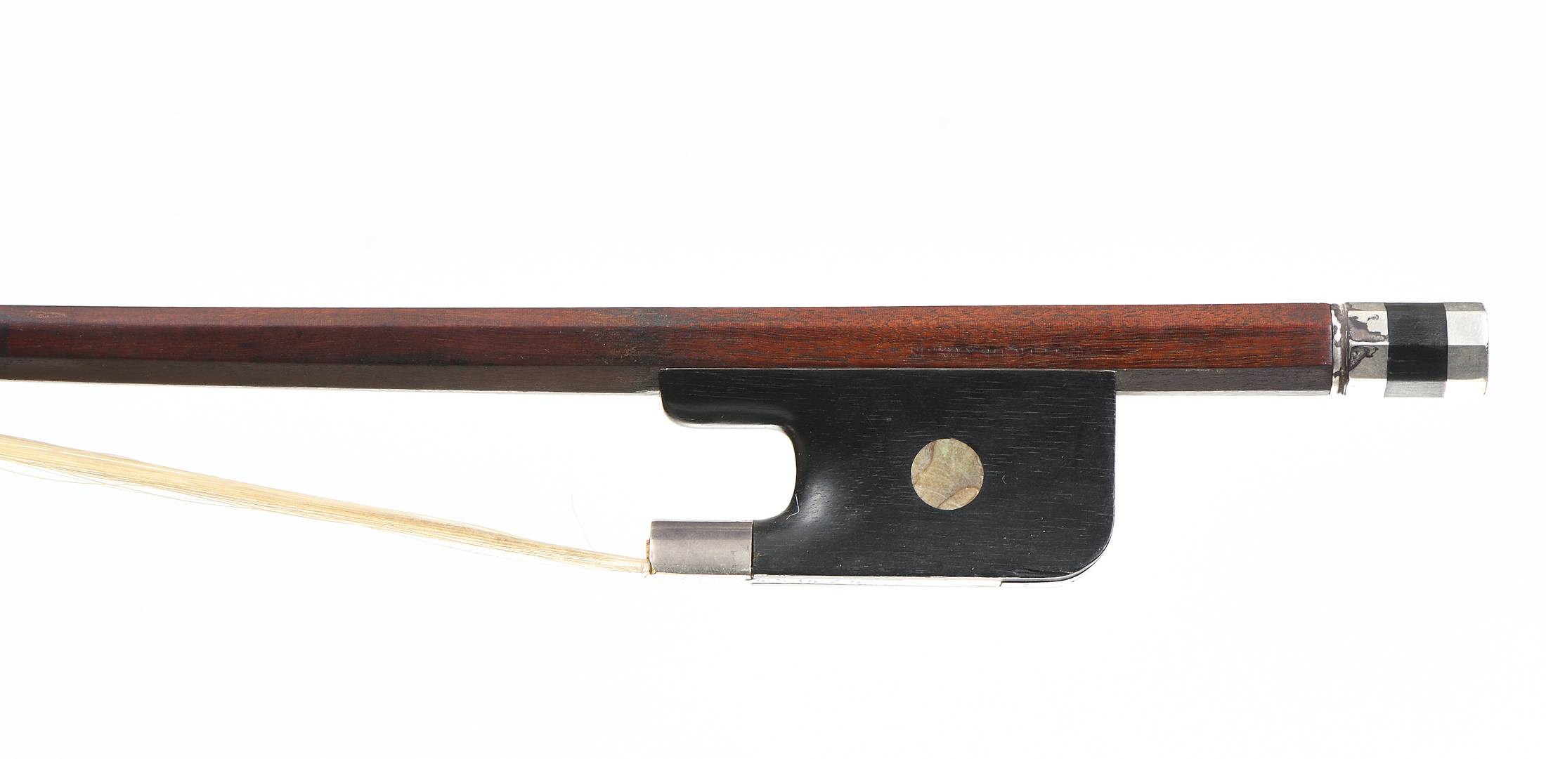 portant une marque au fer apocryphe "Vte FETIQUE A PARIS". Baguette ronde en bois de pernambouc. Hausse ébène, monté argent. 675 mm. 123 g sans garniture.