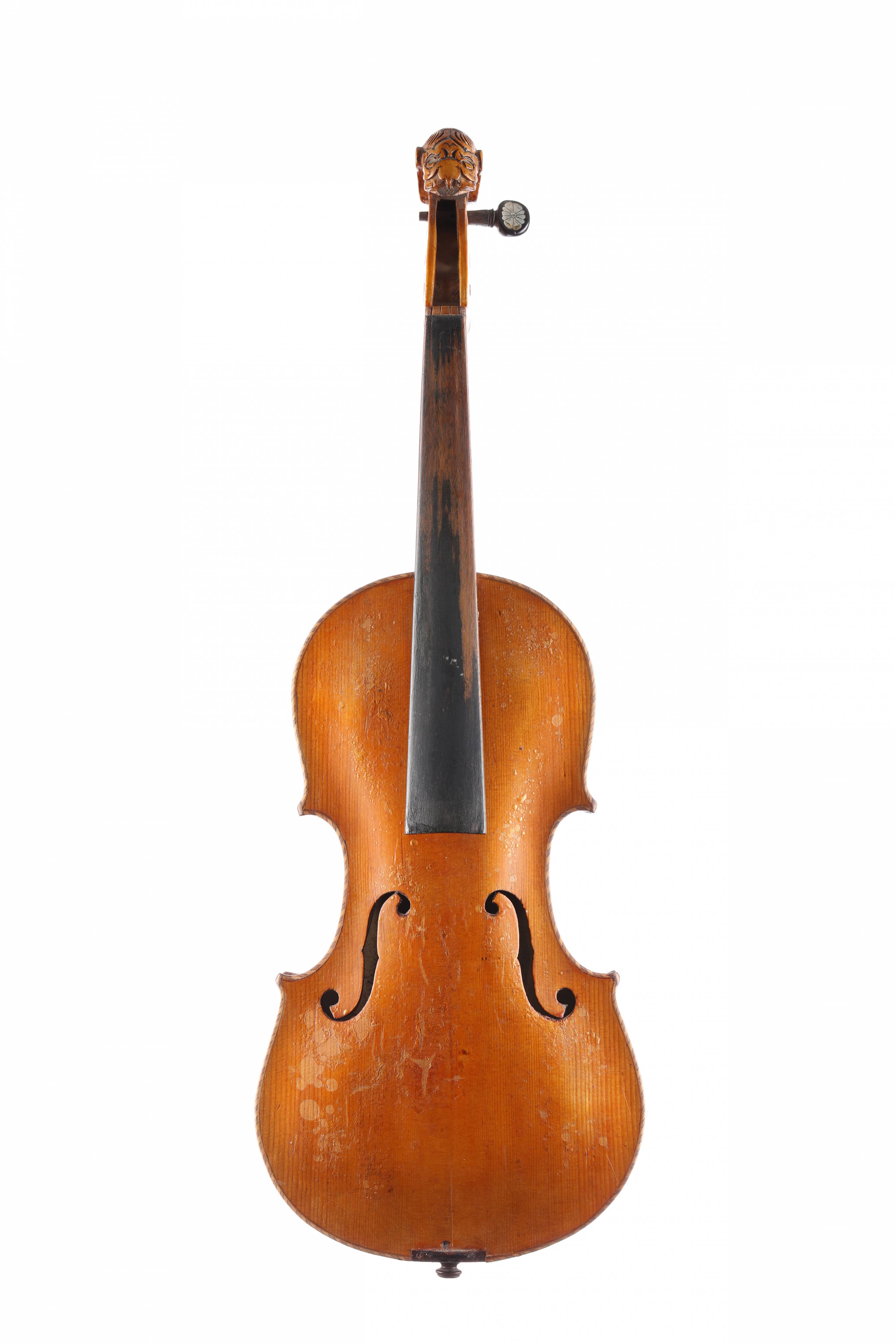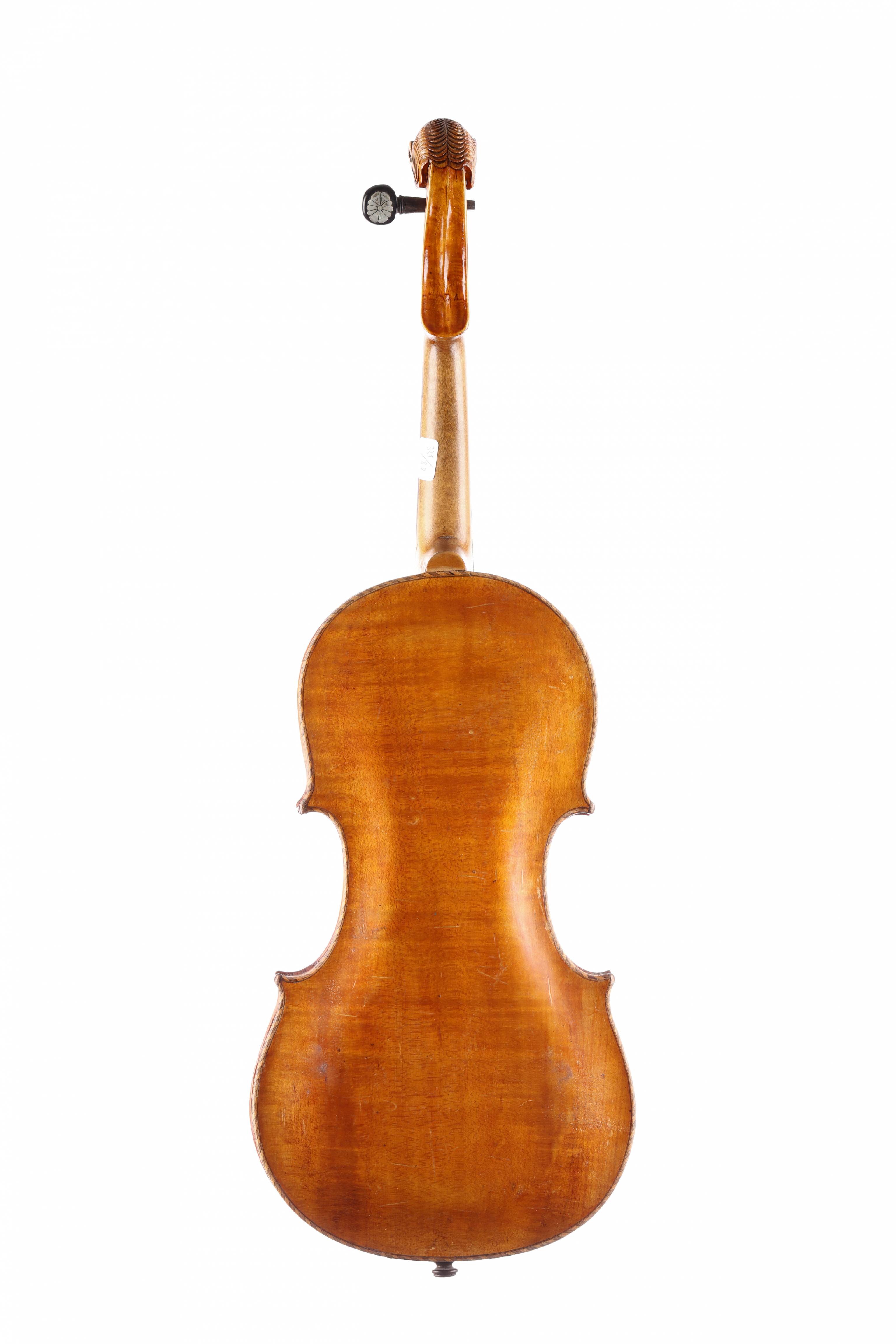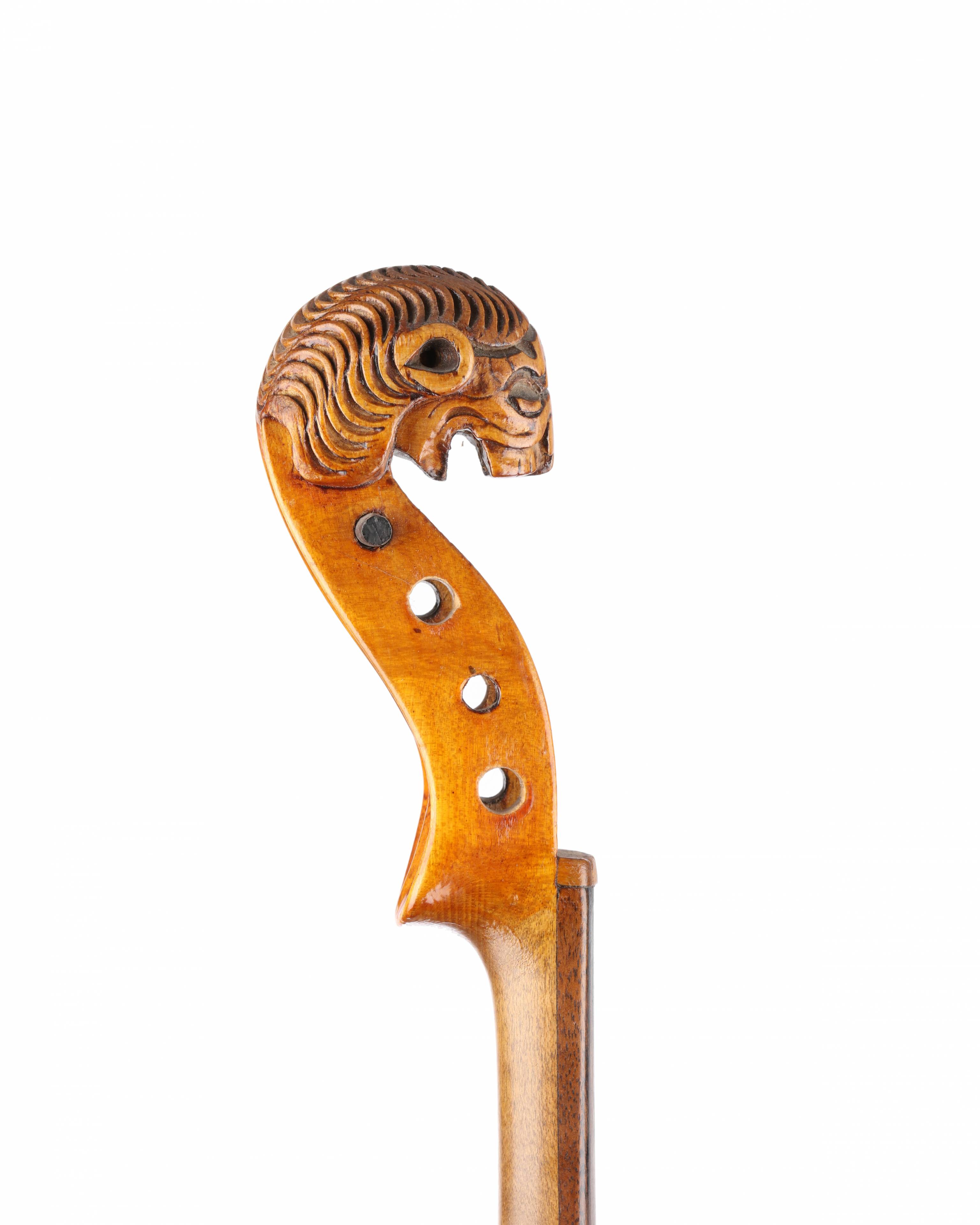 portant une étiquette "Jacobus Stainer..." Tête sculptée de lion. Bords marquetés. Fond d'une pièce en érable. Vernis brun clair. Usures. 360 mm.