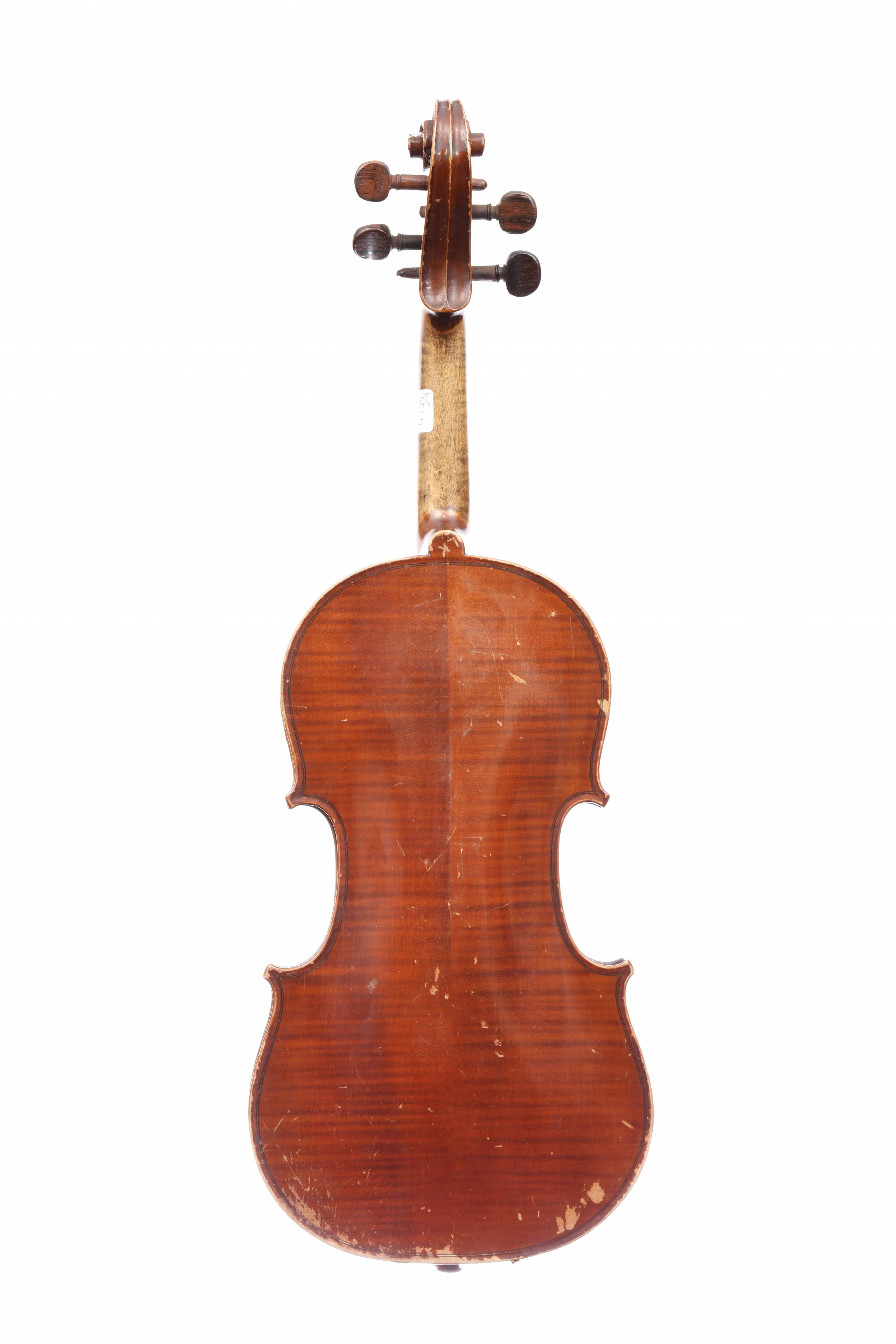 portant une étiquette "Joseph Guarnerius...". Fond de deux pièces en érable. Vernis brun doré. Usures. 360 mm.