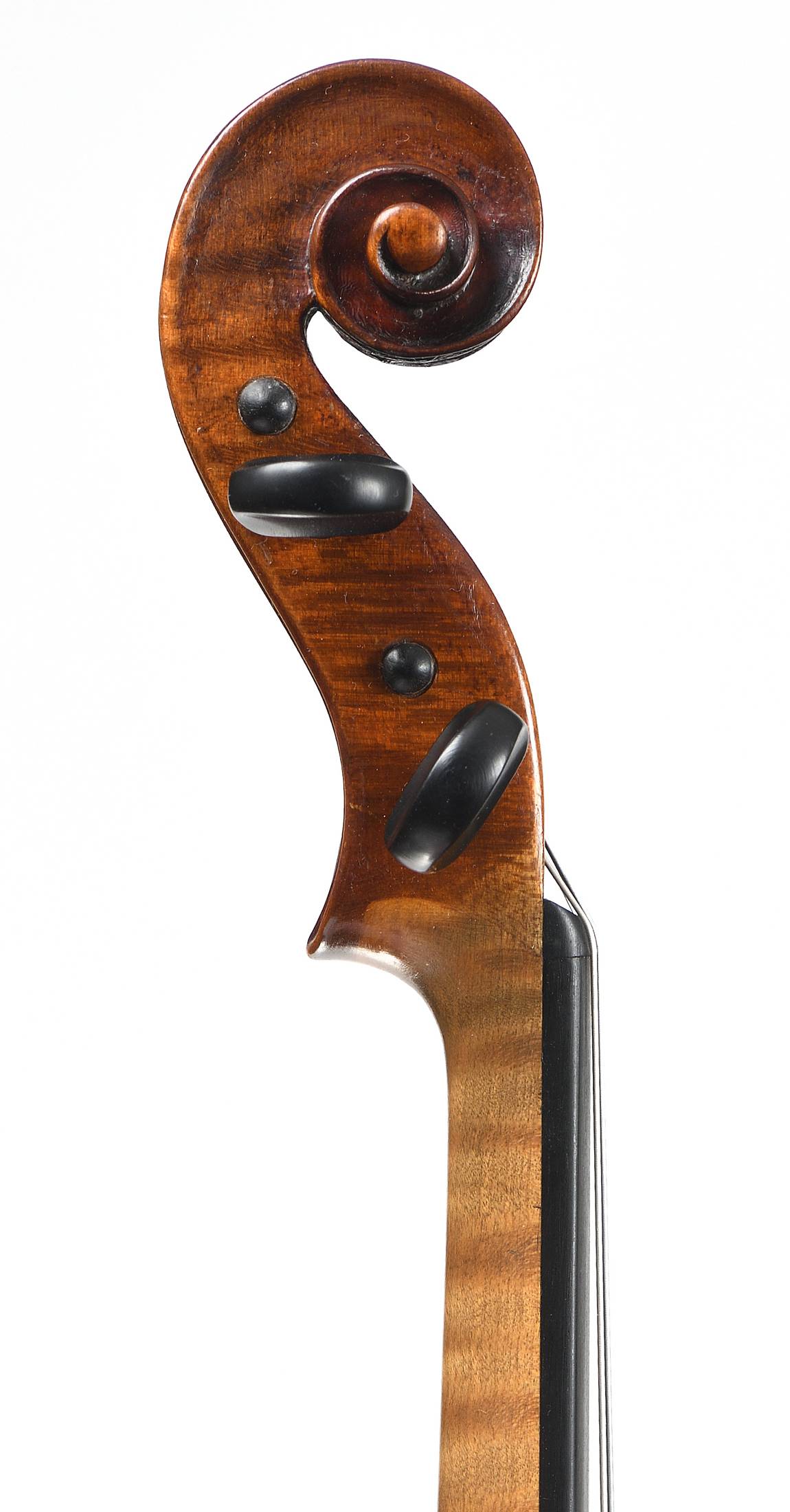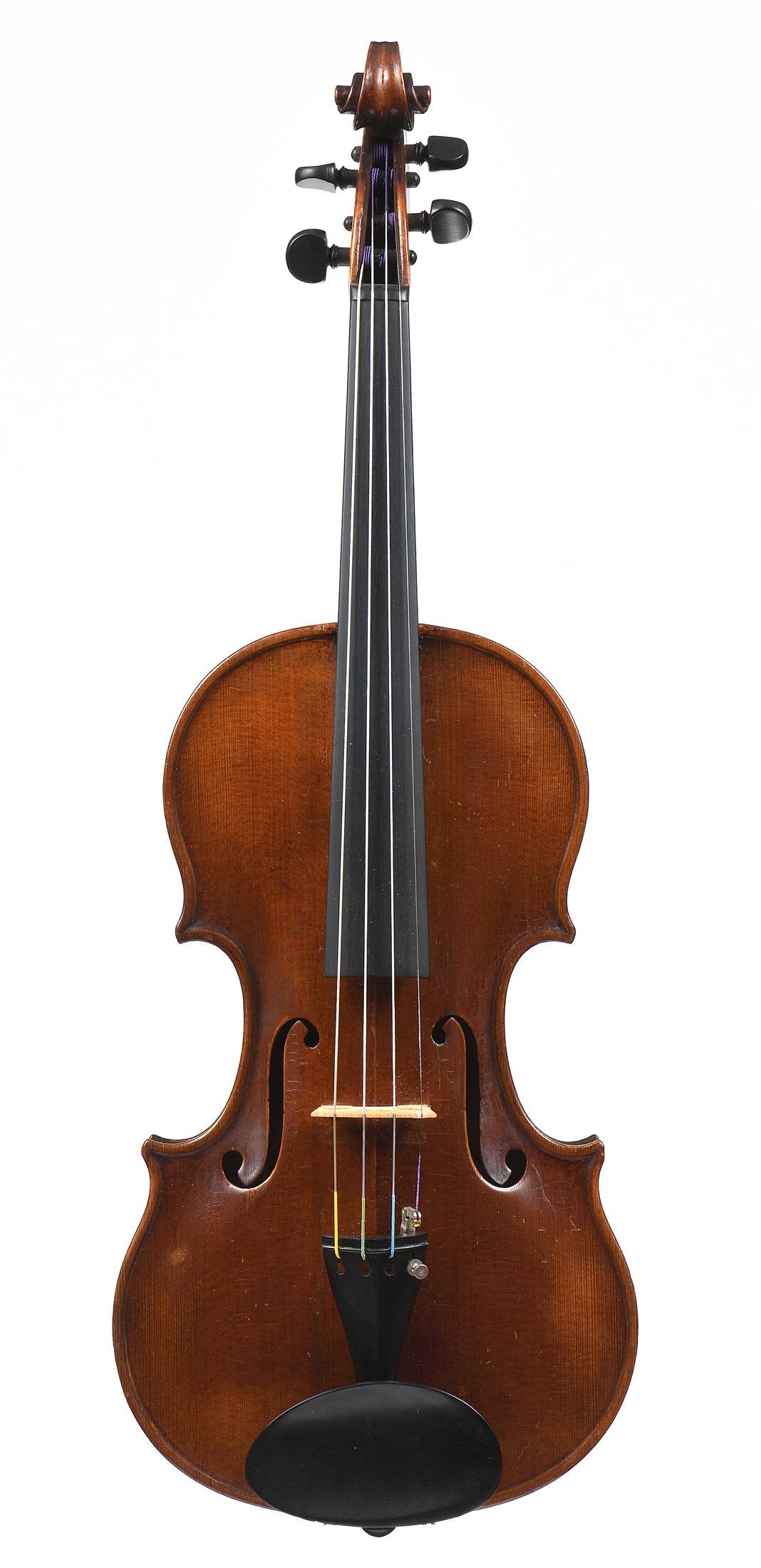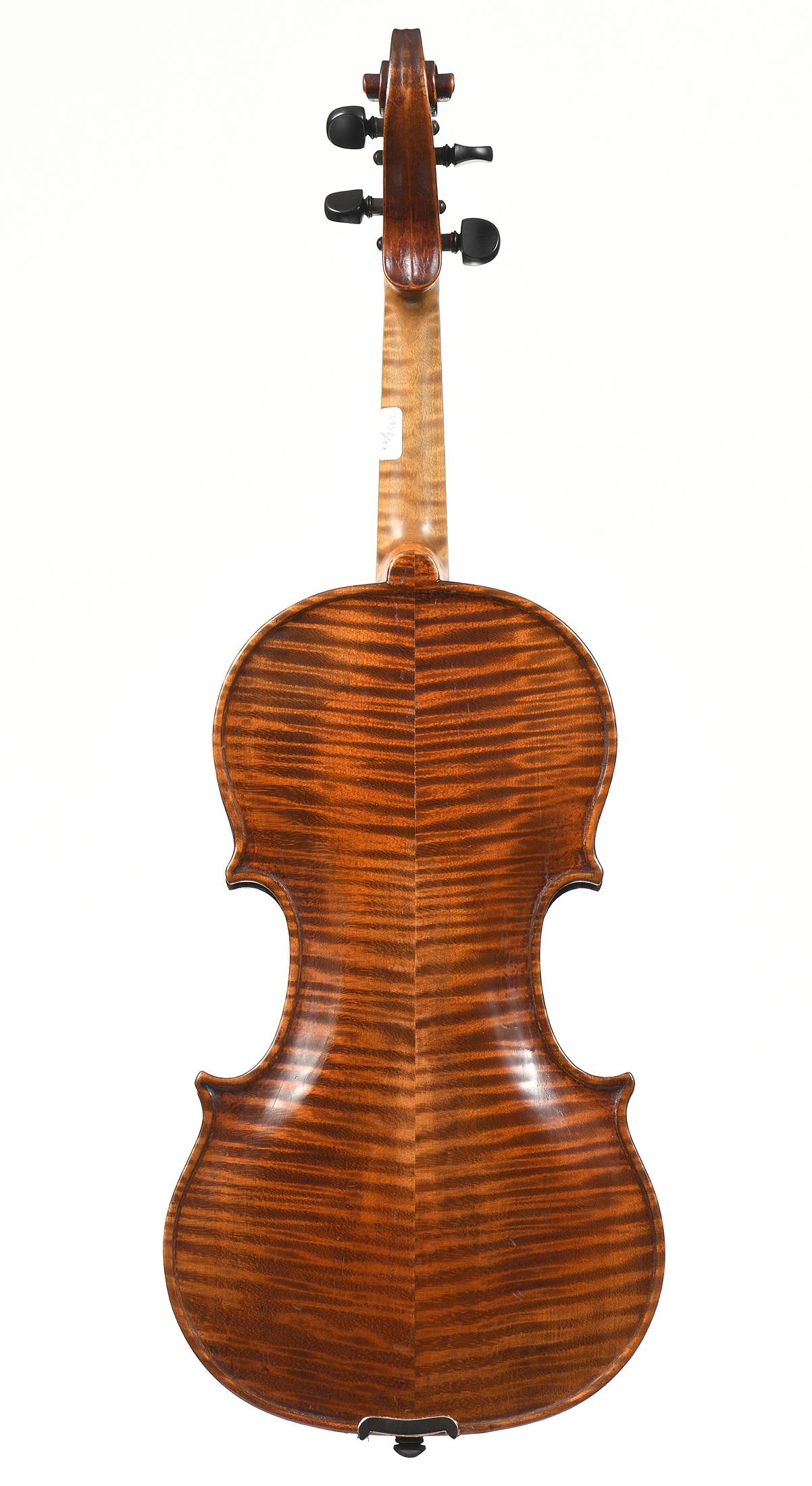 portant une étiquette "John JUZEK. Violin maker in Prague. 1910...". Fond de deux pièces en très bel érable. Table en épicéa aux pores serrés. Vernis brun sur fond doré. Avec boite et archet. 360 mm.