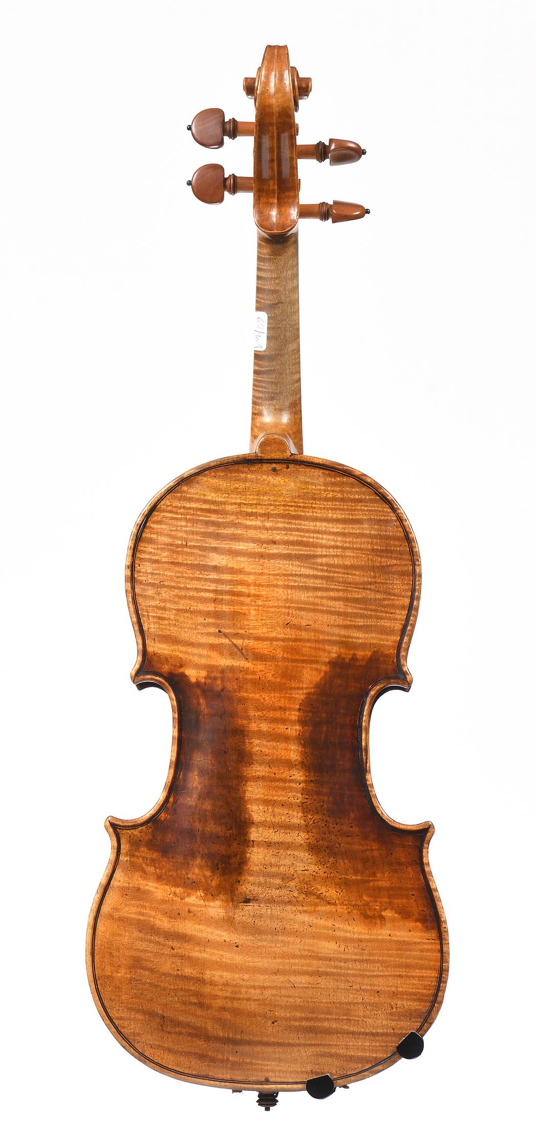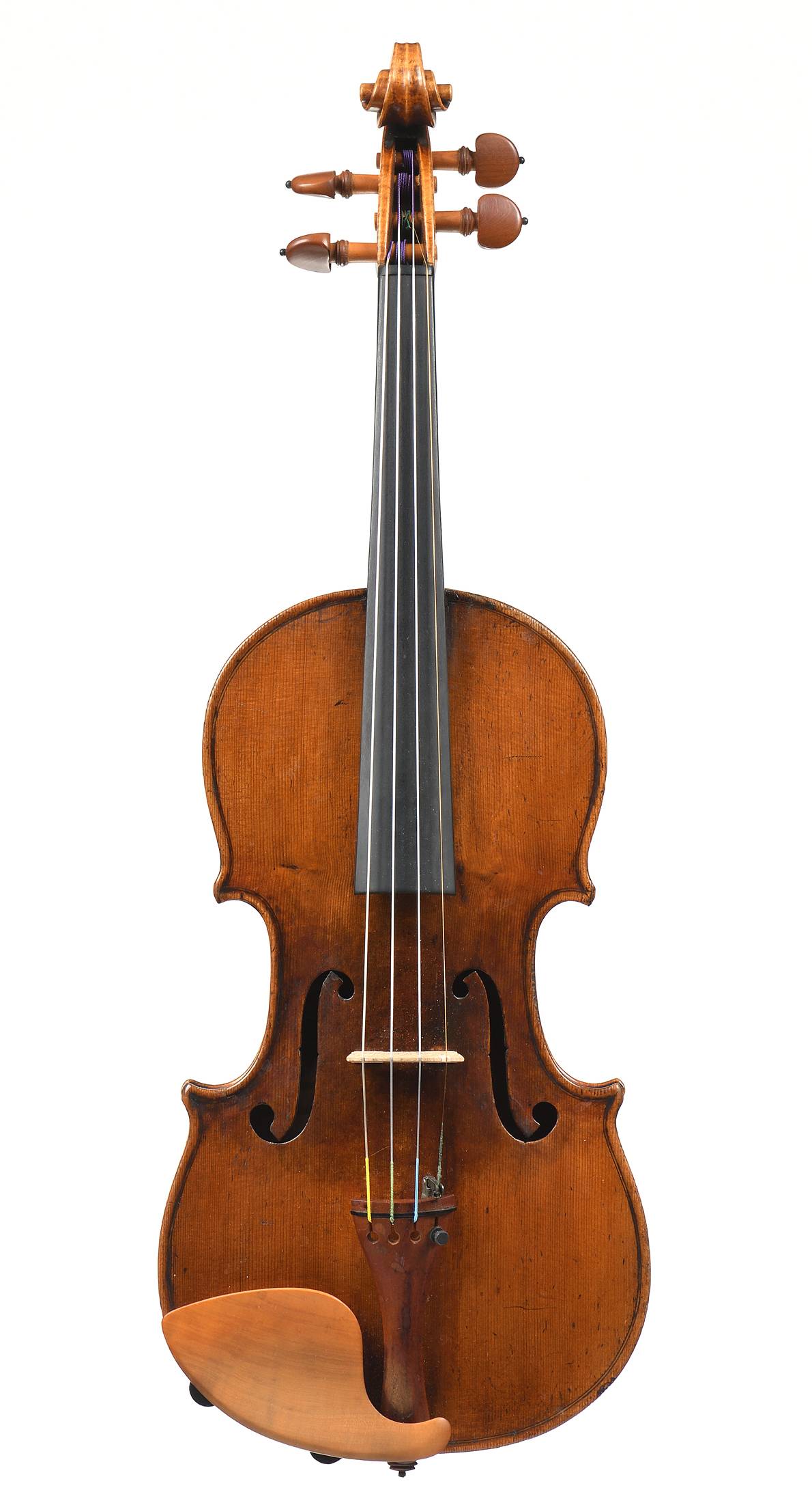 Intéressant violon arlequin. Fond et éclisse du même auteur, probablement de ALDRIC. Beau fond d'une pièce en érable. Vernis brun doré. 362 mm.