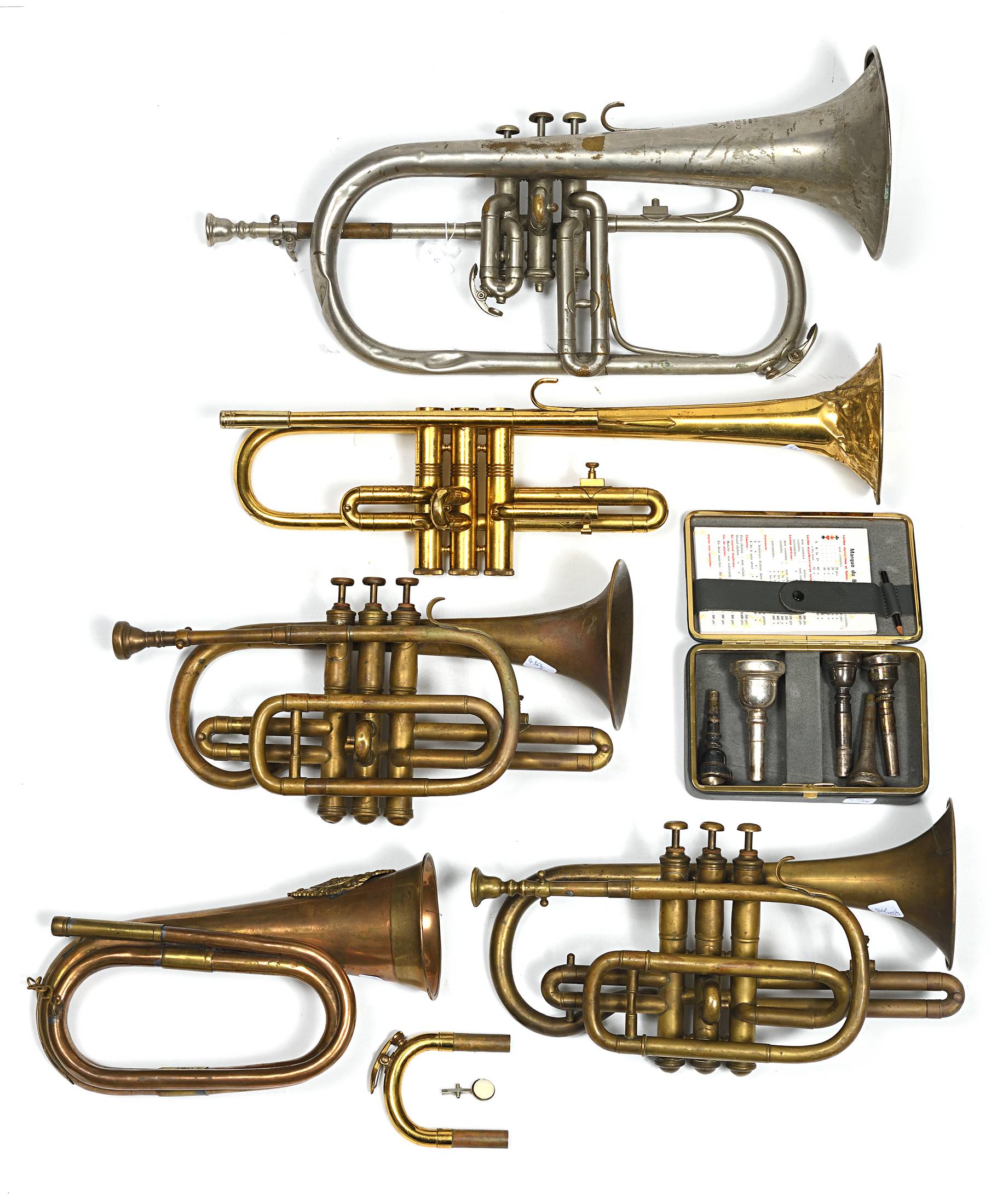Lot de divers instruments à vent cornets, trompettes. Avec embouchures.