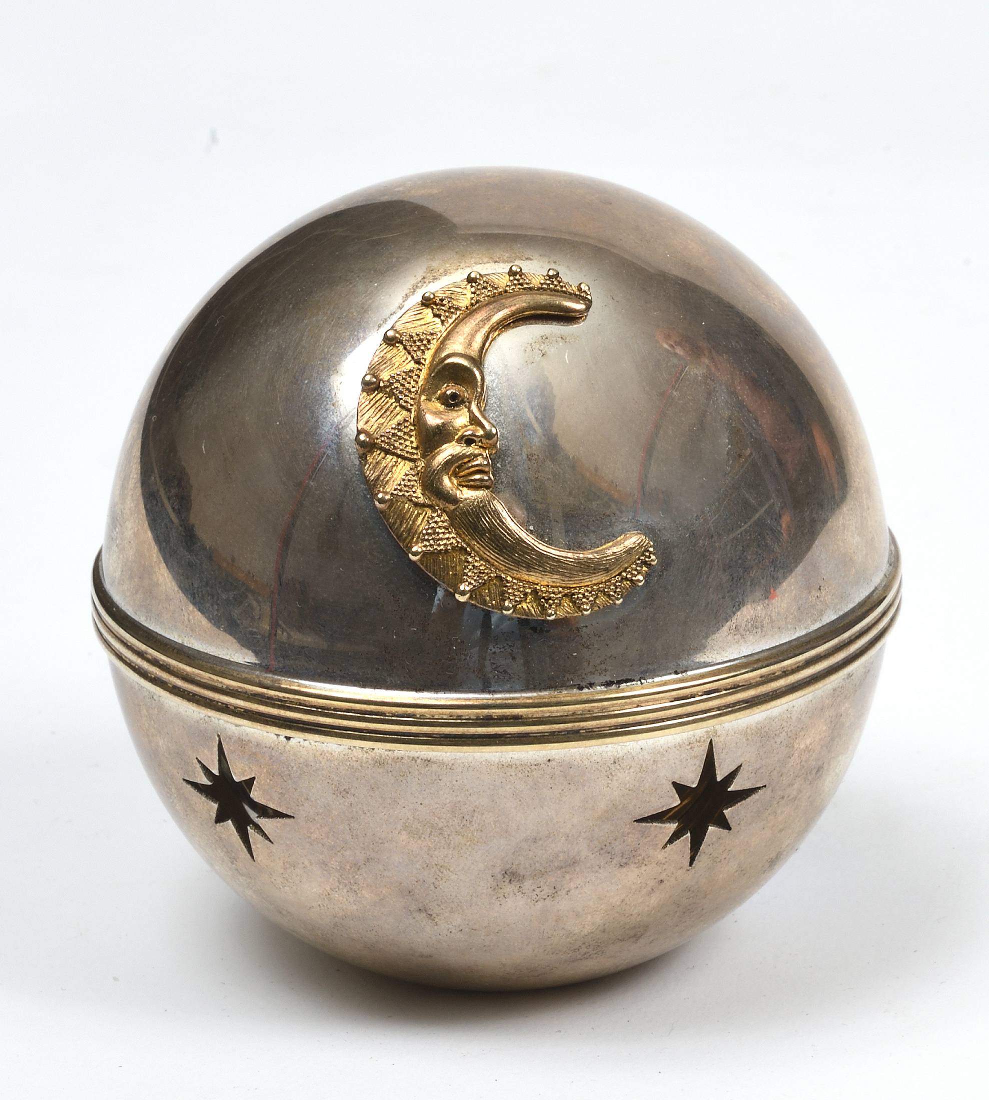 Petite boite à musique en argent et décorée d'une lune en métal doré et d'étoiles ajourées. Portant la marque "Charles REUGE. Eine Kleine Machtmusik". 8 x 8 cm