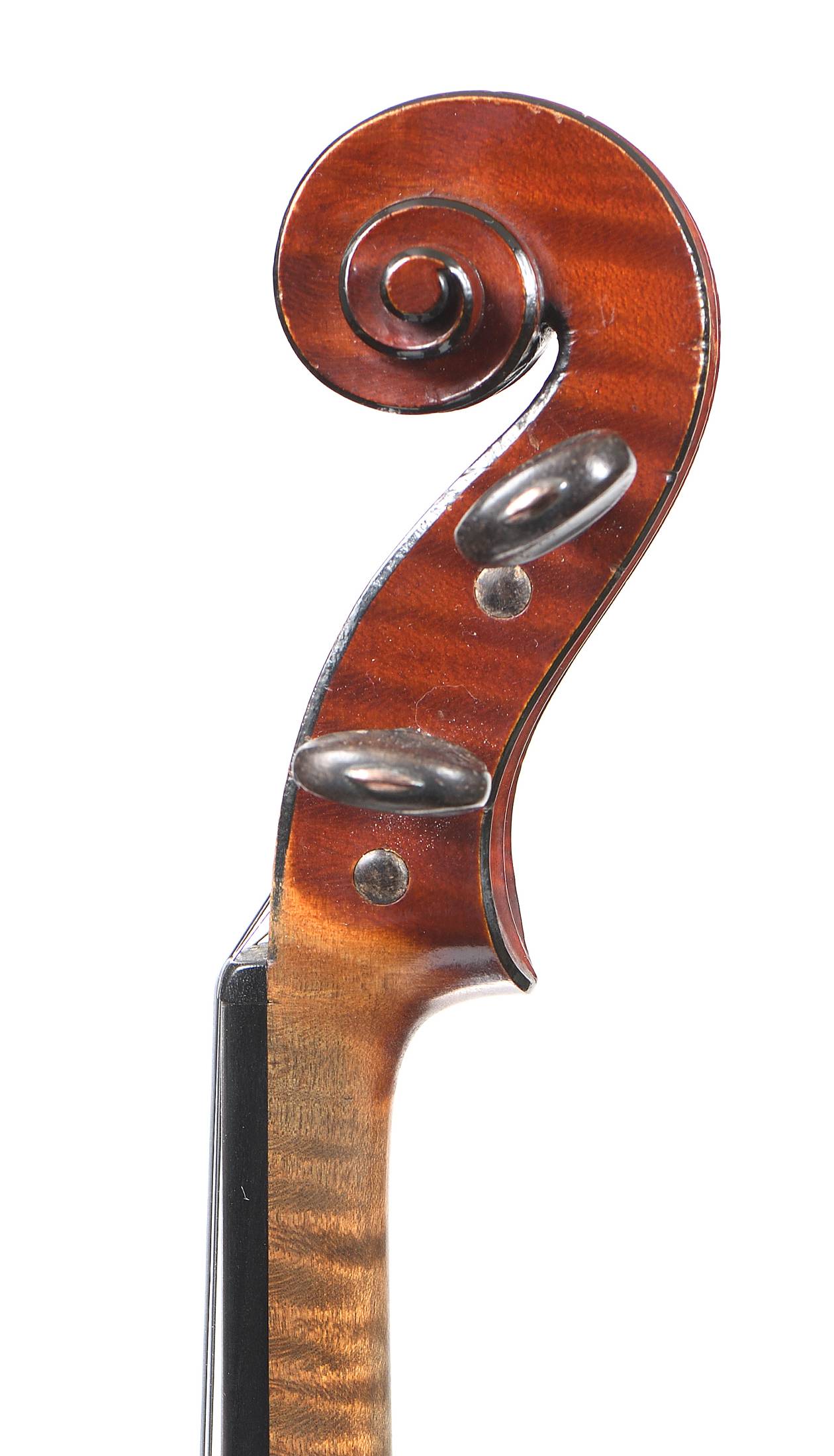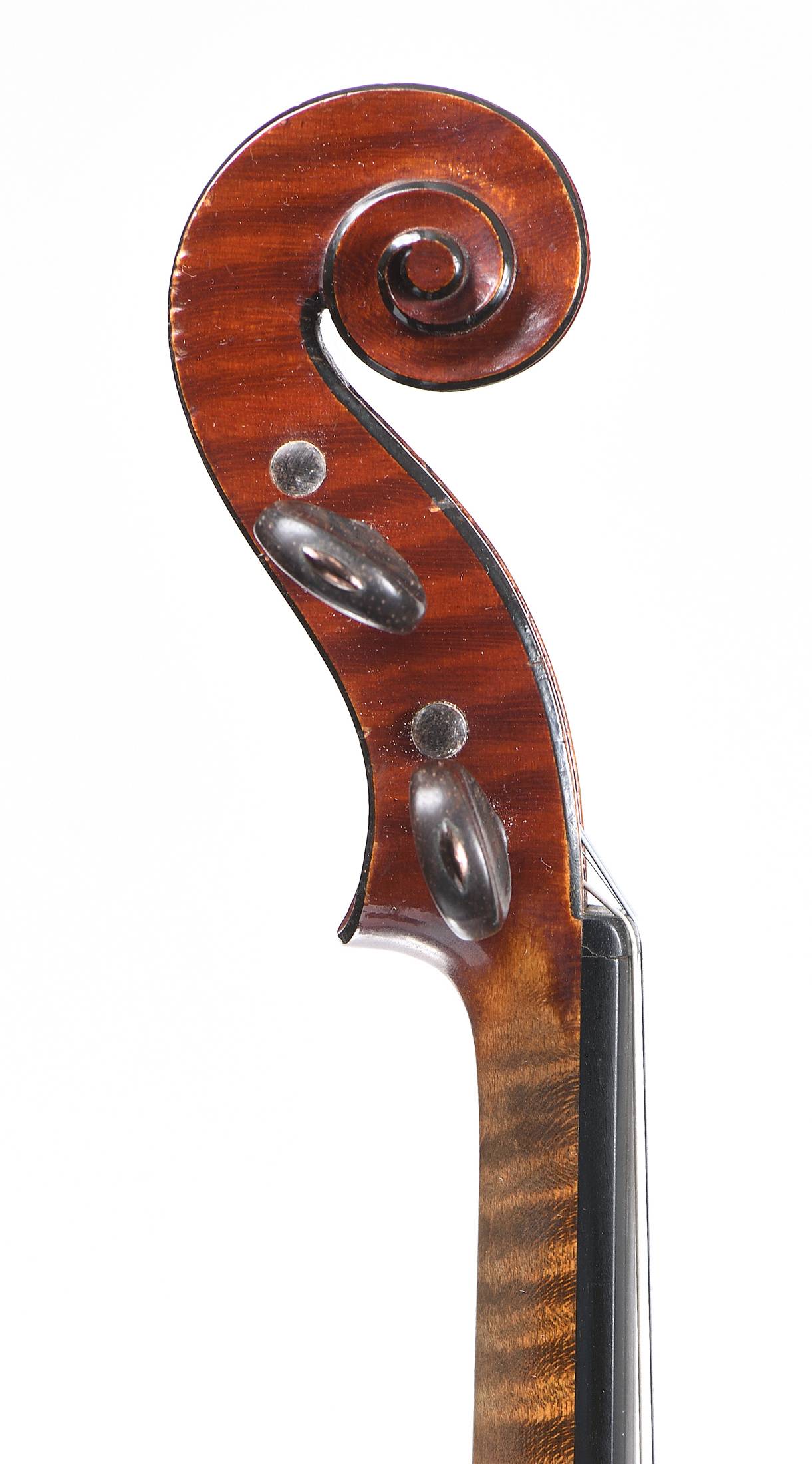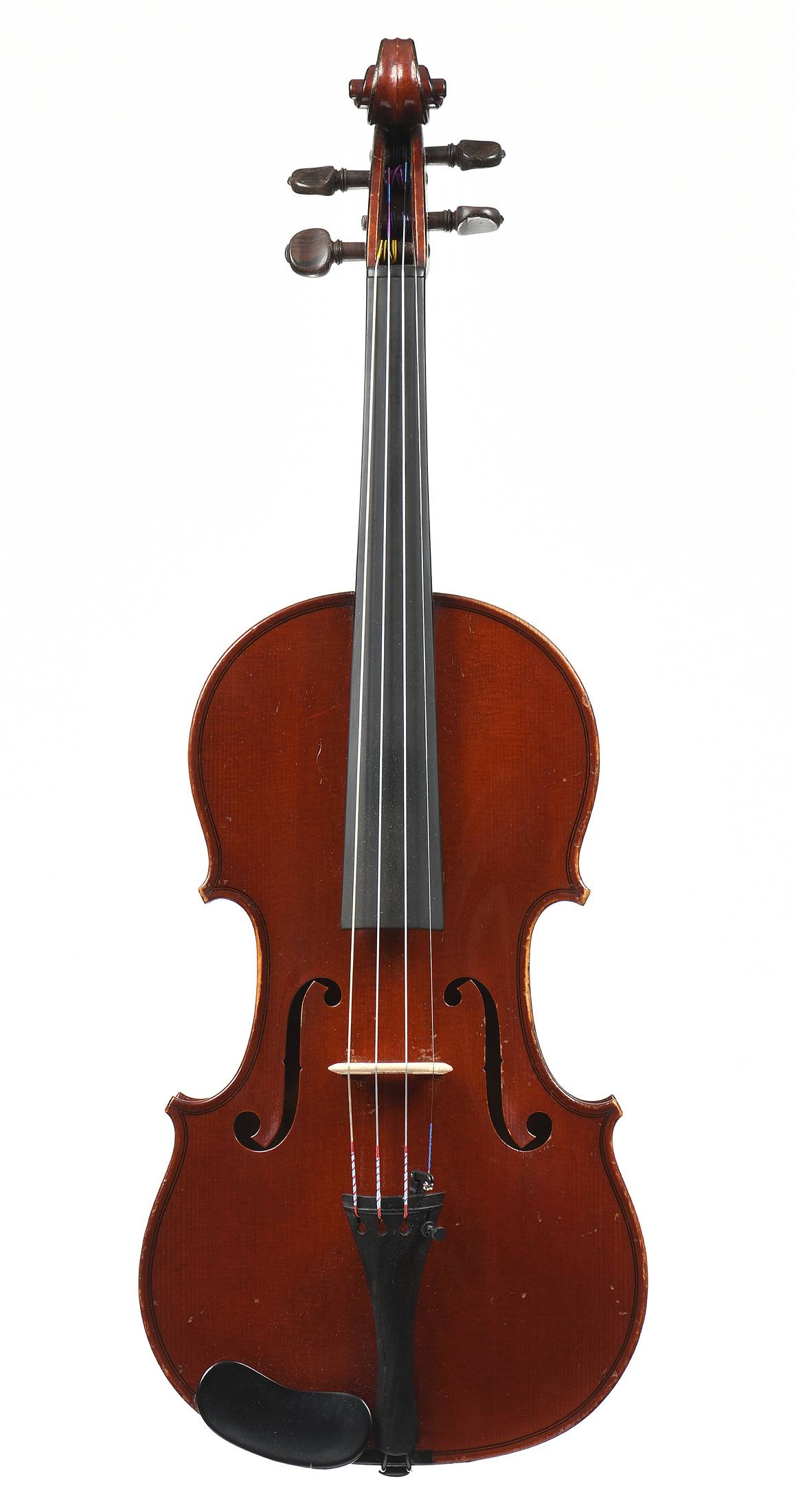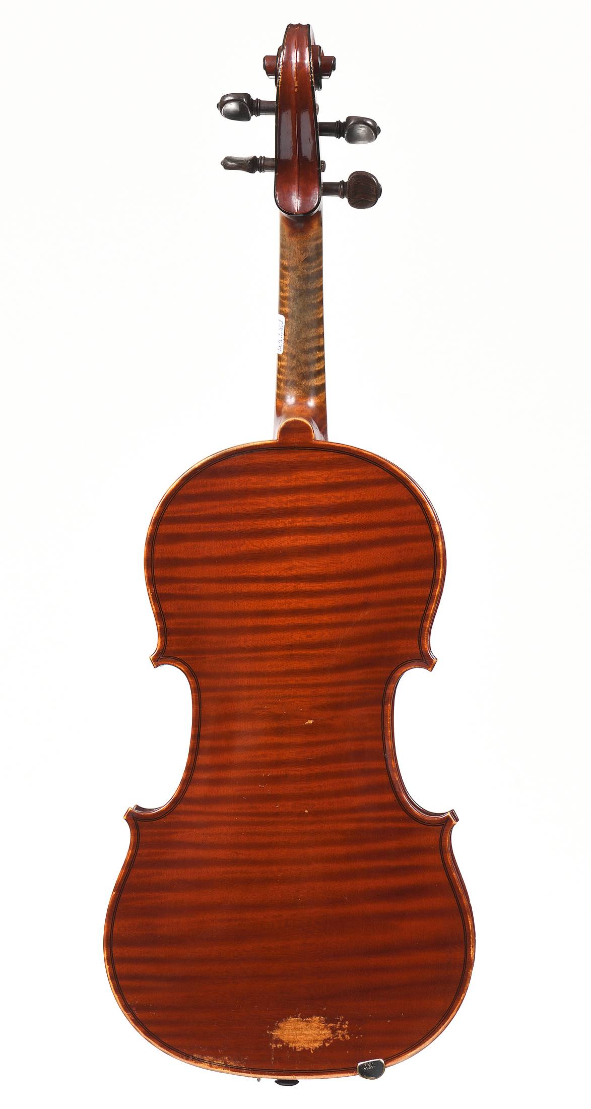 dont il porte l'étiquette originale "GAND & BERNARDEL Luthiers du conservatoire de Musique. Paris 1889." Numéroté 1417, et la marque au fer "GAND ET BERNARDEL". Fond d'une pièce en bel érable aux onde régulières. Table de deux pièces en épicéa aux pores plutôt fins au centre, s'élargissent sur les bords. Beau vernis brun rouge sur fond doré, typique de l'auteur. 360 mm.