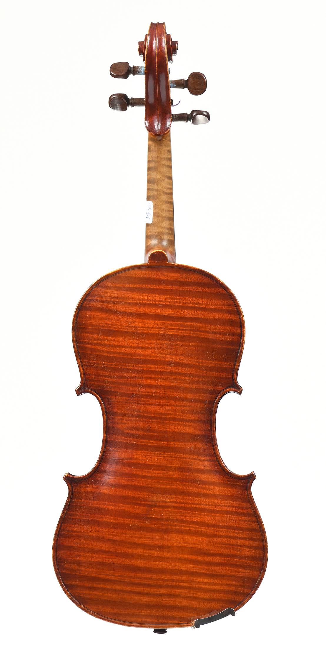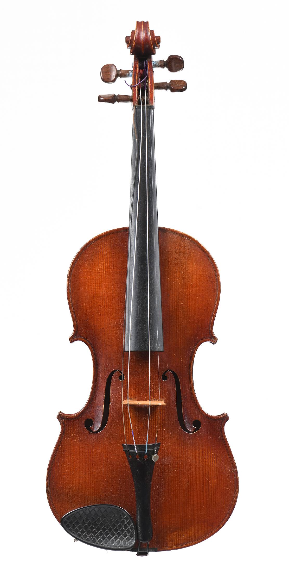 portant une étiquette et la signature " Jean Cadroy, ancien élève de l'école polytechnique. Paris... 1905. 4eme Strad 1905". Fond d'une pièce en bel érable. Vernis brun rouge sur fond doré. Table en épicéa aux pores moyennement larges et réguliers. 360 mm. Avec boite et archet sans valeur.