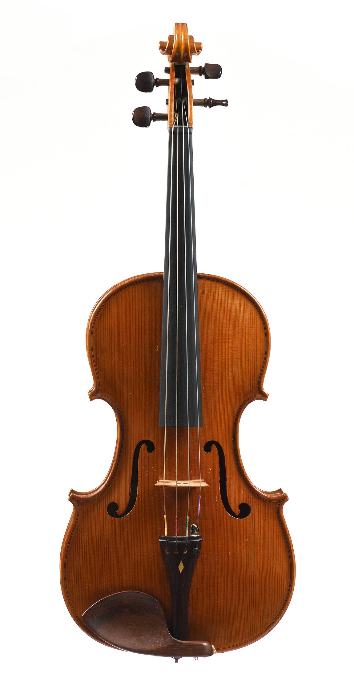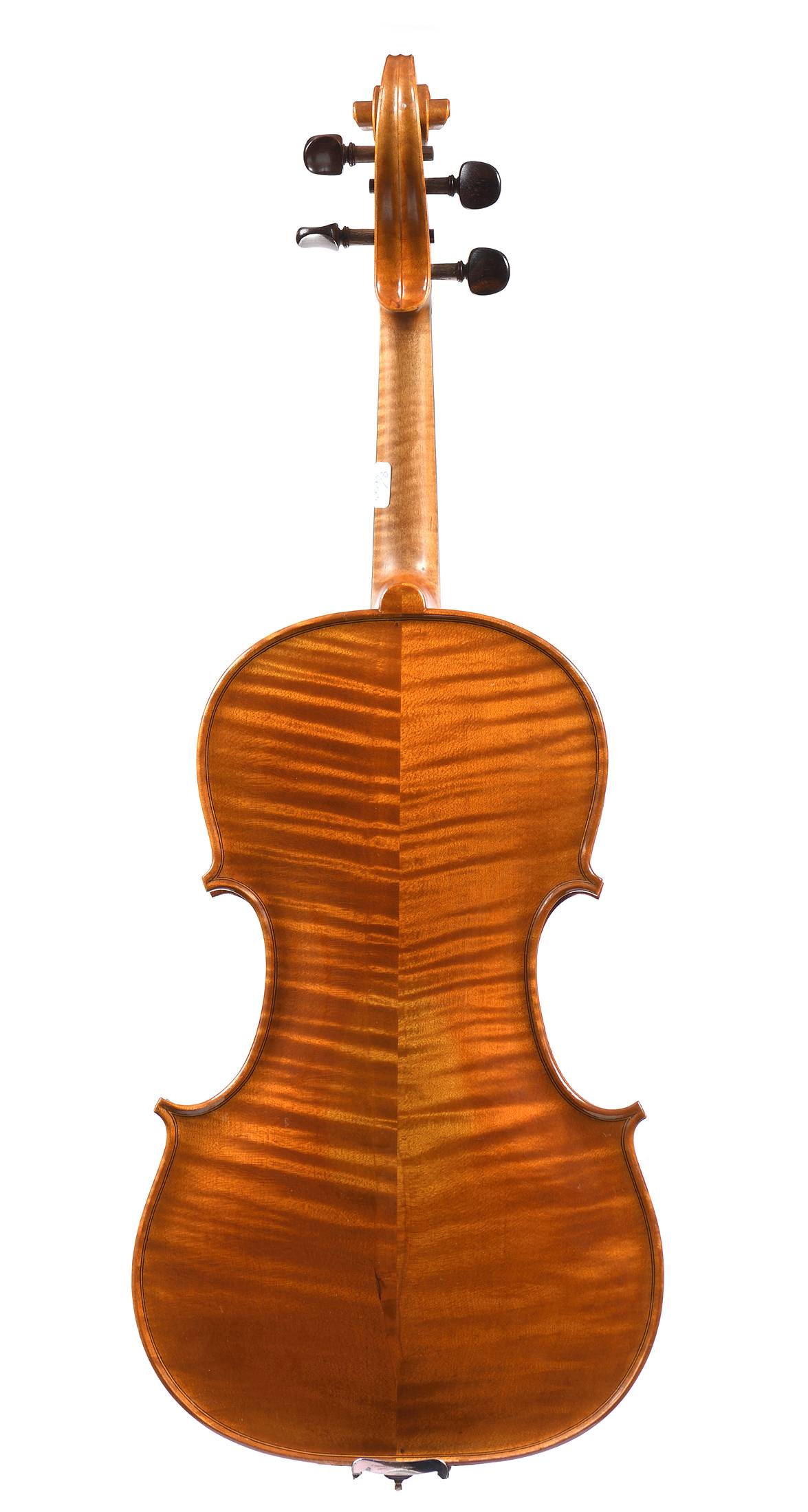 portant une étiquette "D'après Nicolaus Amatus Cremonia..." et une deuxième étiquette "René Jacquemin 1935". Fond de deux pièces en bel érable aux belles ondes flammées montantes. Table en épicéa aux pores moyennement large. Vernis brun doré. 415 mm.