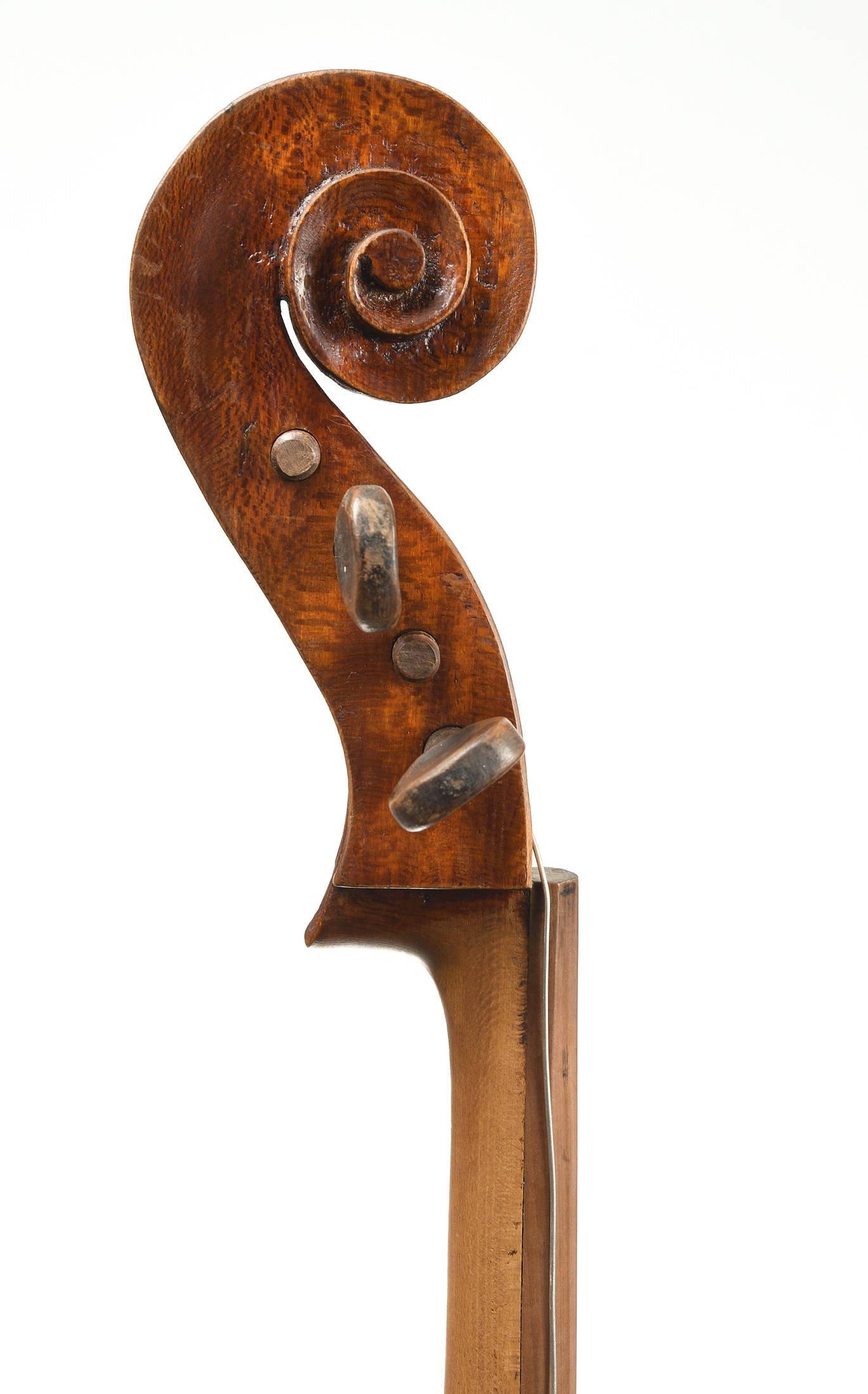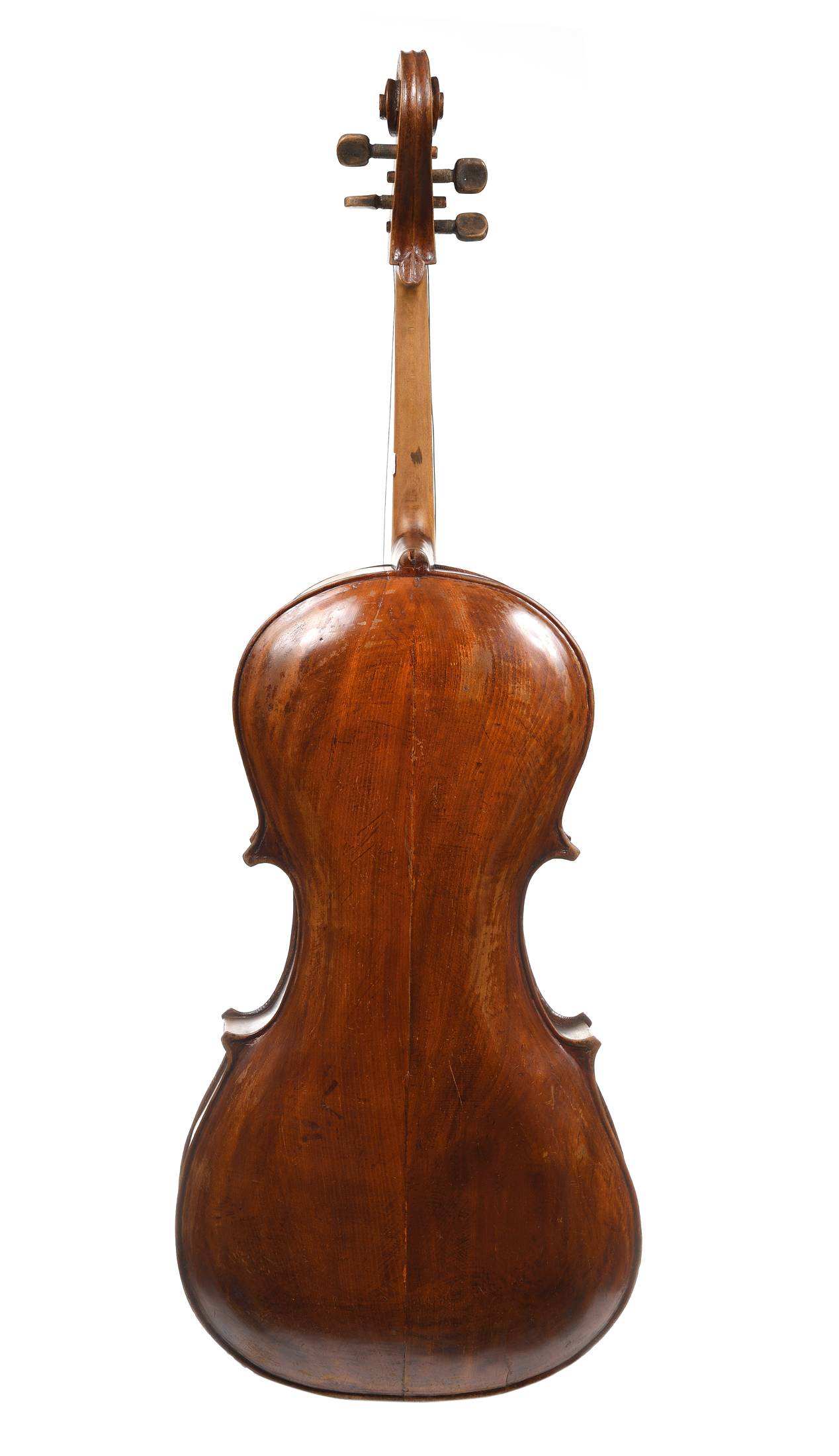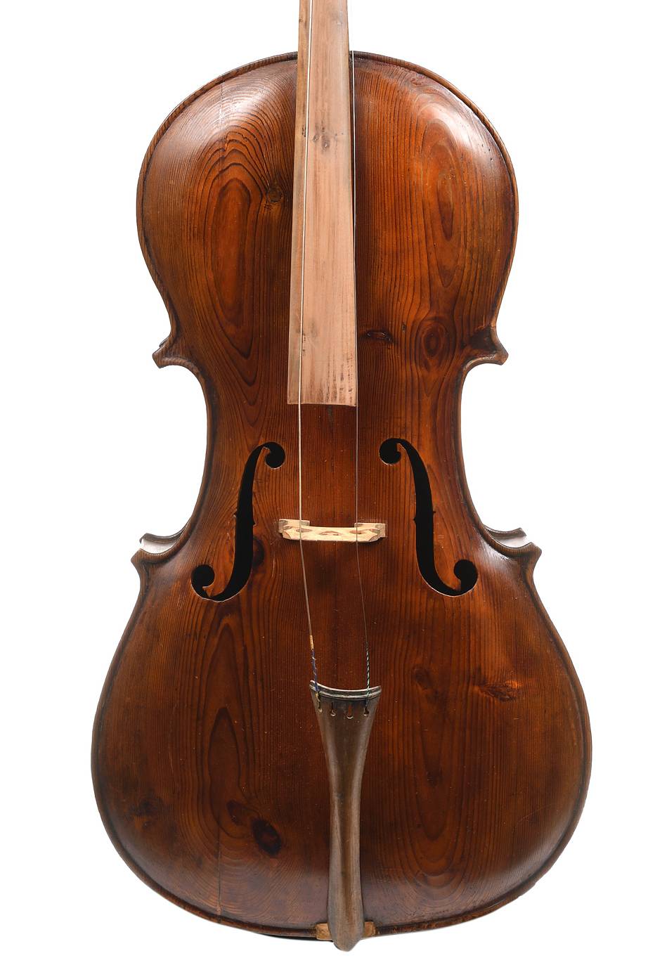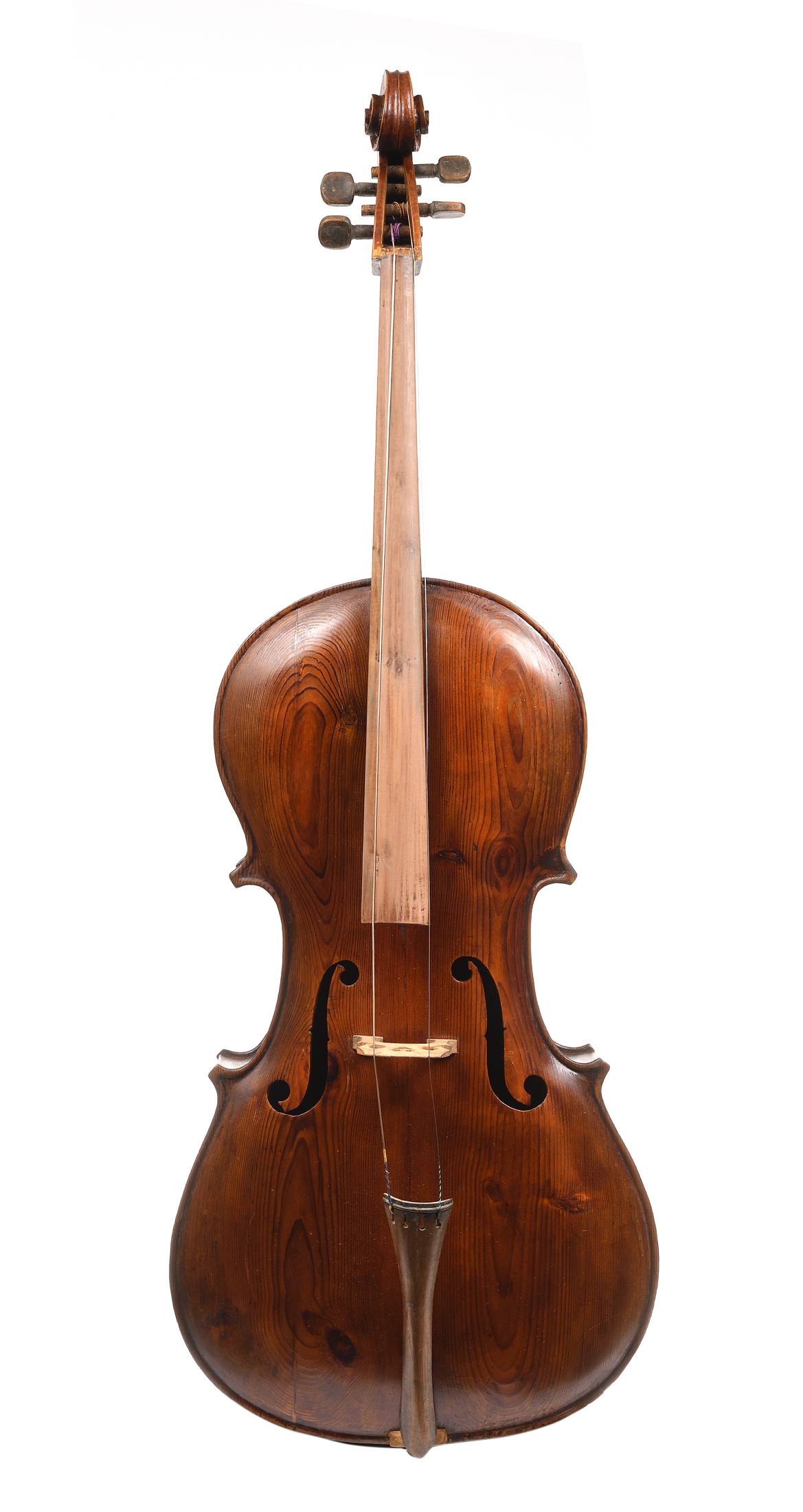 Intéressant violoncelle d'amateur, portant une étiquette illisible. Fond de deux pièces en platane. Eclisses d'un autre bois. Table en sapin.