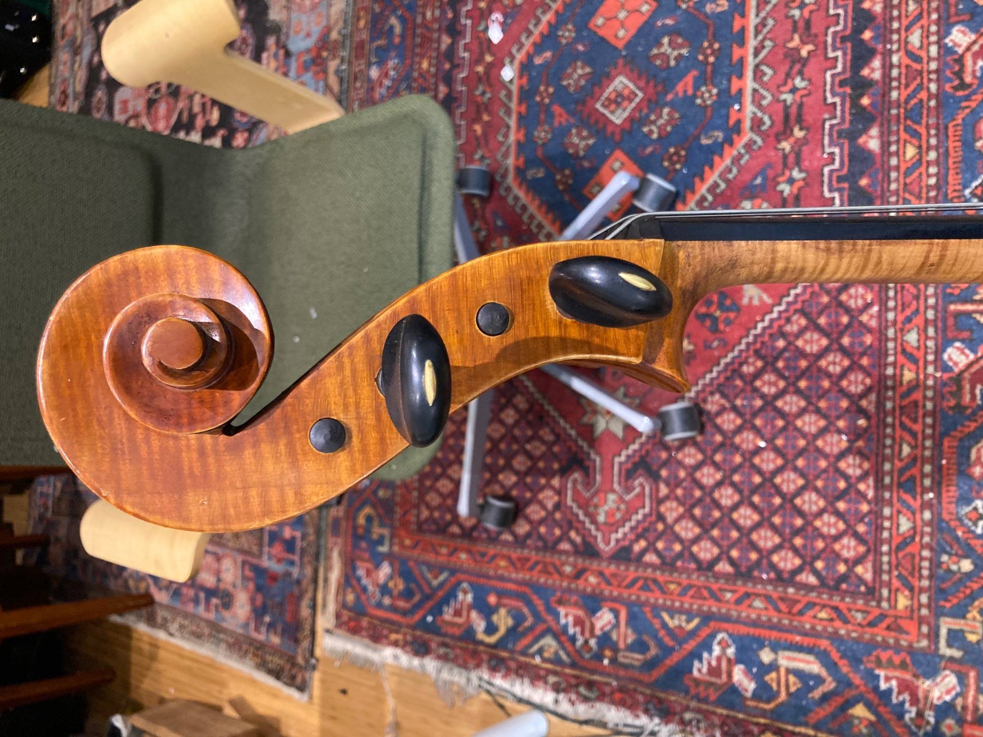 portant une étiquette "Modèle d'après Antonius Stradivarius...", "Alphonse Pillyser...". et une marque au fer sous le talon du manche. Fond de deux pièces en érable. Vernis brun sur fond doré. 765 mm.