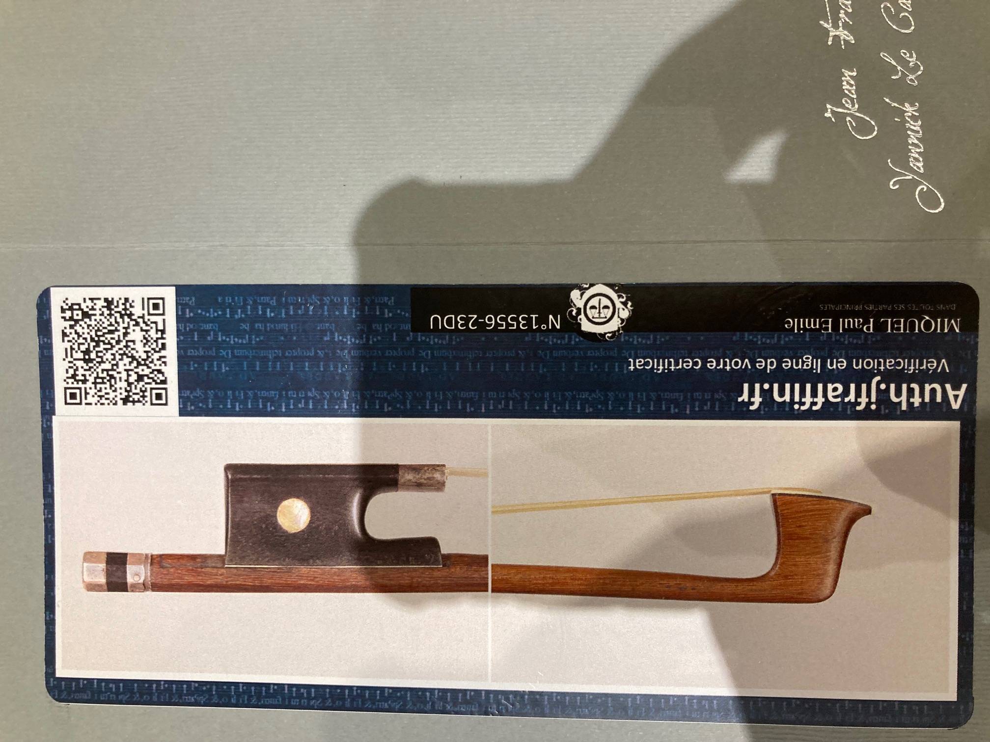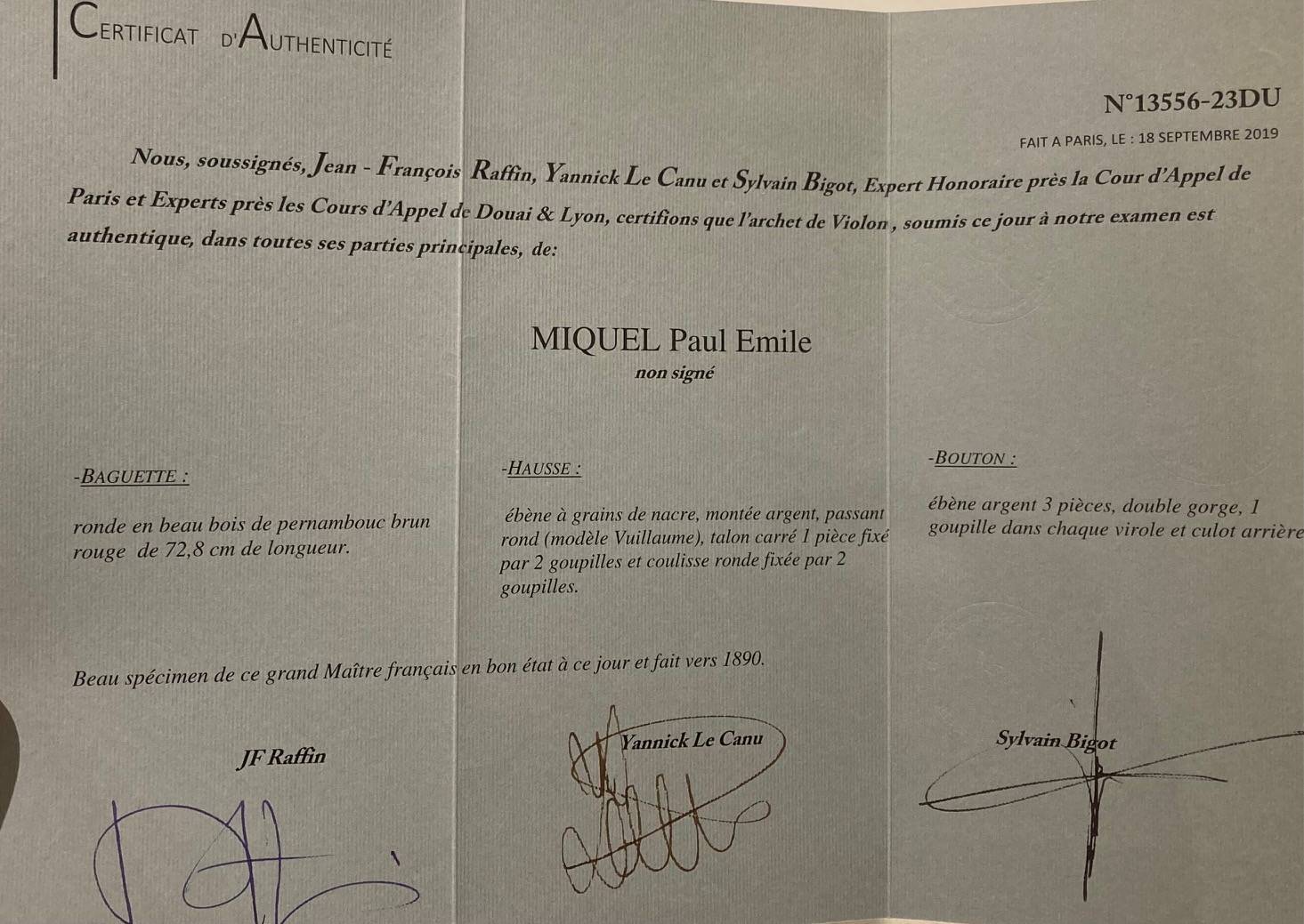 French violin bow by Paul Emile MIQUEL. JF RAFFIN certificate.