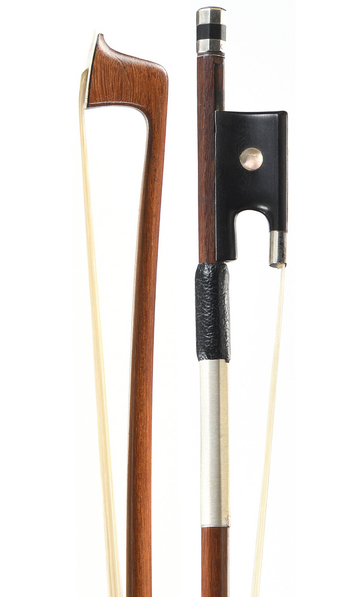 Baguette ronde en bois de pernambouc. Hausse ébène, modèle Vuillaume, monté argent. 729 mm.