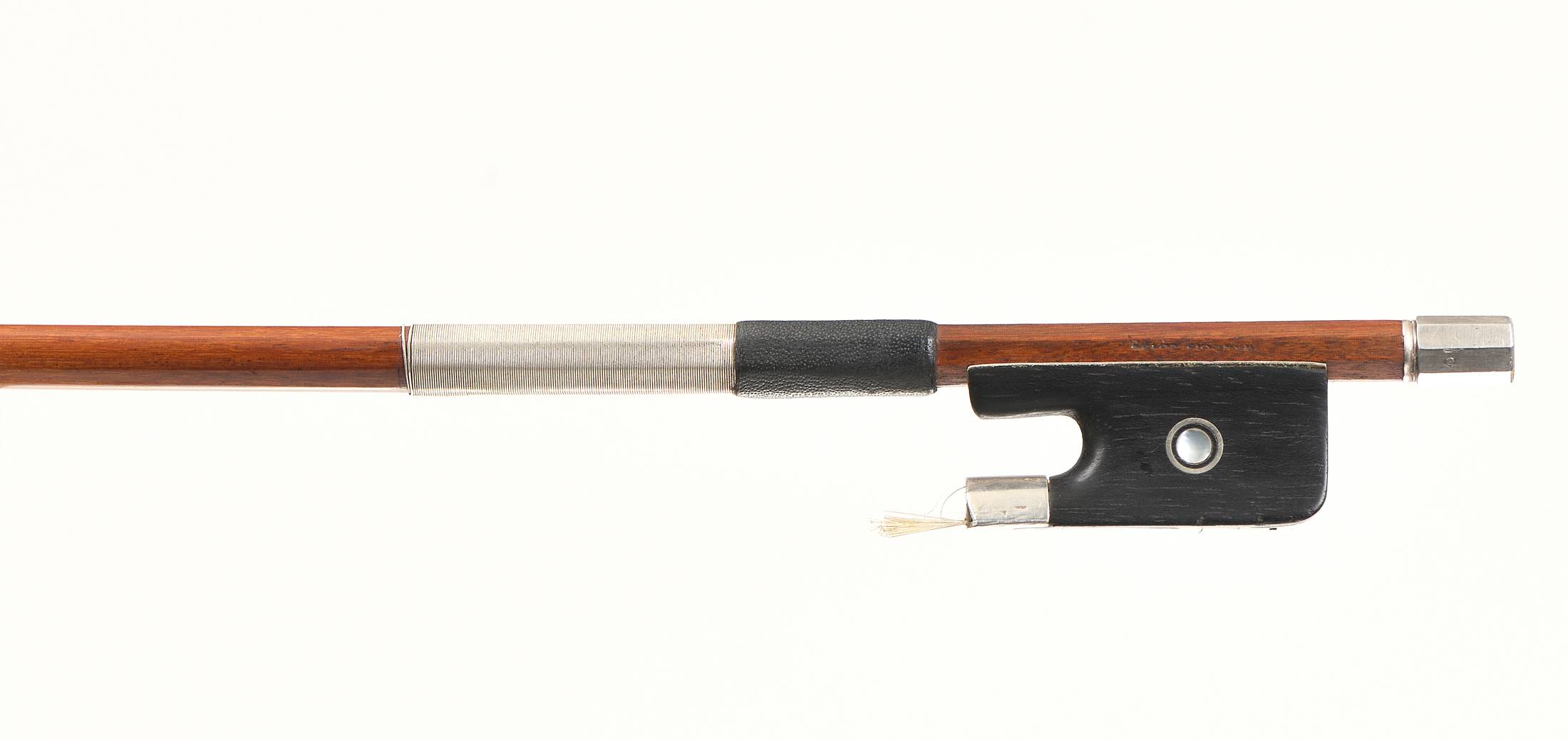 portant une marque au fer "FRANCOIS LOTTE". Baguette ronde en bois de pernambouc. Hausse ébène, monté argent. 730 mm.58 g sans mèche.
