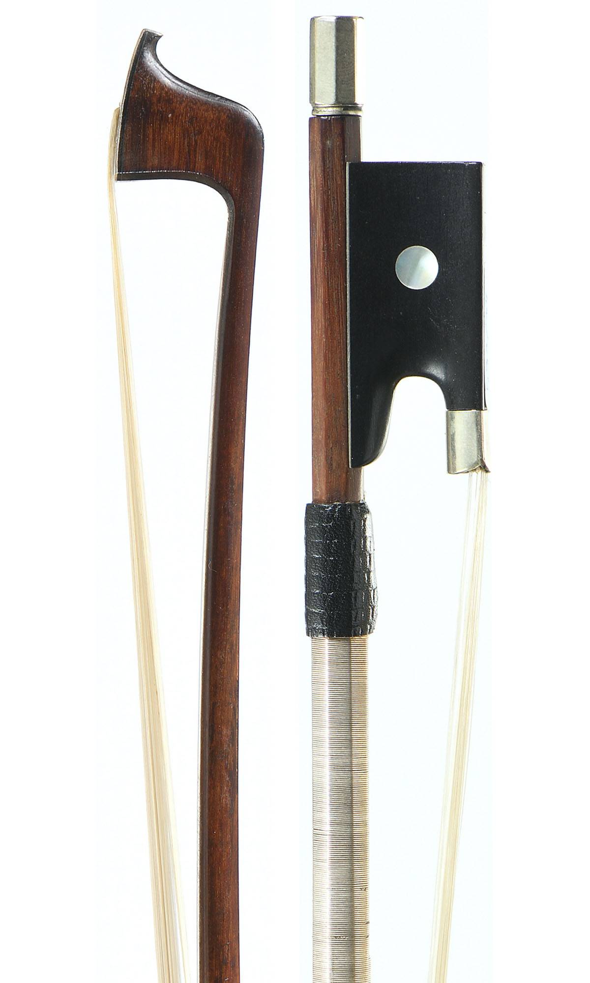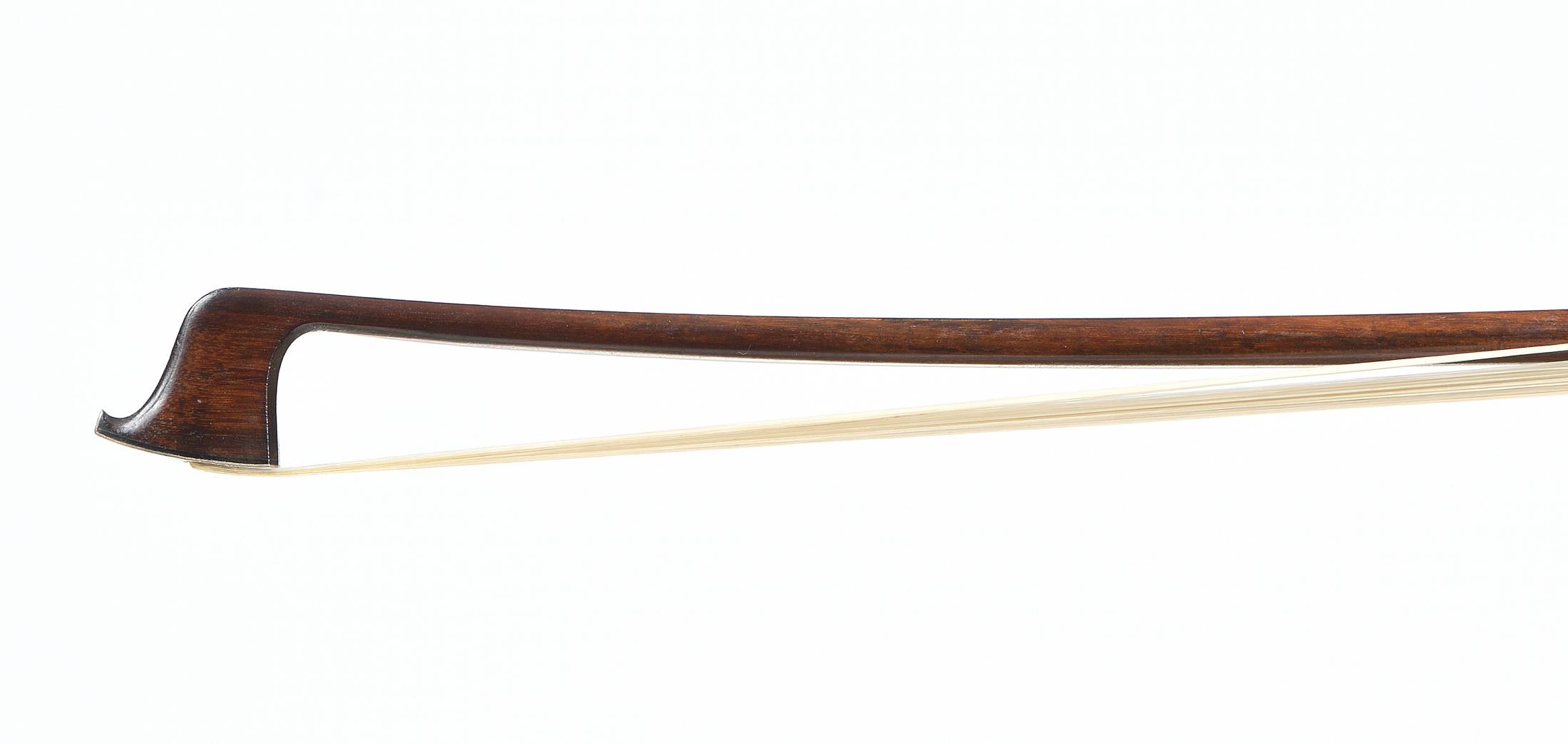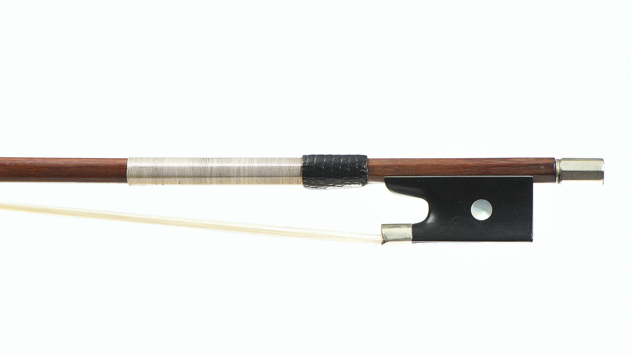 Baguette ronde en bois de pernambouc. Hausse ébène, monté maillechort. 63 g. 728 mm.