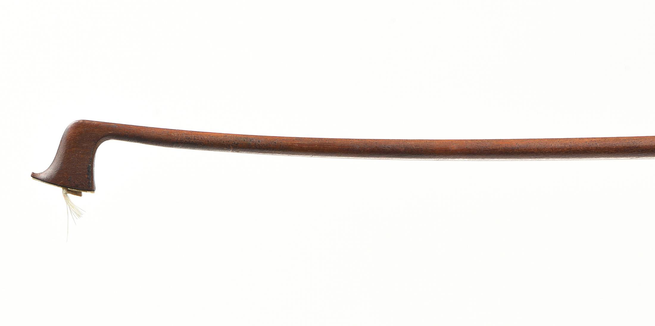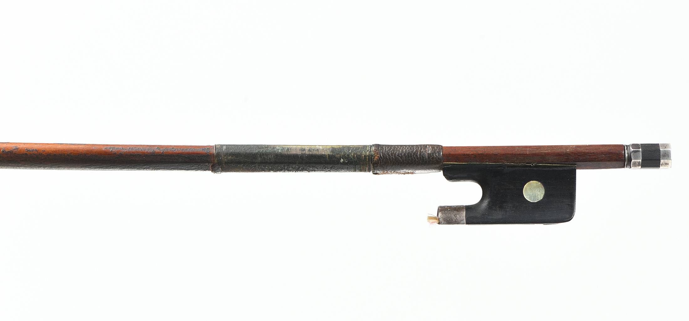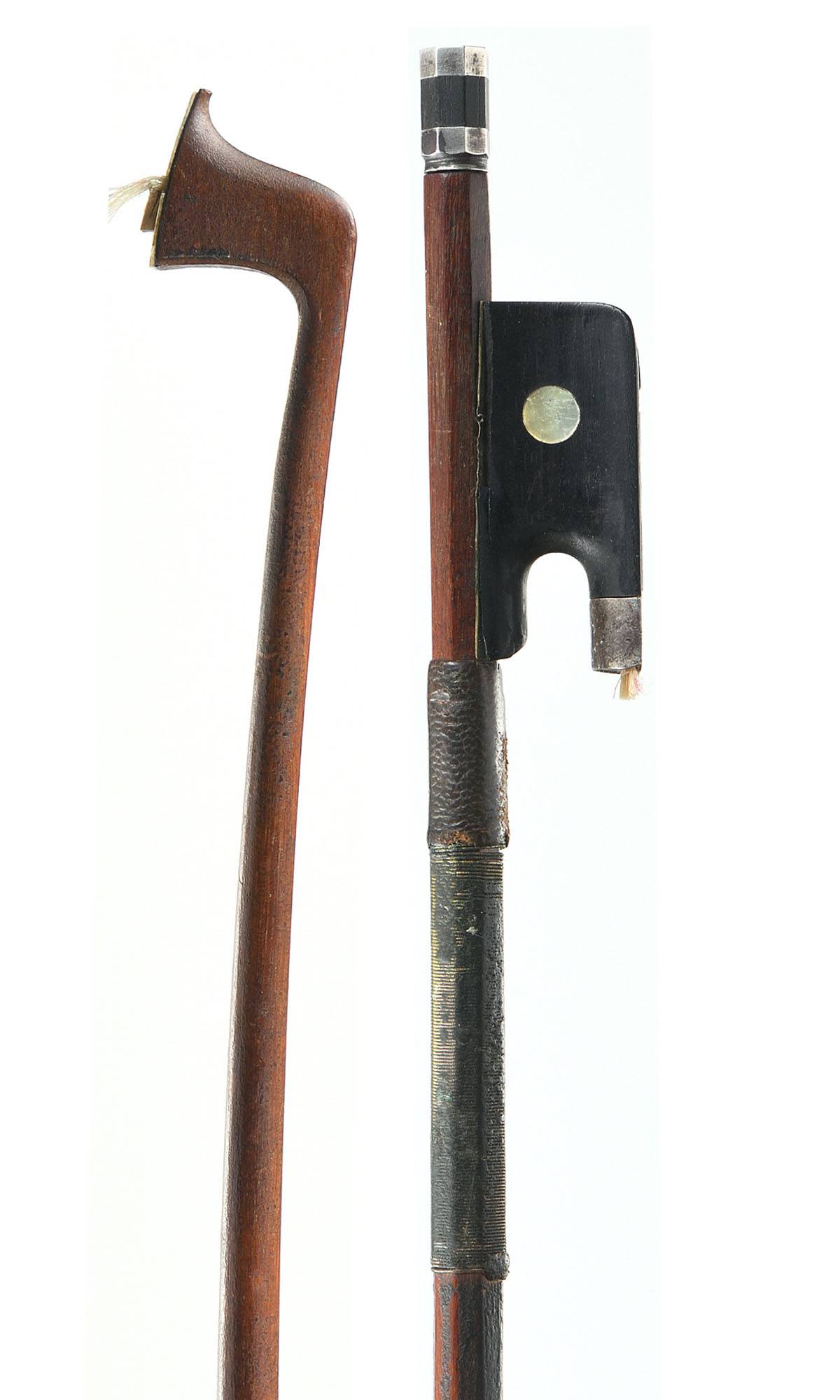 Baguette ronde en bois de pernambouc. Hausse ébène monté argent. 724 mm. 49g.