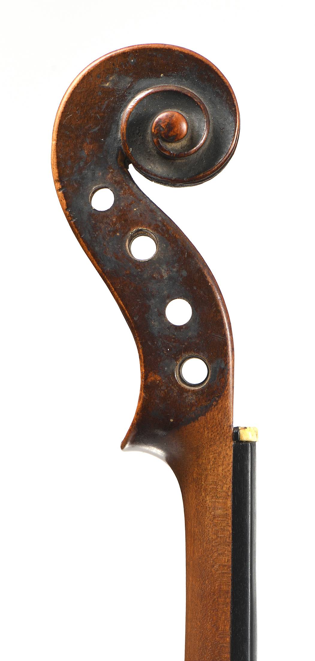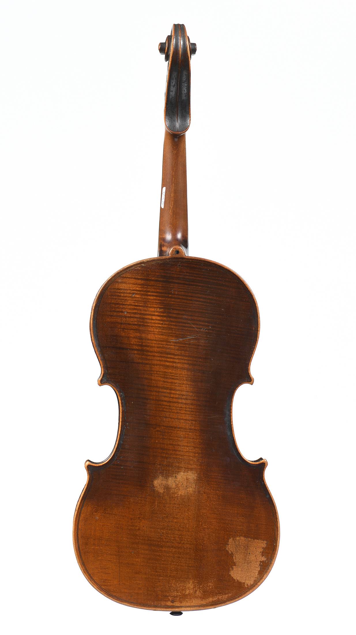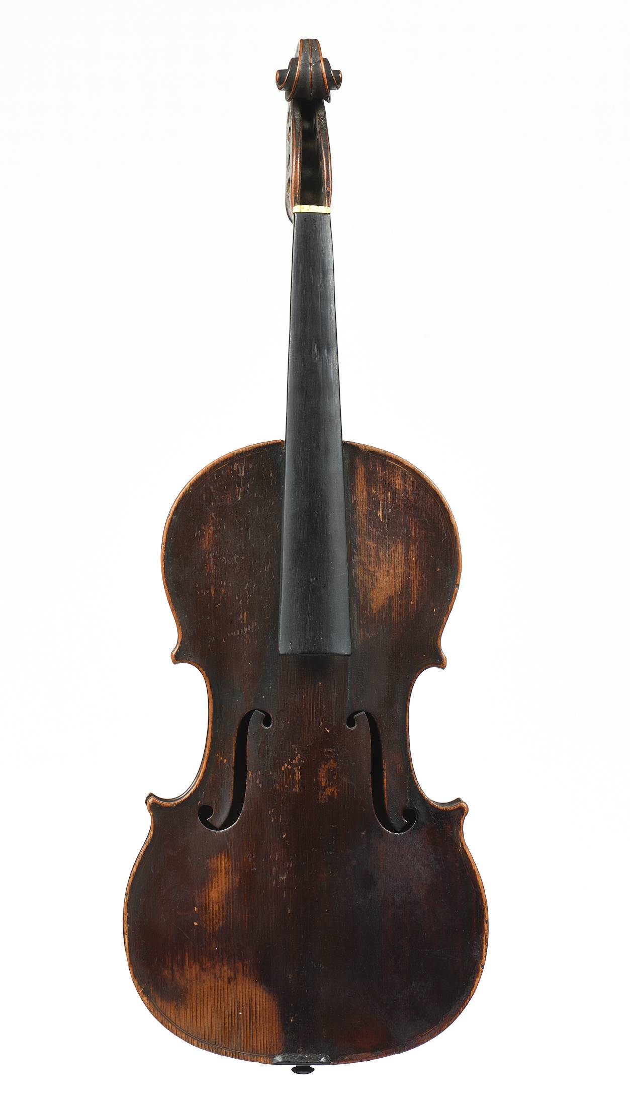 portant une marque au fer "NICOLAS MORLOT A LA VILLE DE CREMONE...". Fond d"une pièce en érable. Vernis brun sur fond doré. Diverses cassures de table. 366 mm.
