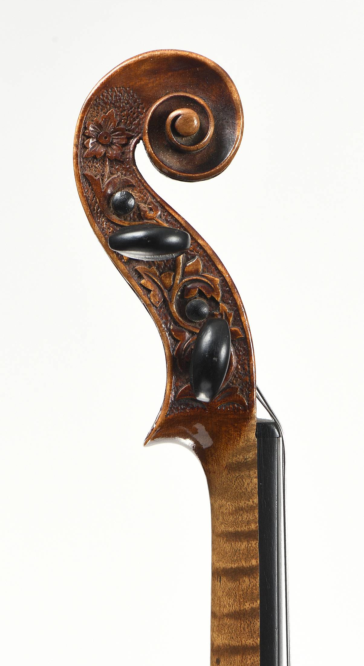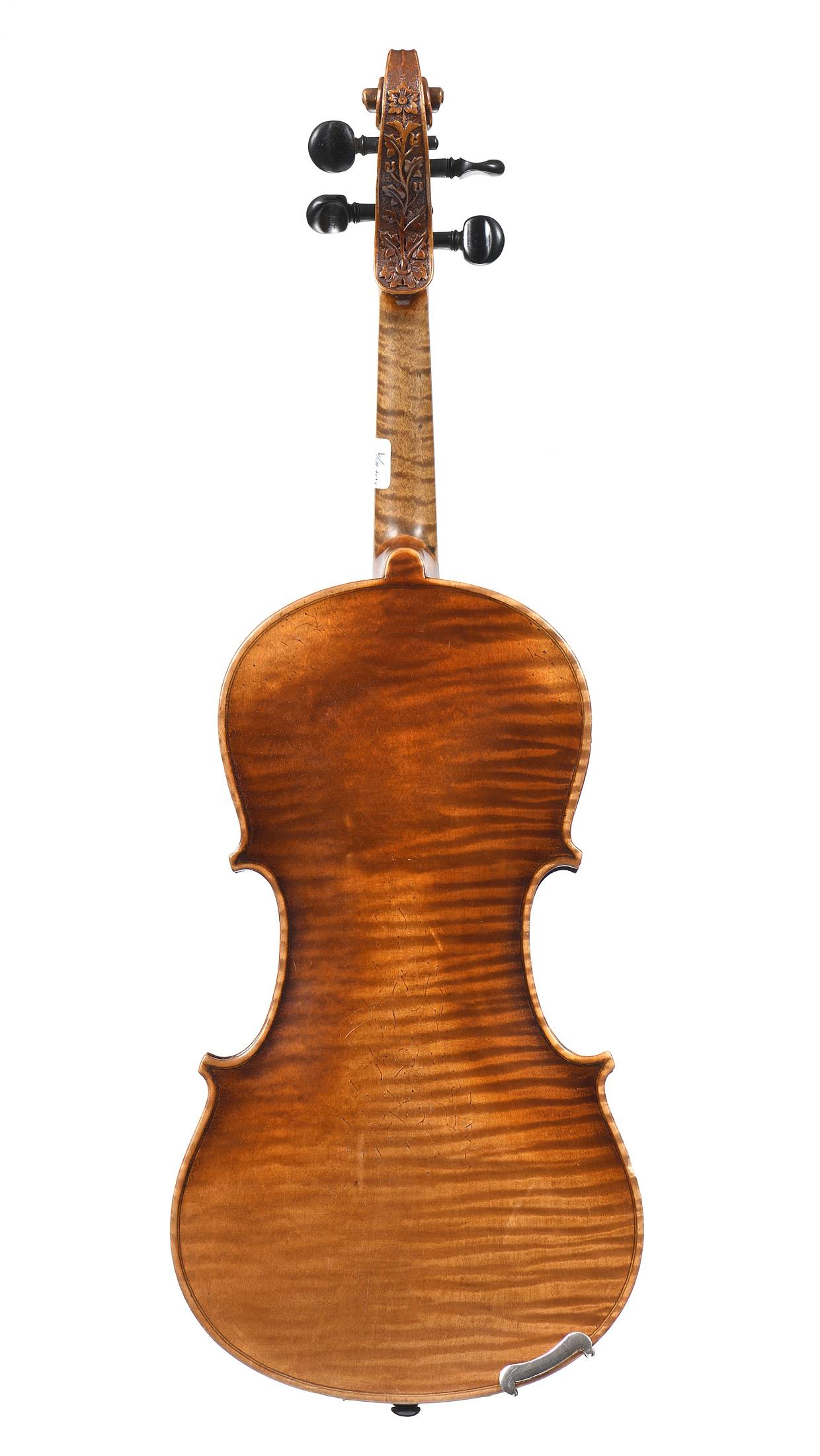 portant une étiquette " Antonius Stradivarius Cremonensis faciebat anno 1665". Fond d'une pièce en érable. Vernis brun doré. Tête sculptée de fleurs. 360 mm.