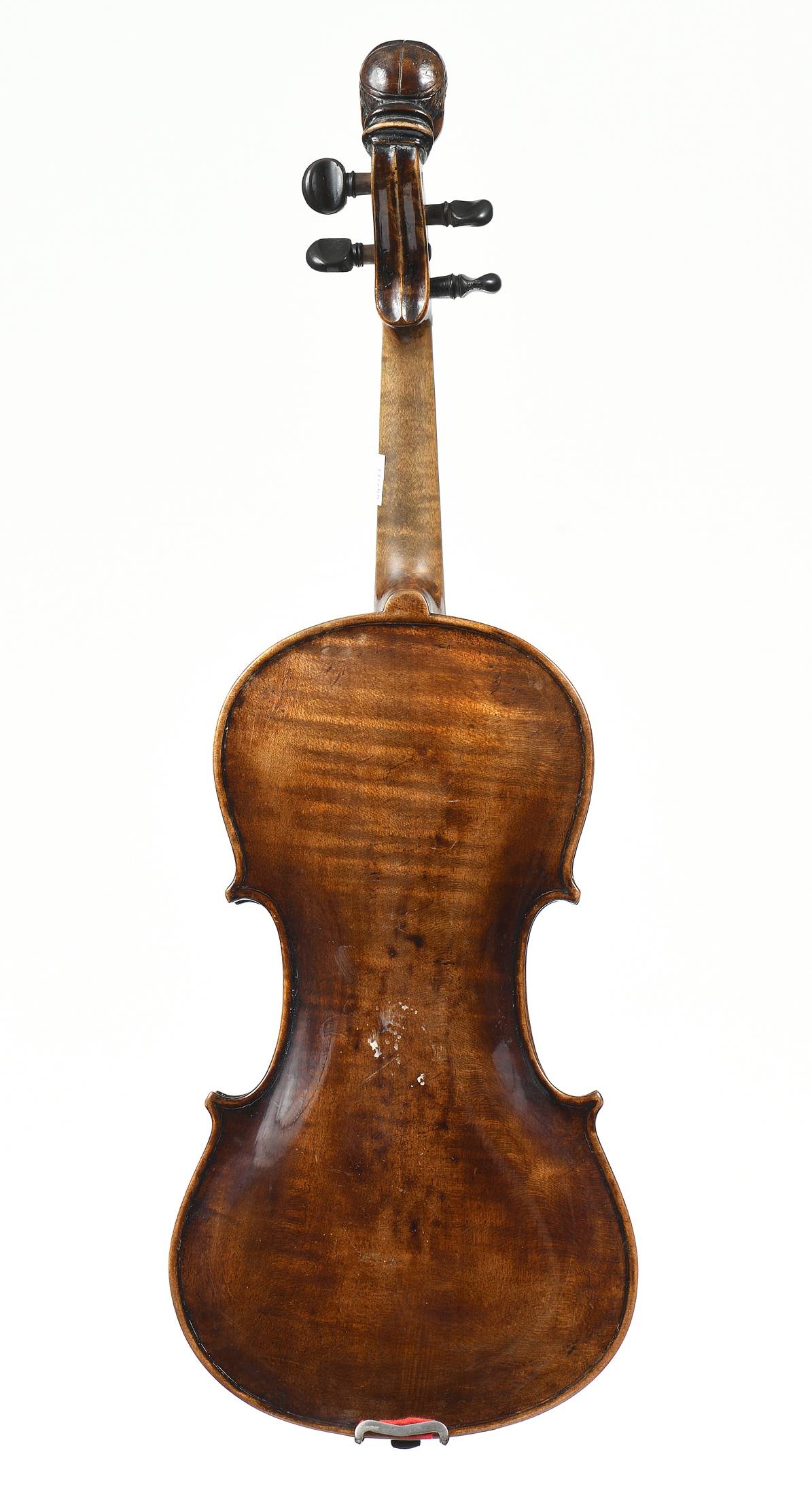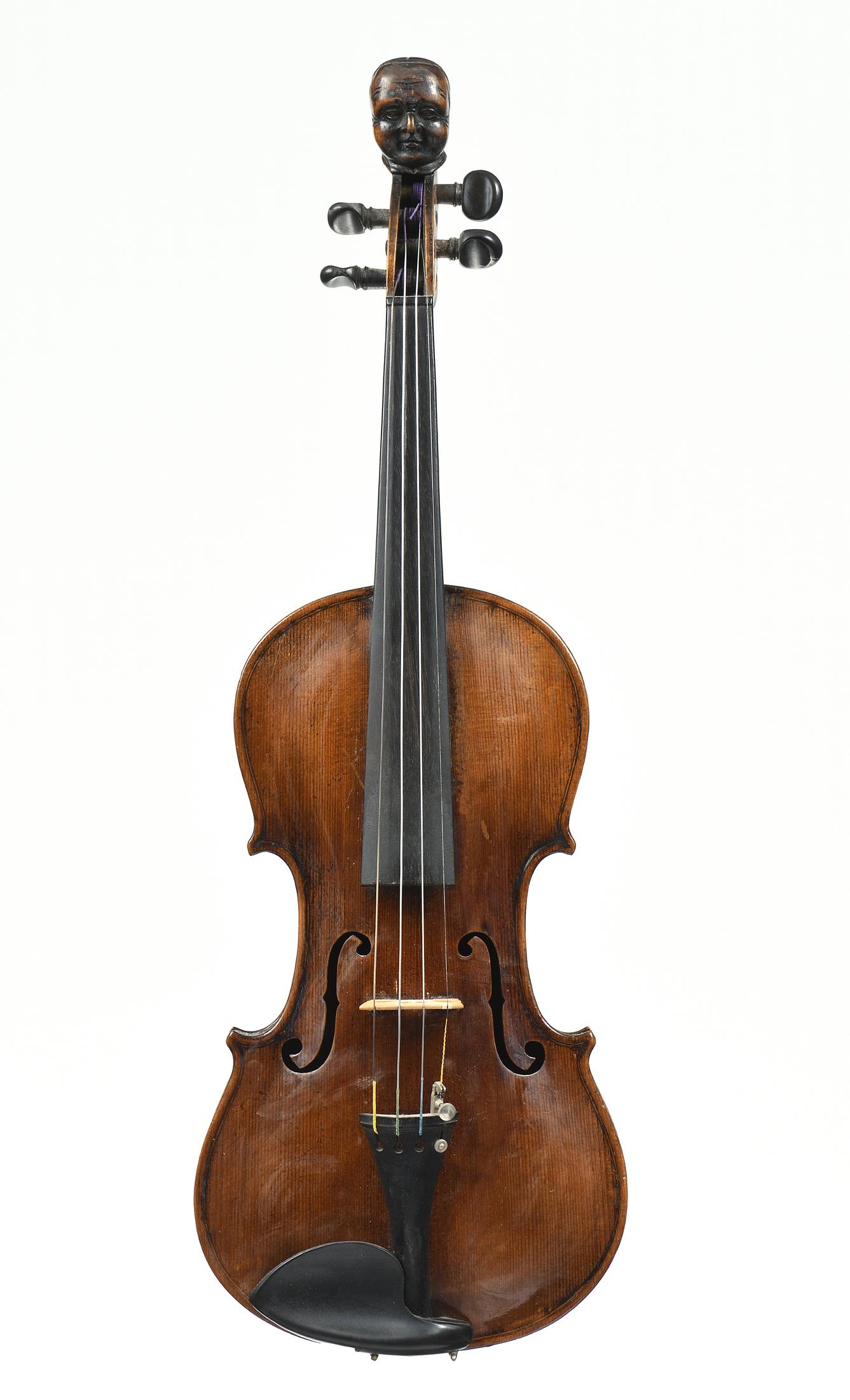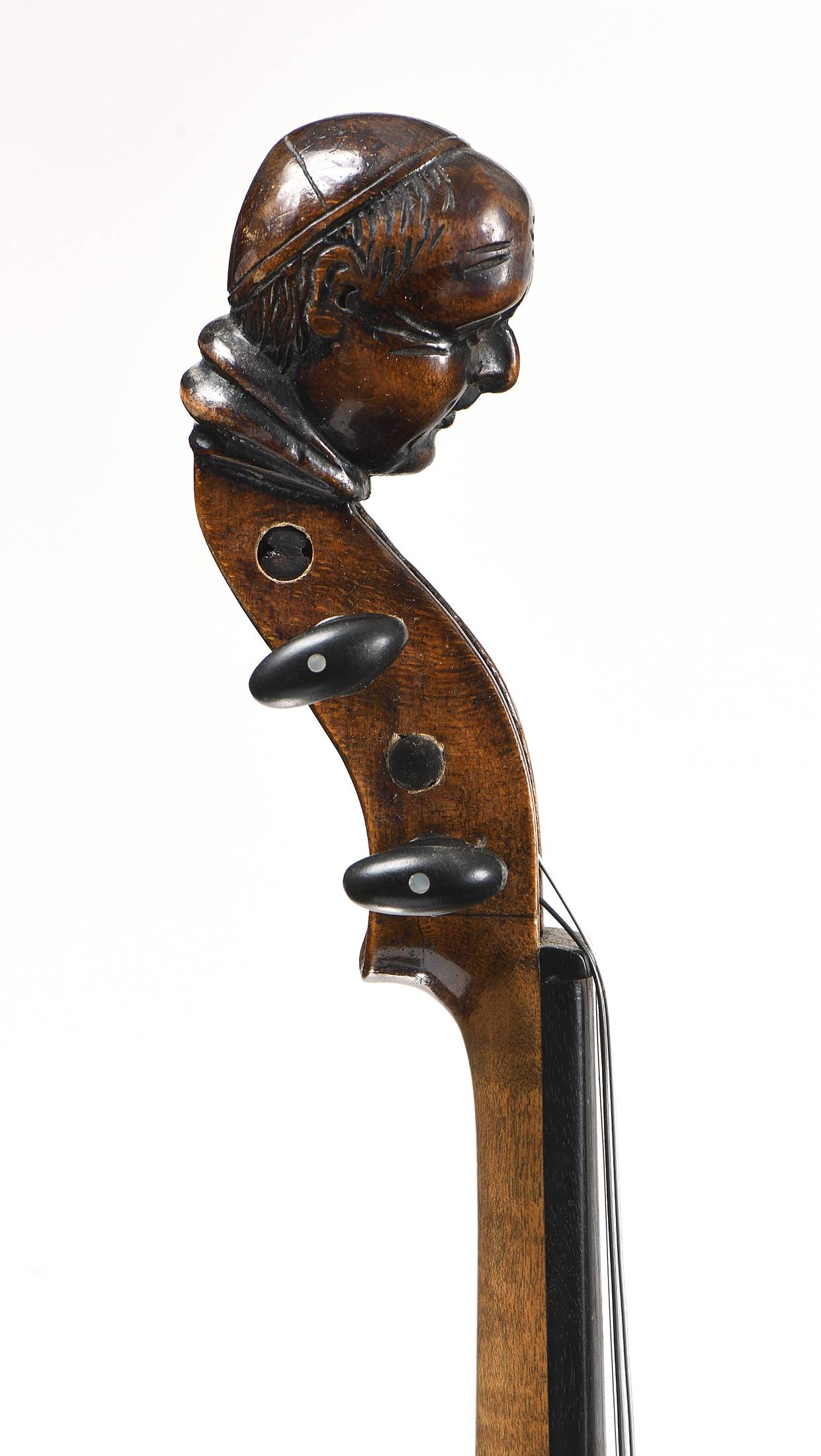 portant une étiquette abimée "Jacobus Stainer in Ablam...16". Fond d'une pièce en érable. Vernis brun doré. Tête sculptée d'un prêtre joufflu. 356 mm. Avec boite et archet.