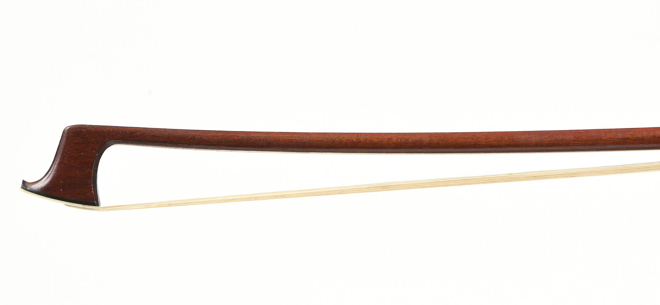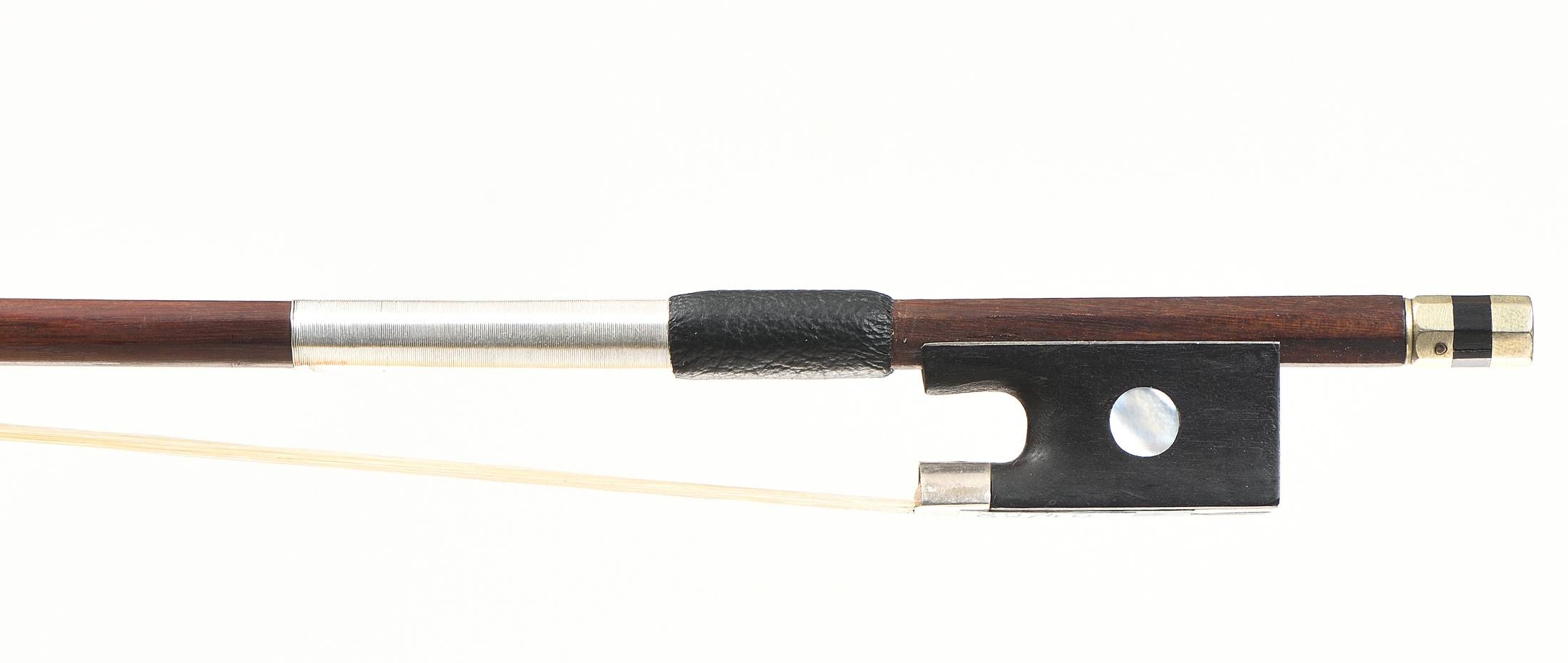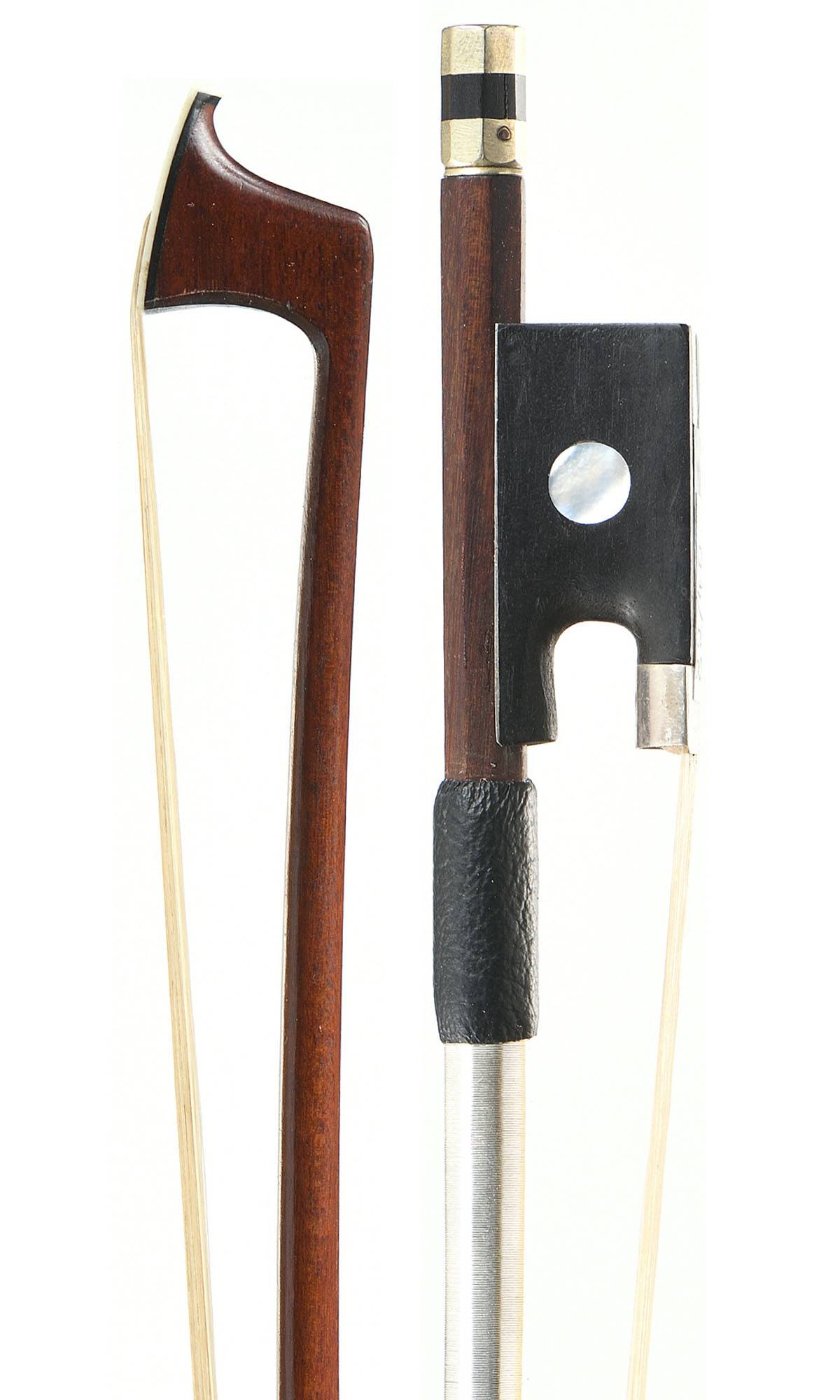 Baguette ronde en bois de pernambouc. Hausse en bois d'ébène, faite en copie, monté argent. Bouton d'un autre auteur. 724 mm. 60 g.