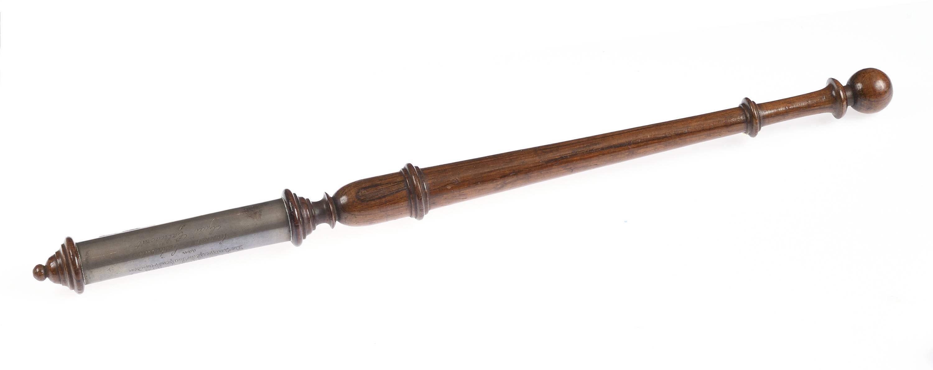 En bois de palissandre et manche en métal argenté et gravé "De Zangmaatschappy De Ontwerpshe Rubensvrienden aan hunnen bestuwerder Guil Galliaerdt".