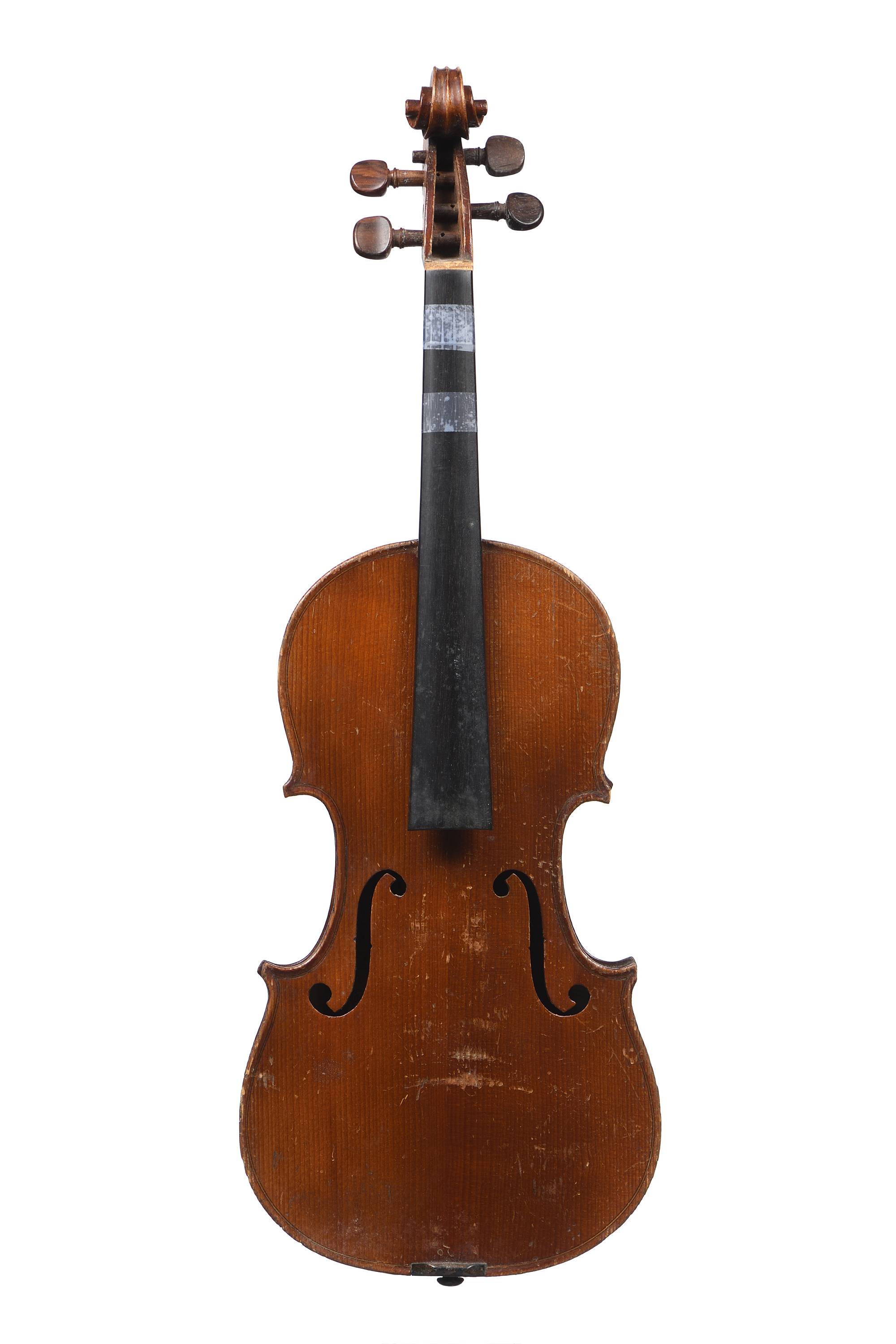 portant une étiquette "Copie de Antonius Stradivarius...". Fond de deux pièces en érable. Vernis brun doré. Avec boite et archet d'étude. 357 mm.