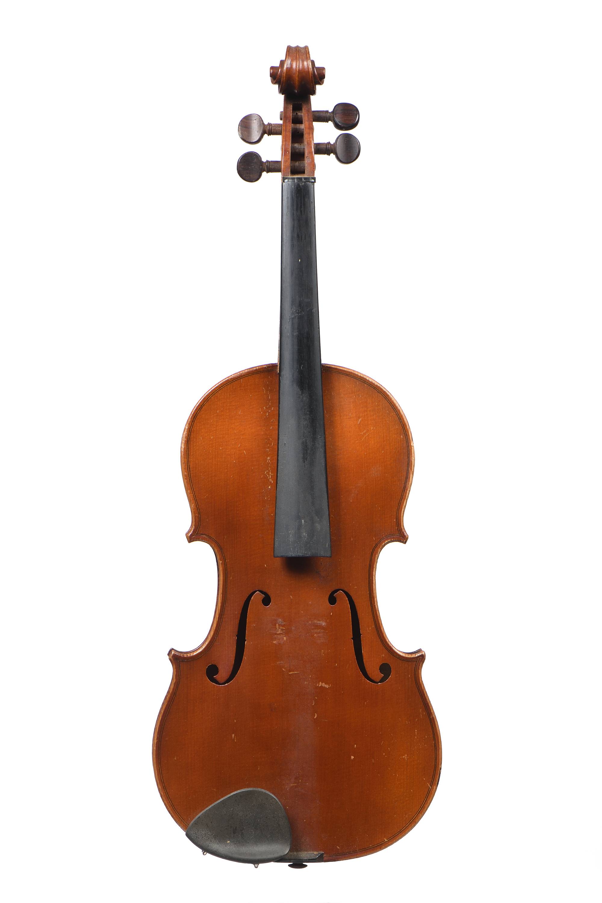 portant une étiquette abimée "Joseph Guarnerius...". Fond de deux pièces en érable. Vernis brun orangé sur fond doré. Avec boite et archet d'étude.