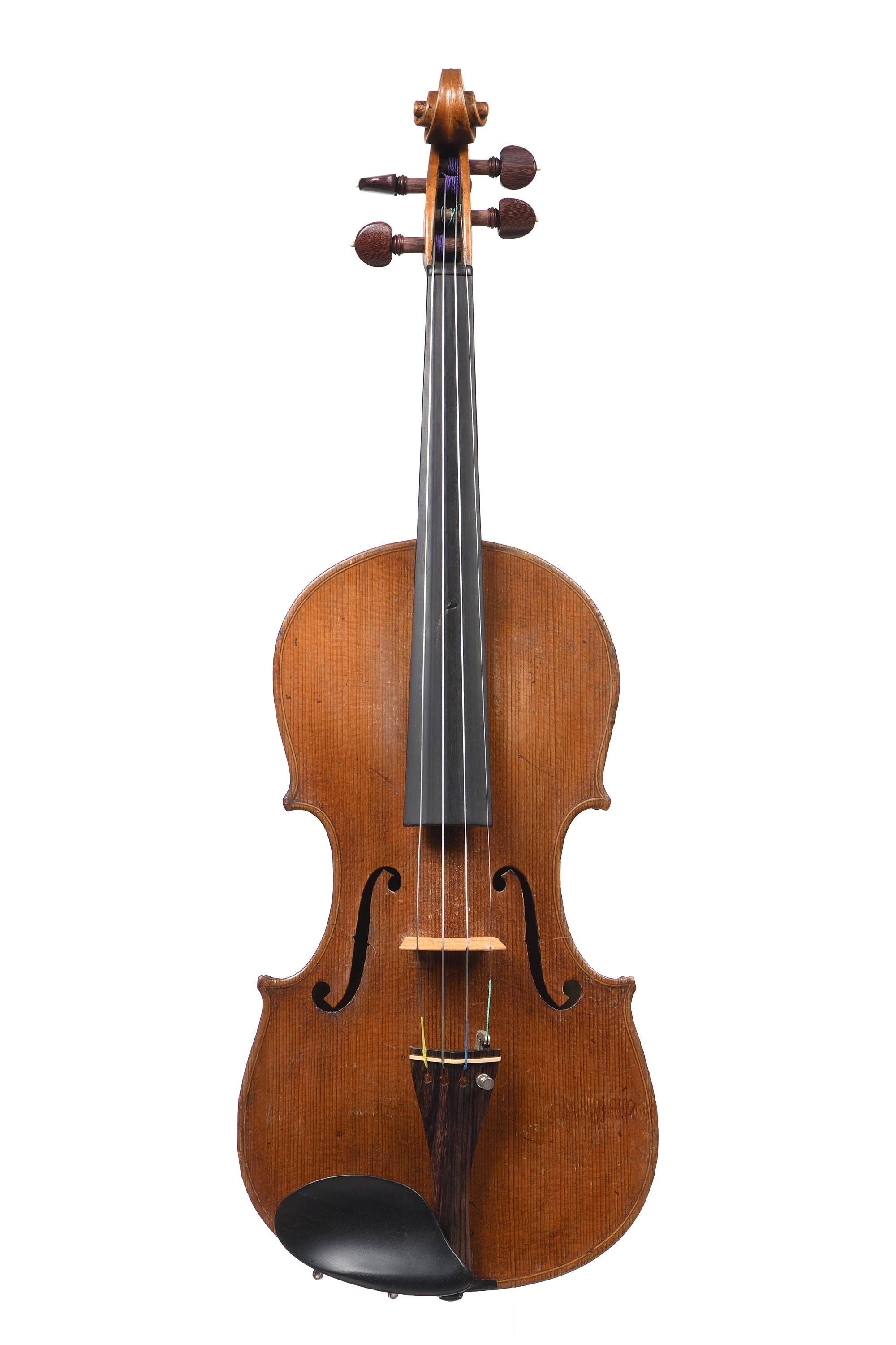 portant une étiquette " Francesco Ruggeiri detto il per Cremona 1673". Fond d'une pièce en érable sans onde. Vernis brun orangé sur fond doré. Avec boite. 358 mm.