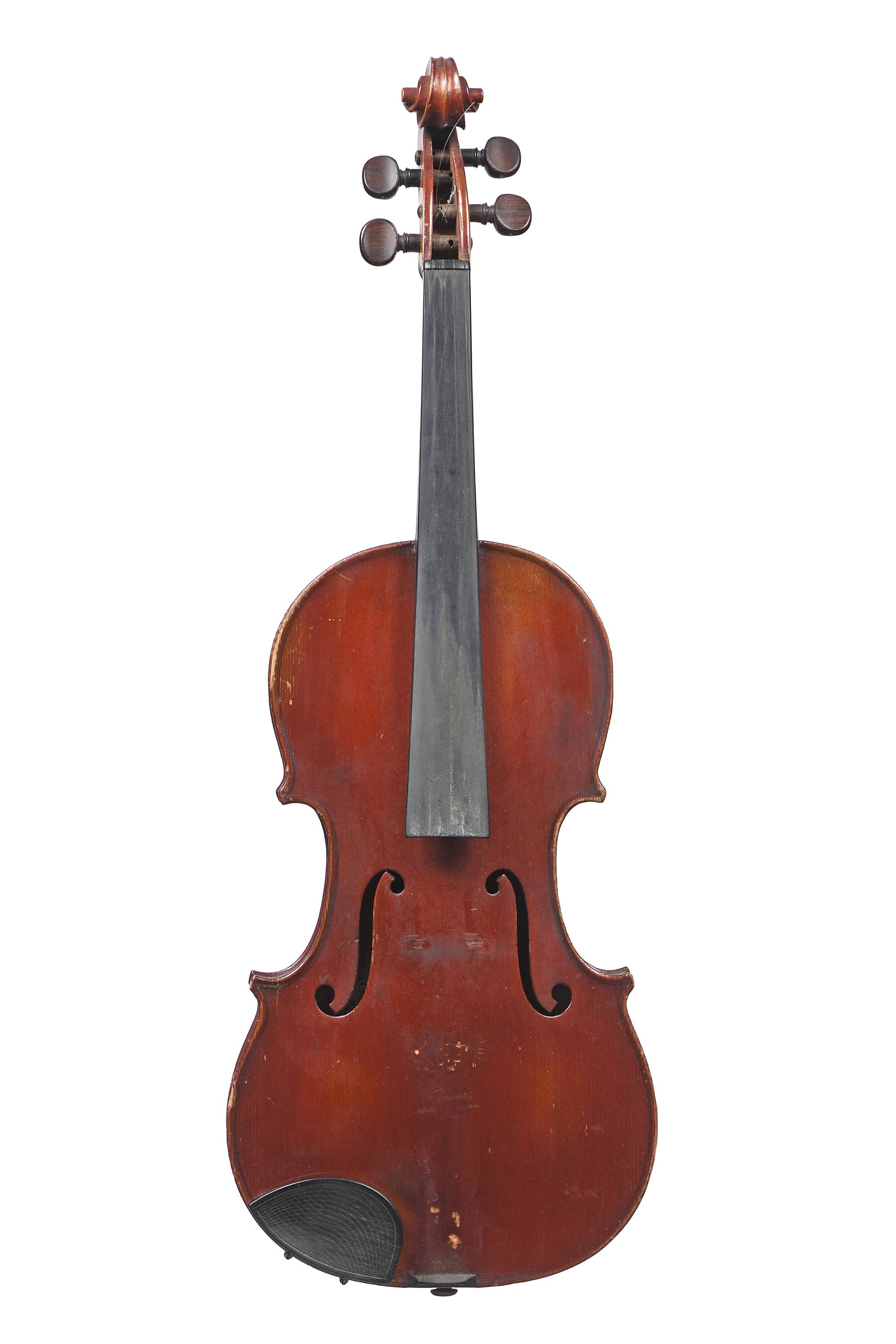 portant une étiquette "Modèle d'après Antonius Stradivarius... 1721". Fond de deux pièces en érable. Vernis brun rouge. 357 mm. Avec archet d'étude.