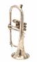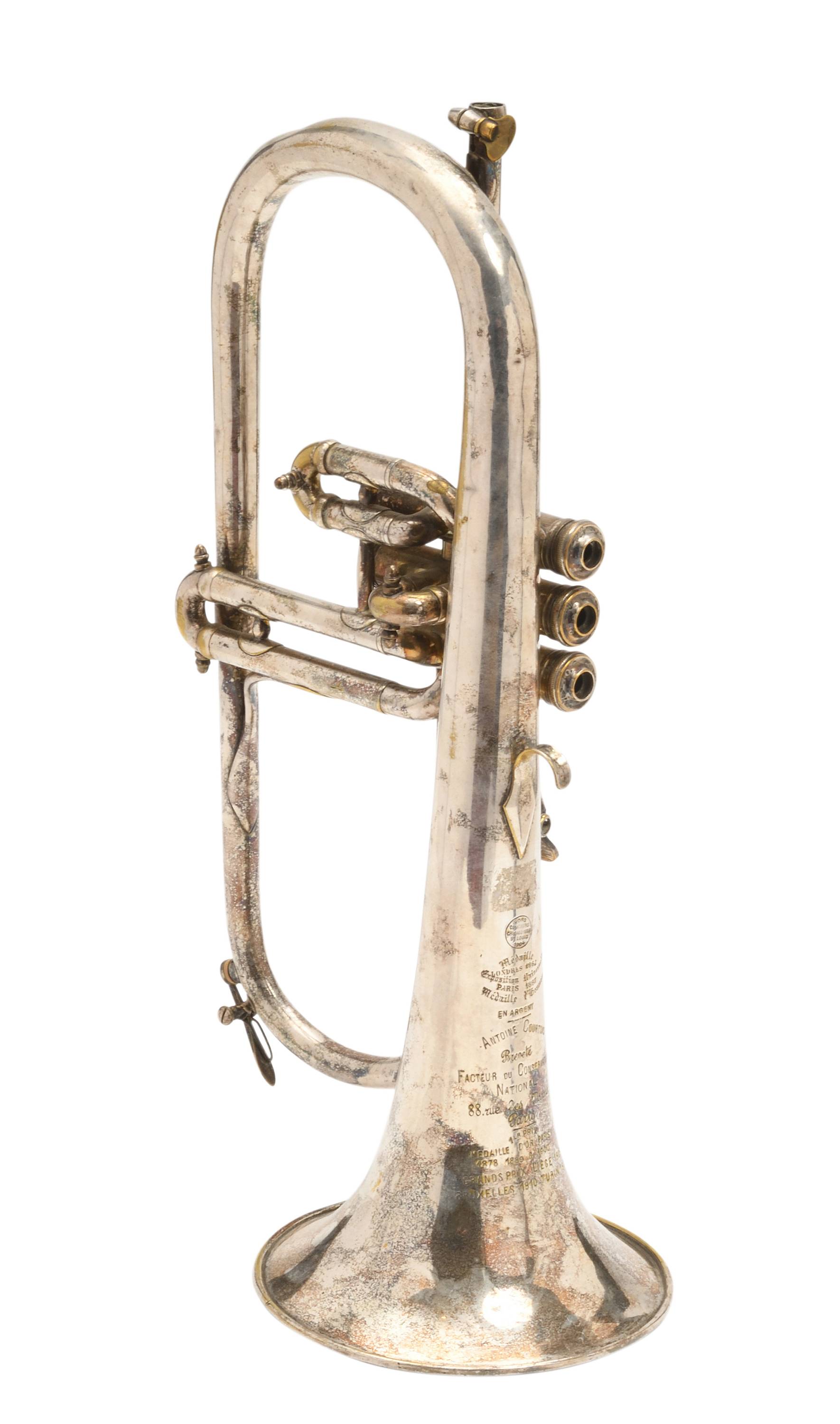 Bugle en métal argenté par Antoine COURTOIS, dont il porte la marque "Antoine COURTOIS Breveté...". Trois pistons manquant. Numéros 6 5 4 et 764 sur les pistons.