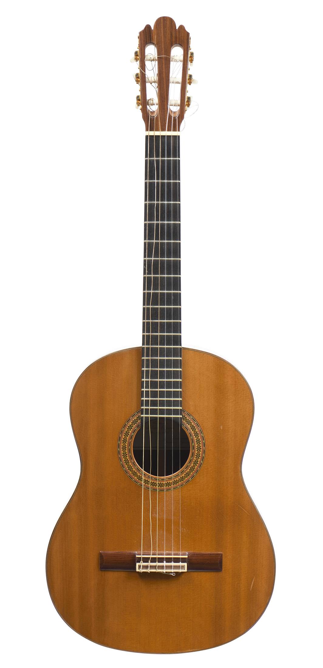 Intéressante guitare, portant une étiquette "Julian Espinosa. 1980. Cuenca. Espana." et la signature au stylo. Fond de deux pièces en palissandres. Eclisses du même bois. Table en red cedar. Petite cassure au fond recollée. Avec boite moderne.
