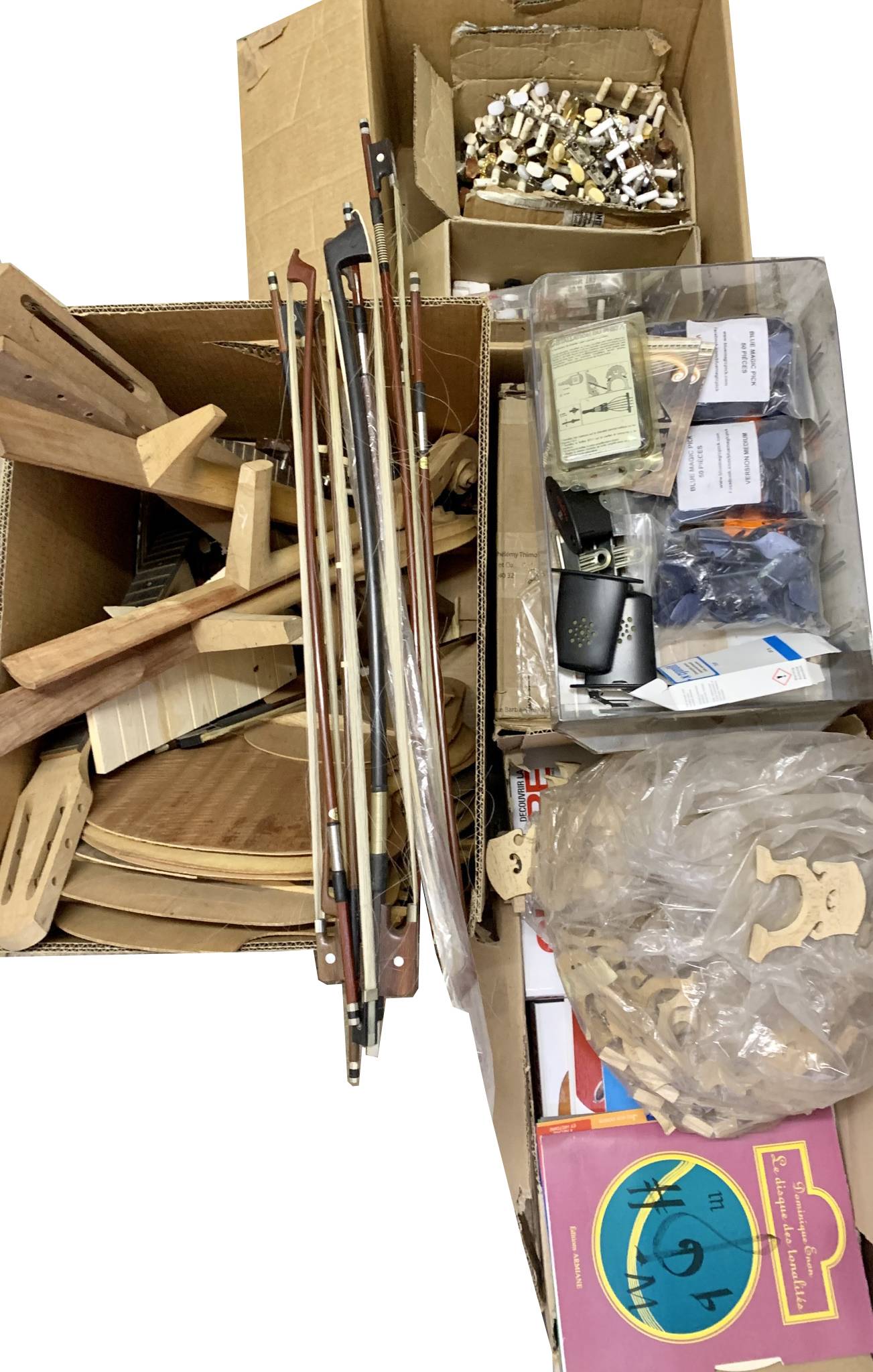 Mécaniques, cordes, manches, pièce détachées, méthode de guitare, archets de violon d'étude divers.