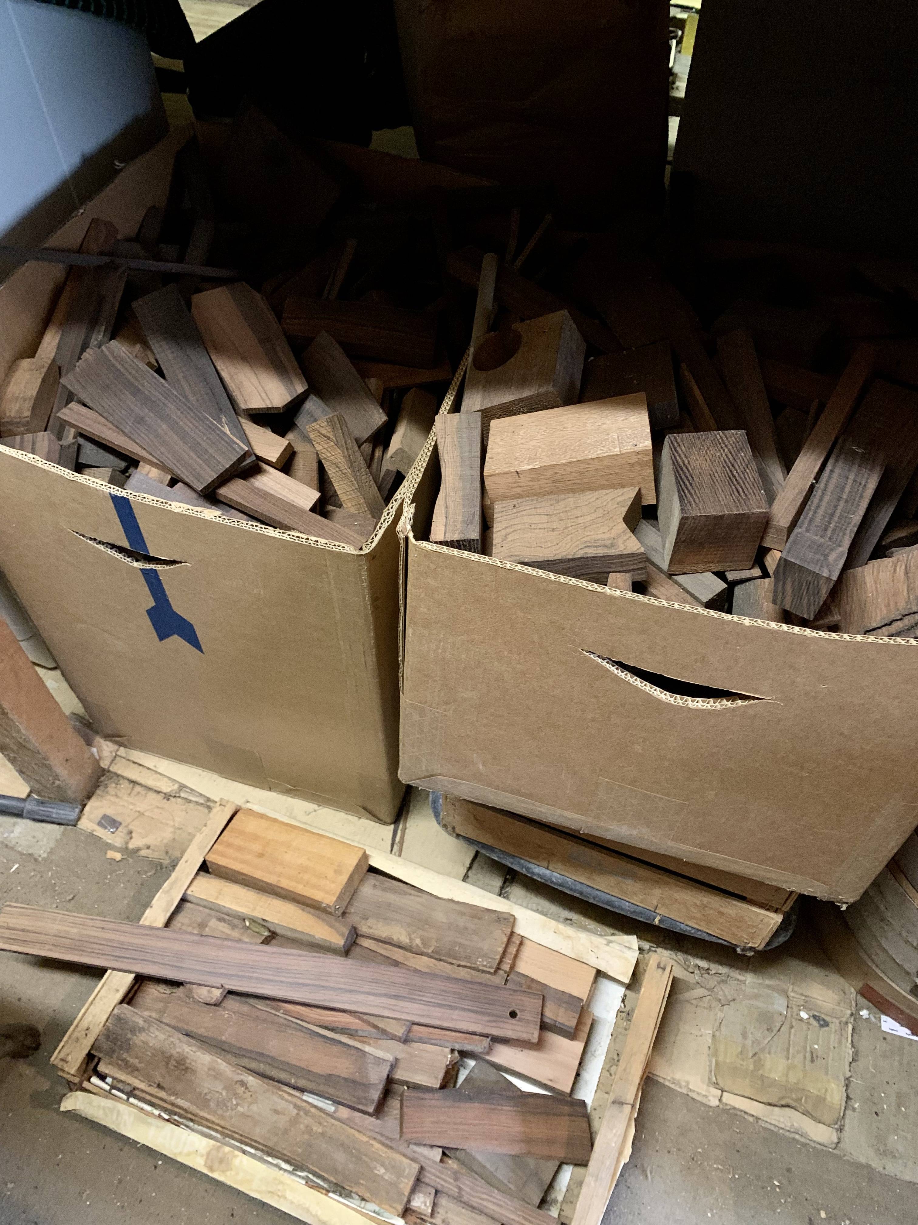 Important ensemble de chutes de bois. Deux cartons remplis de bois exotiques divers.