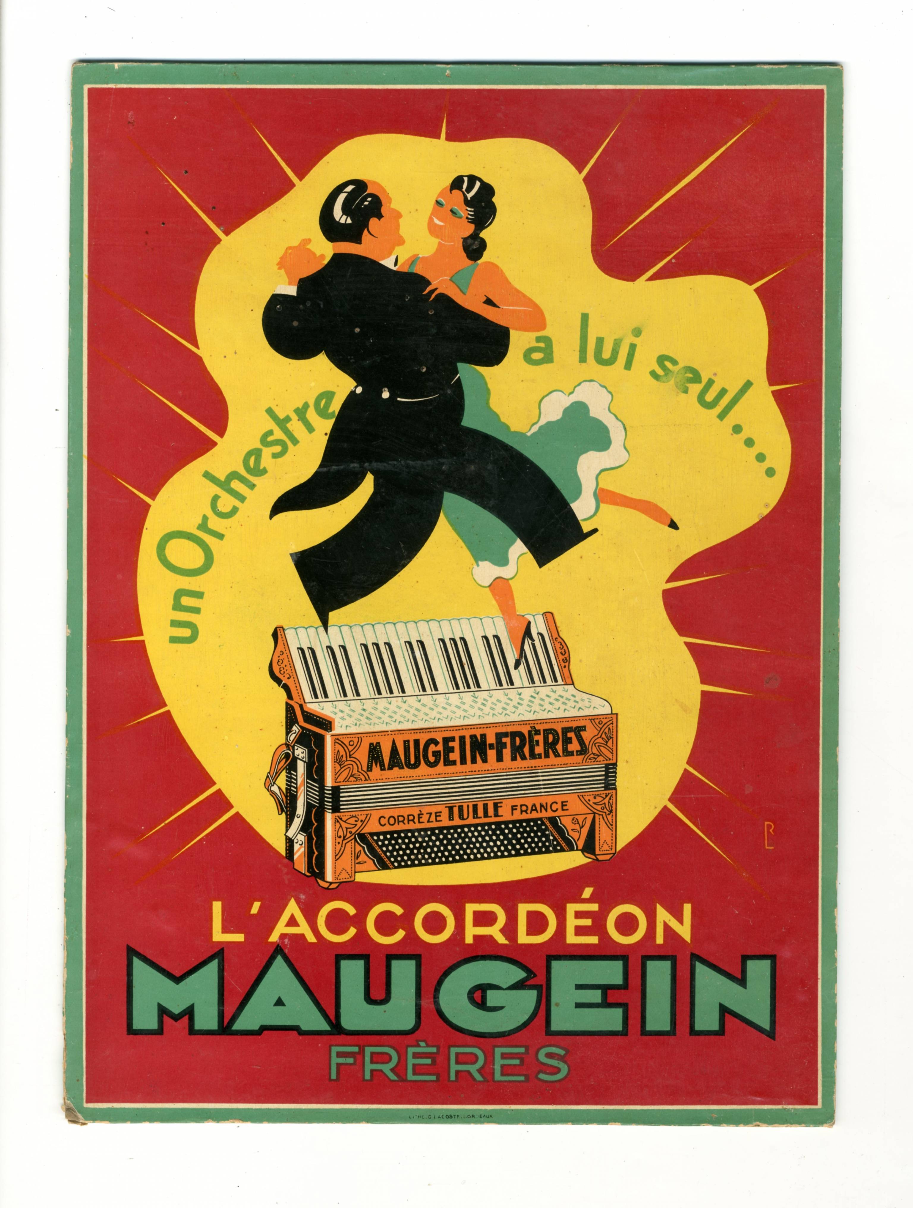 "Un Orchestre a lui seul. L'accordéon MAUGEIN Frères." Imp ... Lacoste Bordeaux. Monogramme dans la planche "RL". Usures.
