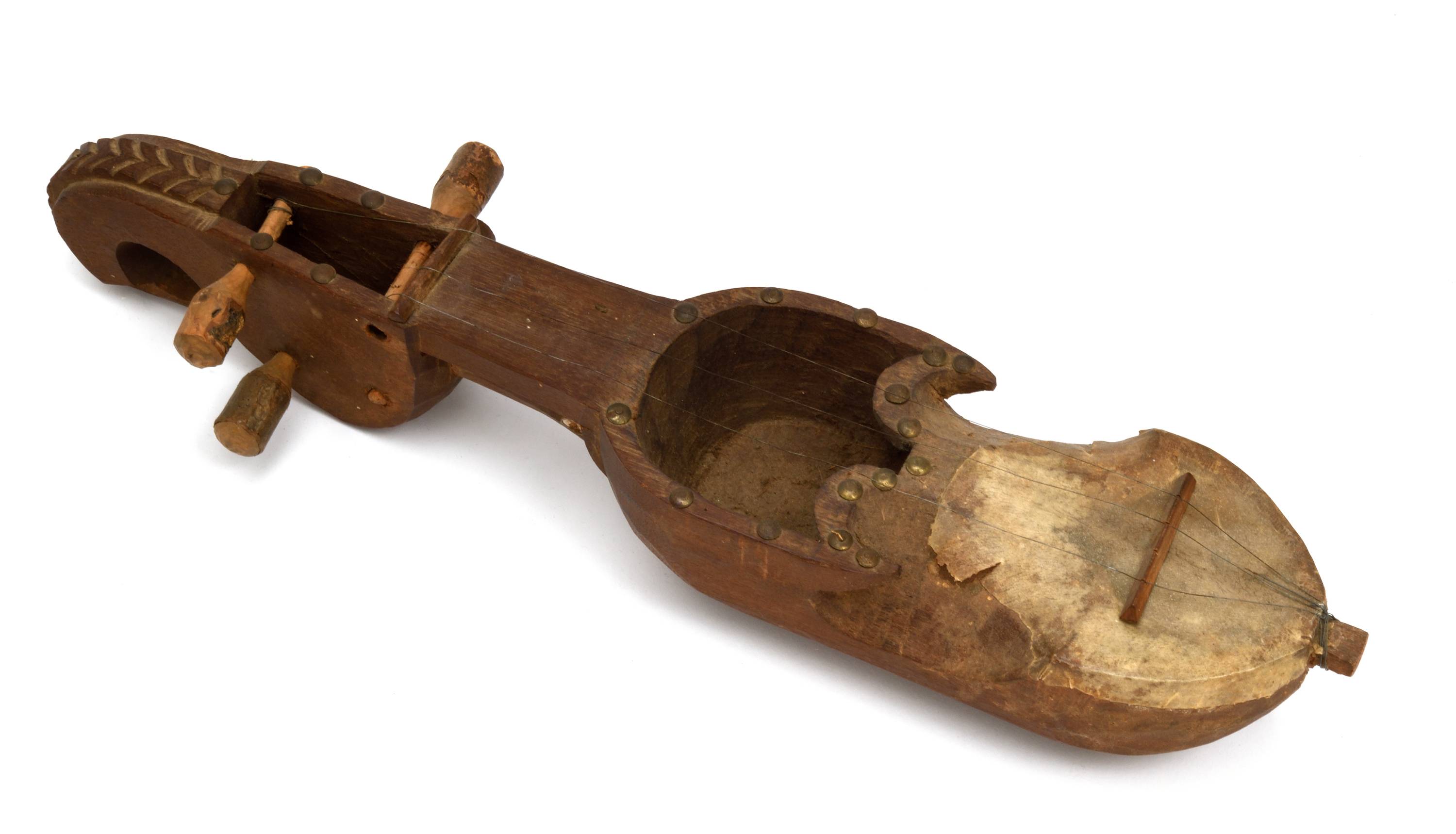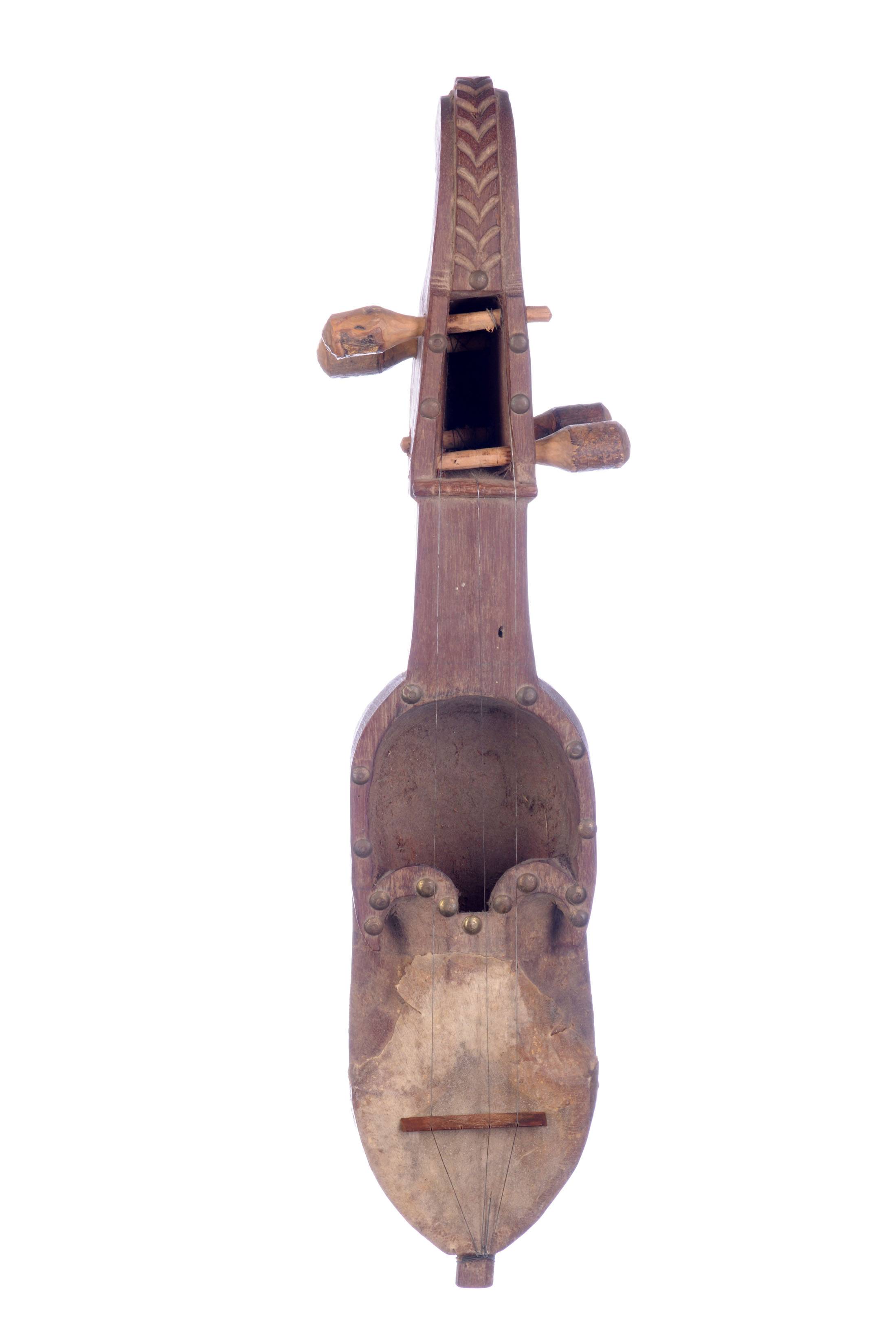 Petite viele Africaine en bois sculpté et peau. 4 cordes.