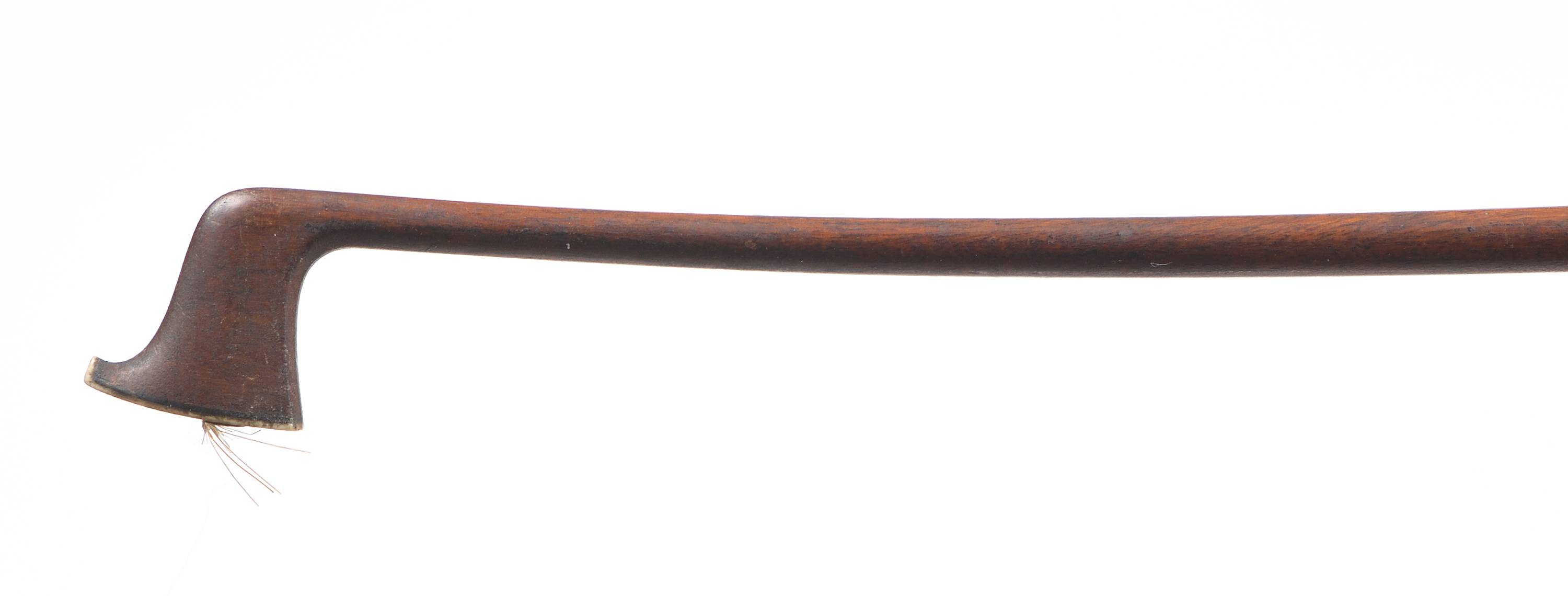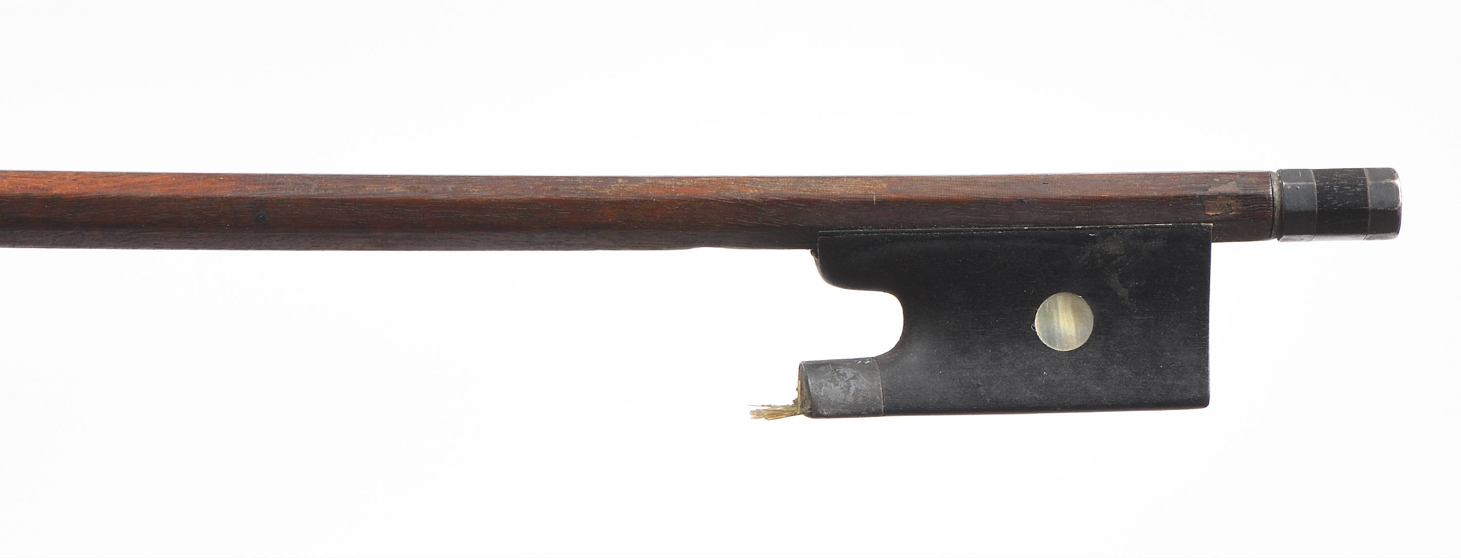 Baguette ronde en bois de pernambouc. Hausse ébène, monté argent. 728 mm. 49 g sans mèche ni garniture.