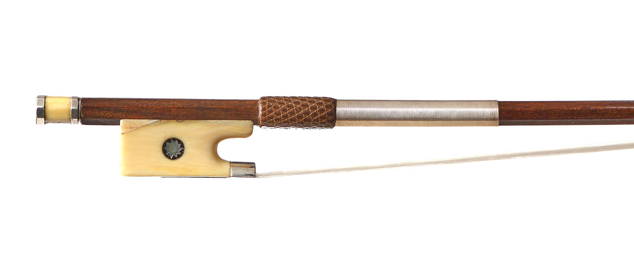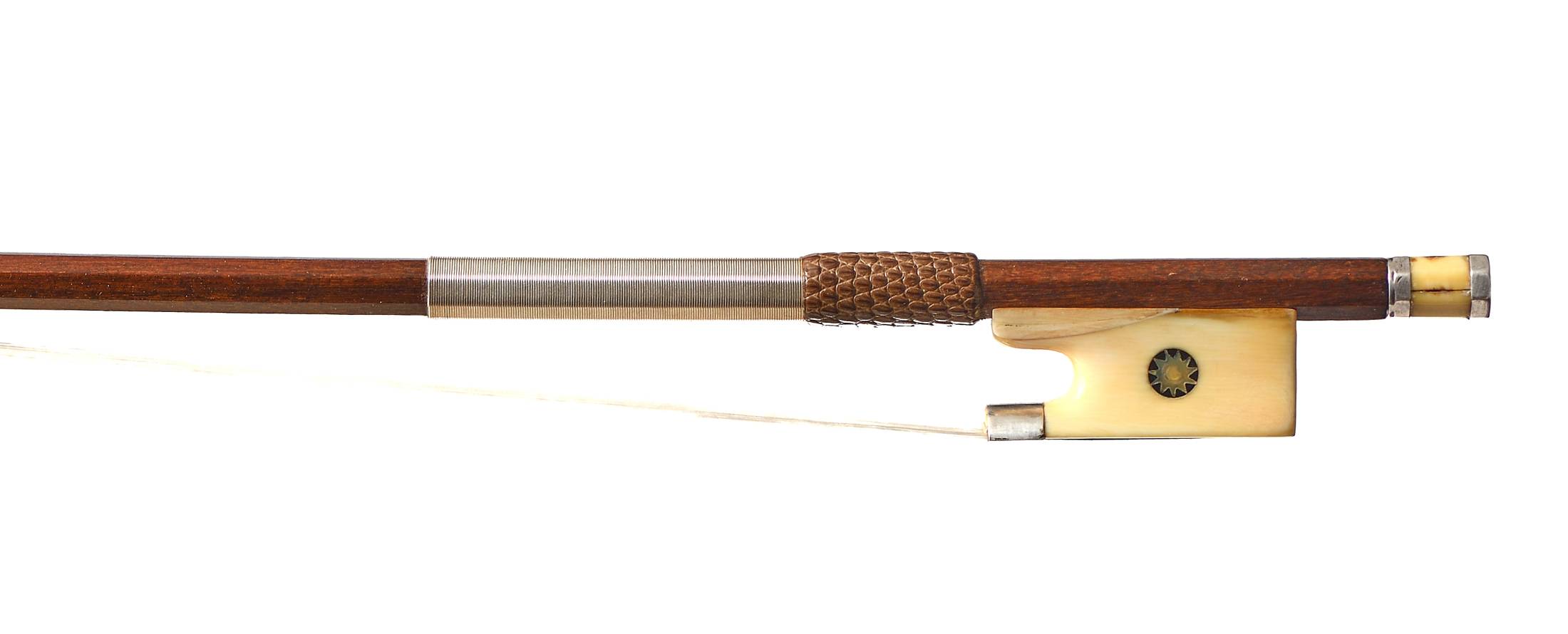 Exceptionnel archet fait vers 1830. Baguette octogonale en bois de pernambouc. Hausse montée argent, avec grain en étoile. Avec certificat d'authenticité de Pierre GUILLAUME. 60g. 731 mm.