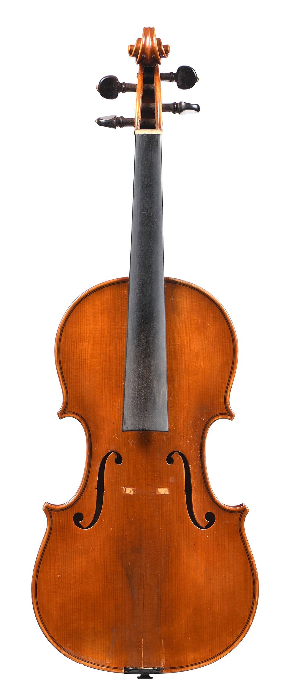 Intéressant violon de Demey portant l'étiquette manuscrite à la plume "Marcel Demey, Luthier à Lille.N°15 1943" et trois marques au fer à l'intérieure. Fond de deux pièces. Vernis brun orangé sur fond doré.358 mm.
