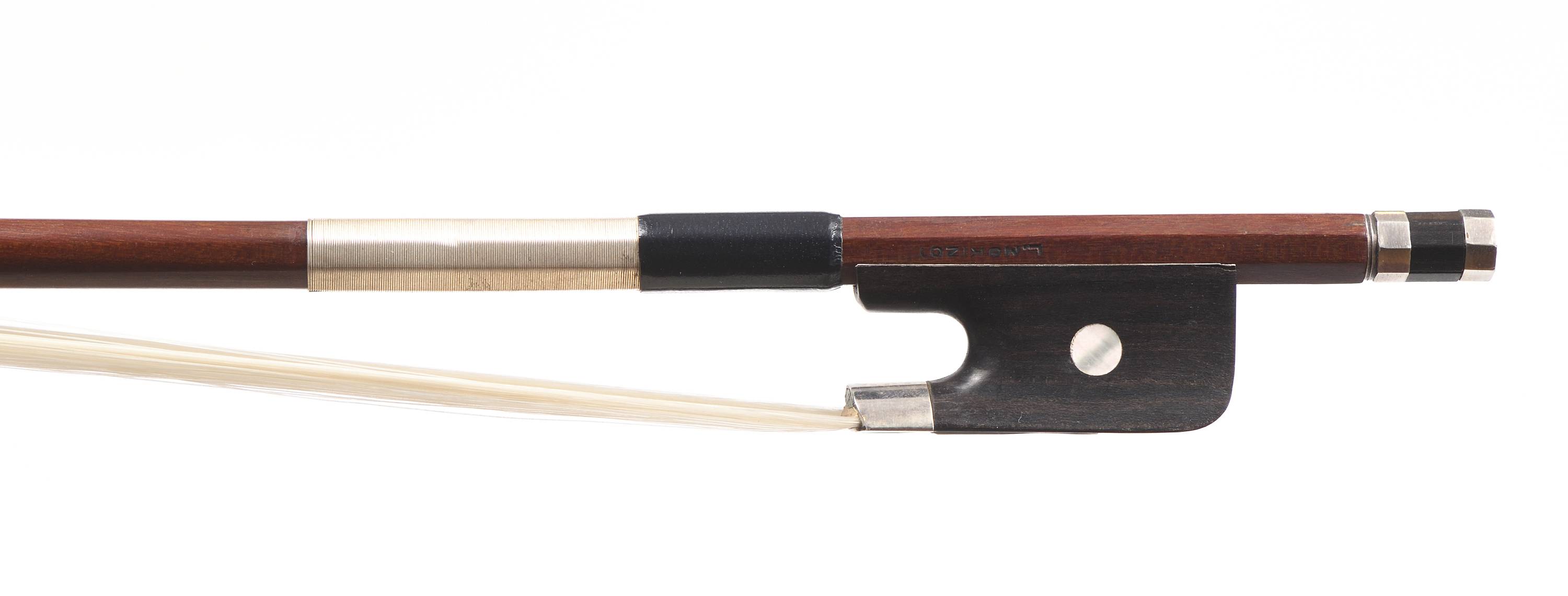 portant la marque au fer "L.MORIZOT". Baguette ronde en bois de pernambouc. Hausse ébène monté argent. Petite restauration à la pointe de la tête. Fait vers 1950. 693 mm. 79 g.